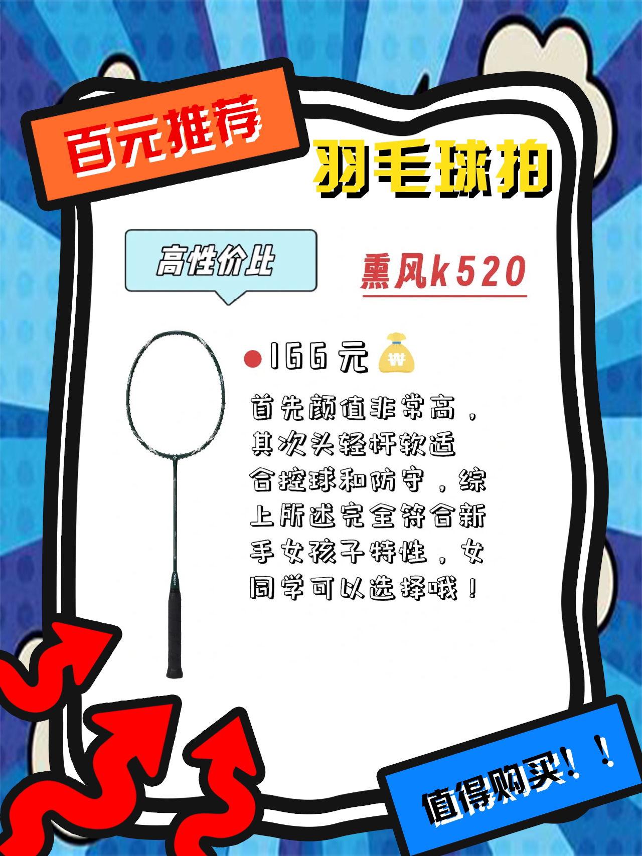 在今天推荐前,有三件事必须要跟大家讲清楚! 🈲️⚠️不要买超市对拍,更不要买材质是铝合金的对拍! 🈲️⚠️不要买超市对拍,更不要买材质是铝合金的对拍! 🈲️⚠️不要买超市对拍,更不要买材质是铝合金的对拍! 下面给大家推荐几个不同品牌百元价位的球拍选择(完全满足新手小白的很多练球的需求 1⃣️薰风k520系列:💰166 首先颜值非常高,其次头轻杆软适合控球和防守,综上所述完全符合新手女孩子...