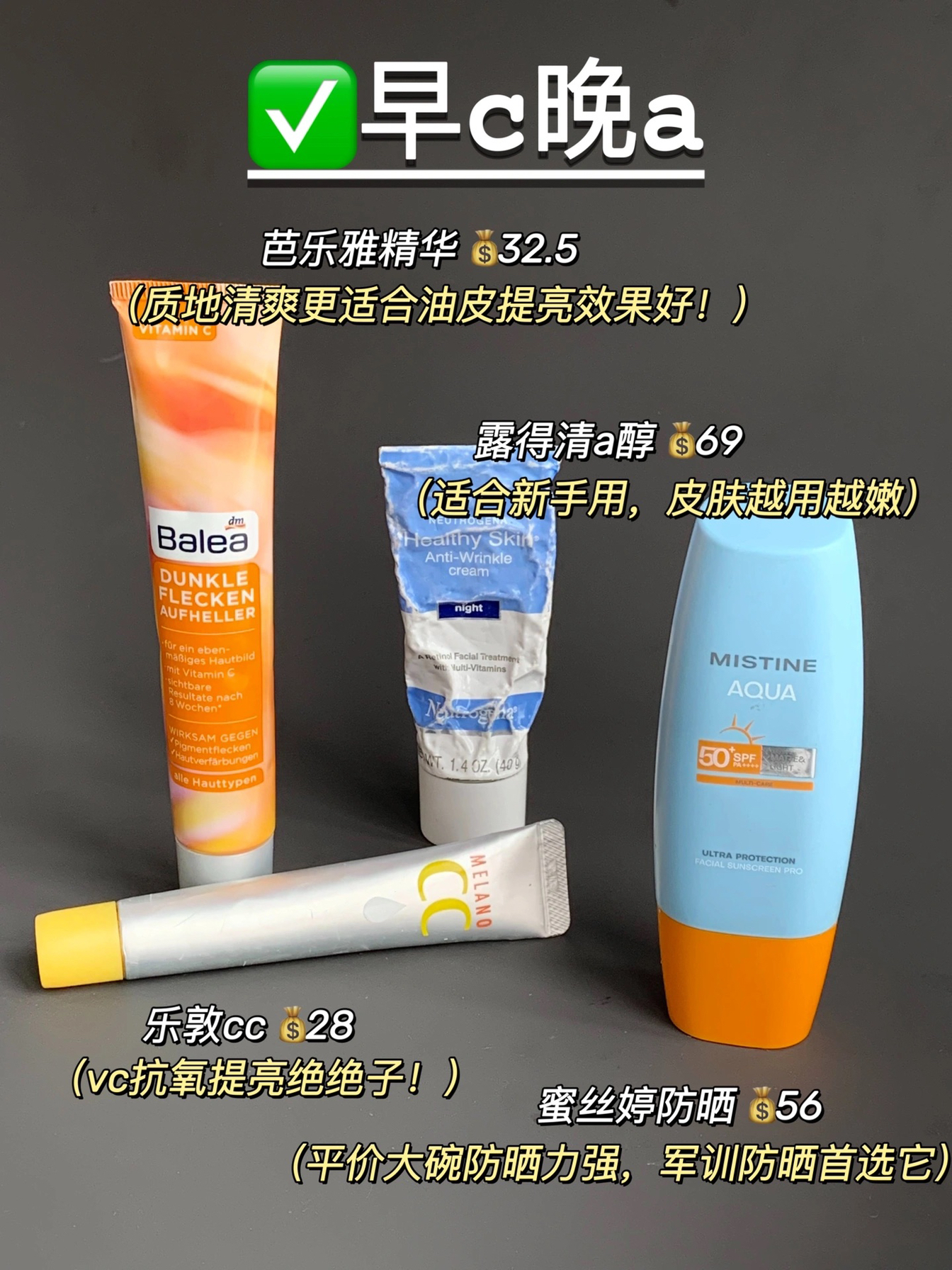 皮肤变好的快乐是早c晚a给的!天知道我之前皮肤有多差,满脸油光+反复冒痘+满额头的闭口,全靠跟着小红书的朋友们学早c晚a护肤,才一个月皮肤就变好很多,下面是我用到的一些护肤品,主打平价实用,有需要的可以参考一下! - 🐛乐敦cc|芭乐雅精华 早c最多人用的是乐敦cc,但我油皮上脸觉得太油了容易闷痘,所以换了这个芭乐雅精华,同样主打VC,抗氧提亮一点不差而且质地更清爽,用一个多星期皮肤就透亮了不少 ...