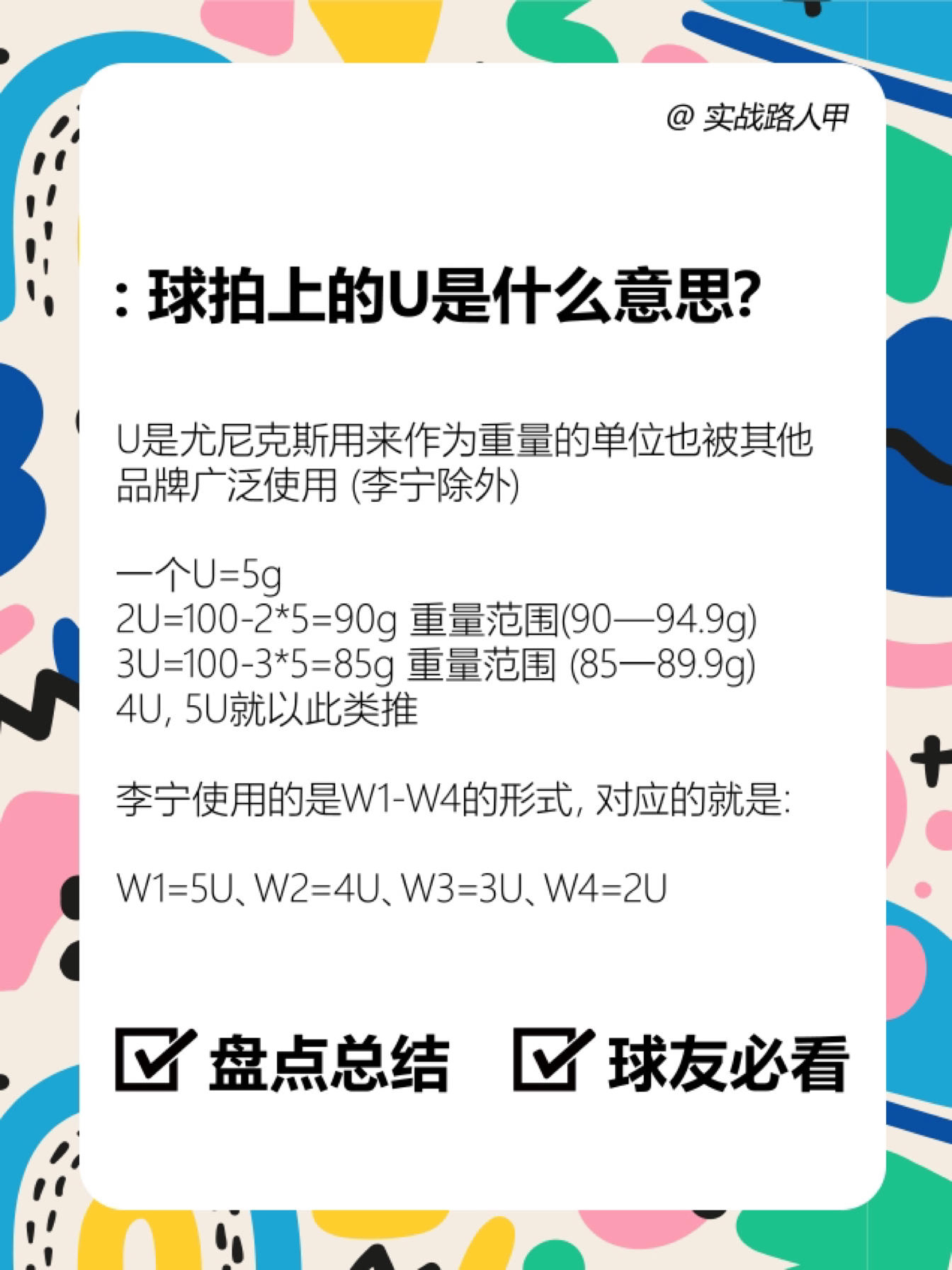 💁羽毛球拍的参数天花乱坠?从而不知道如何选购羽毛球拍?今日份科普带你一文读懂羽毛球拍参数! 1️⃣球拍上的U是什么意思? U是尤尼克斯用来作为重量的单位也被其他品牌广泛使用(李宁除外) 一个U=5g 2U=100-2*5=90g重量范围(90—94.9g) 3U=100-3*5=85g重量范围(85—89.9g) 4U,5U就以此类推 李宁使用的是W1-W4的形式 大概对应的就是W1=5U,W2...