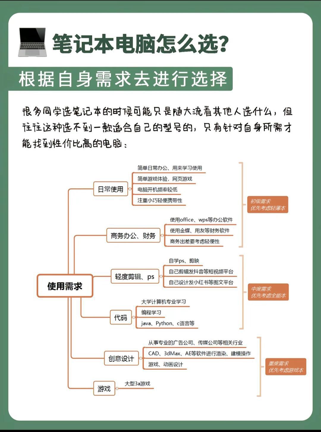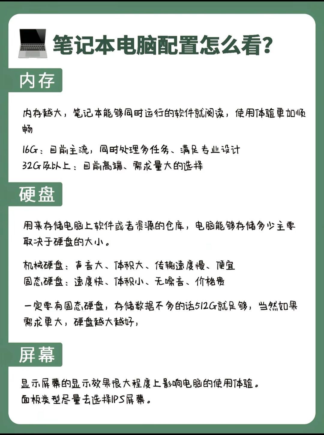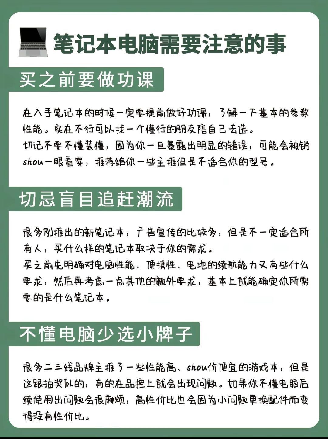 哈喽小伙伴们,今天跟大家聊聊新手如何去选择适合自己的笔记本电脑呀~ 🌟明确自己需求和预算 🌟选好配置和品牌 . 💻入手笔记本电脑前要做好攻略,避免被骗 💻切记盲目追求潮流型号 💻不了解笔记本电脑少选小众品牌 . 祝愿大家最后都能选到自己心仪的一款笔记本电脑呀✨✨ 喜欢不要忘记💖➕🌟