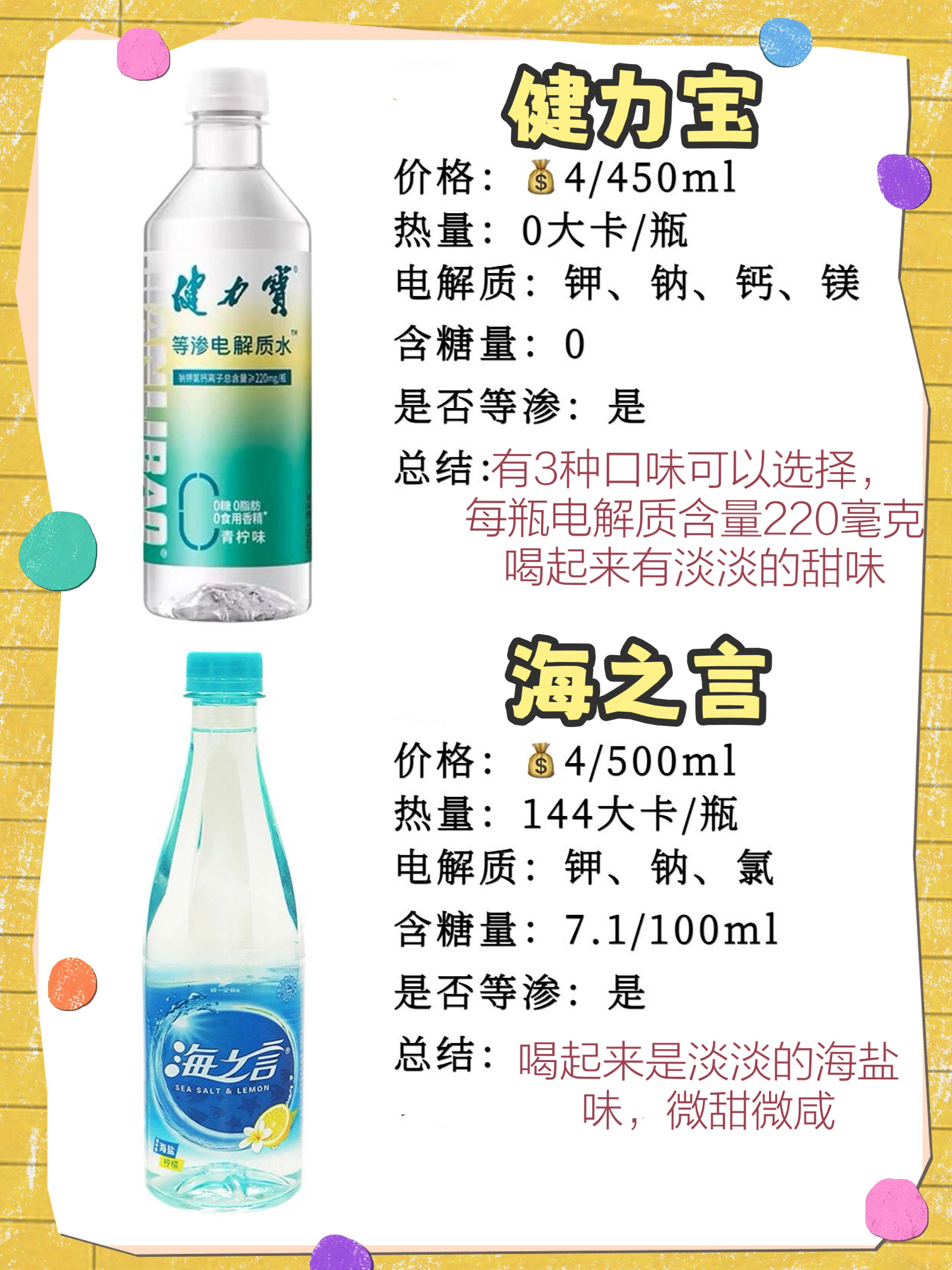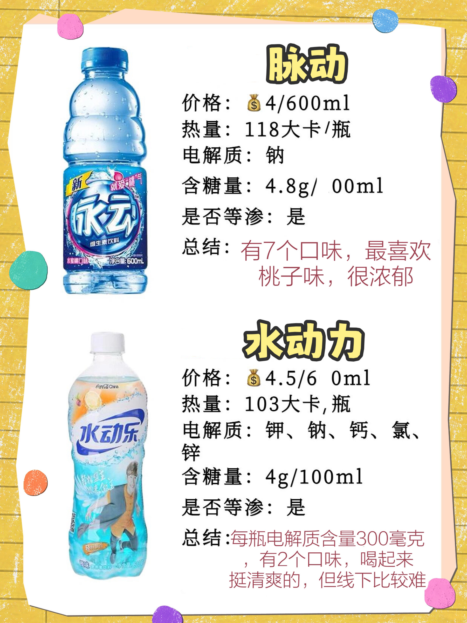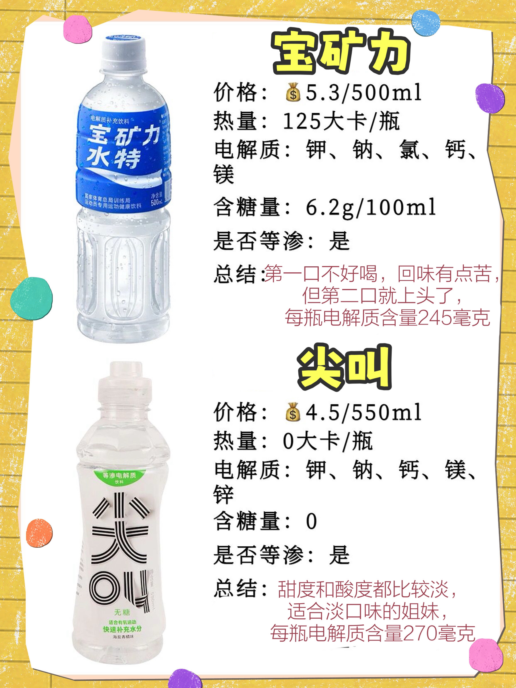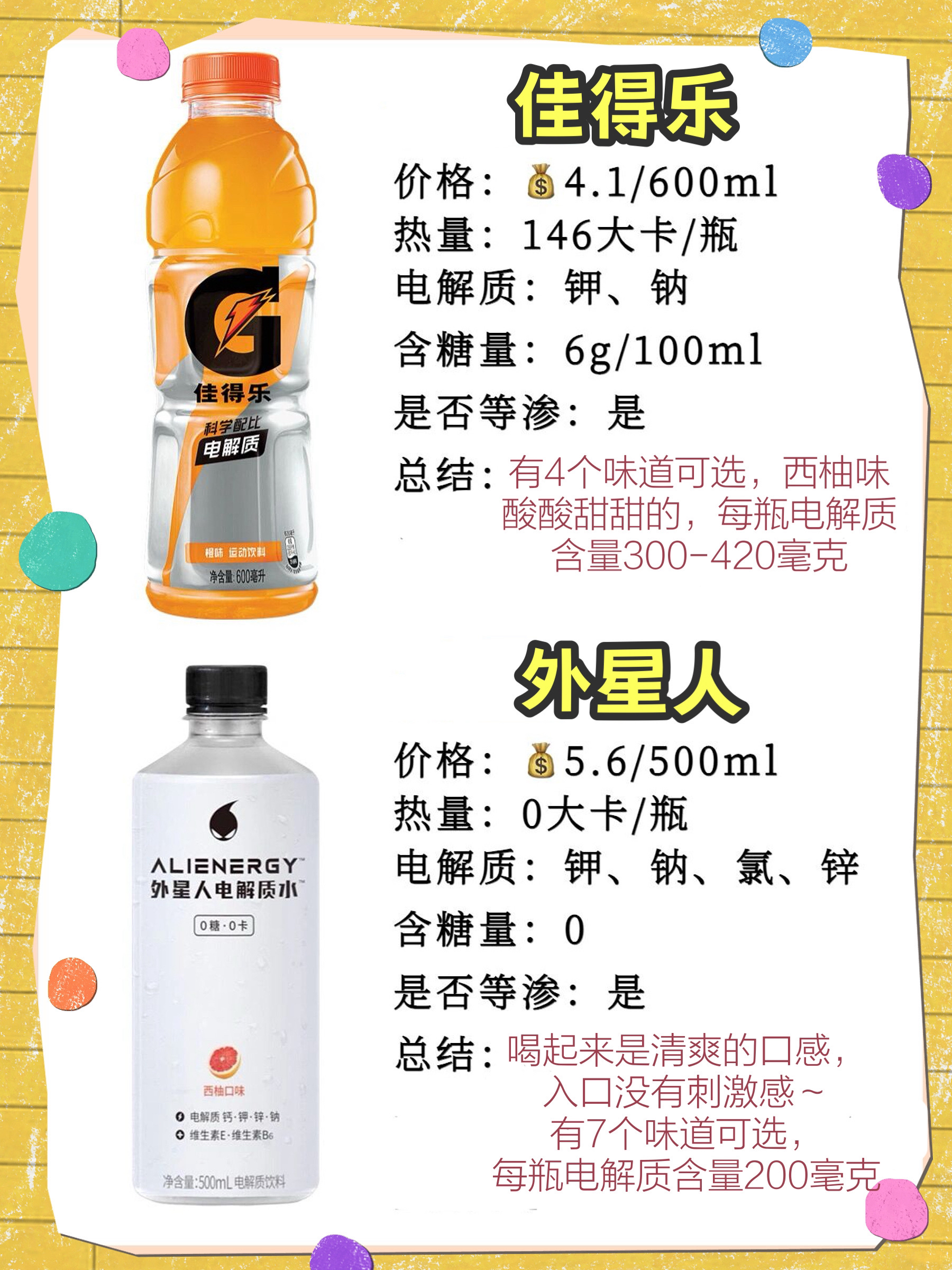 当今,电解质饮料越来越多,作为我们一些上班族,打球党一定要常备一些电解质饮料,那么哪些饮料比较适合我们去饮用呢❓ 1️⃣佳得乐,💰4.1/600ml,146大卡/瓶 总结:有4个味道可选,西柚味酸酸甜甜的,每瓶电解质含量300-420毫克 2️⃣外星人,💰5.6/500ml,0大卡/瓶 总结:喝起来是清爽的口感,入口没有刺激感~有7个味道可选, 每瓶电解质含量200毫克 3️⃣宝矿力水特,💰5.3...