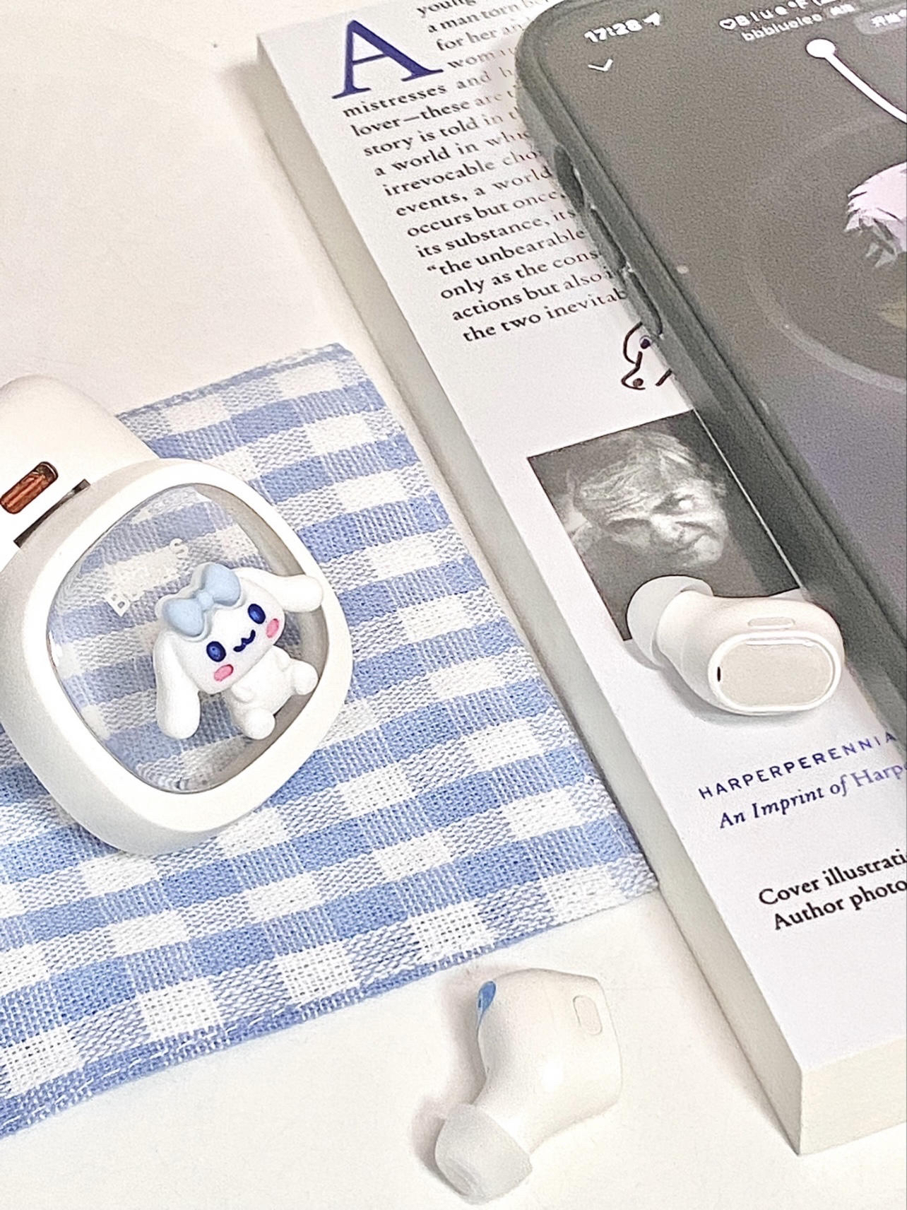 透明太空舱好特别噢~ 给它diy了一个玉桂狗! 这也太可爱了叭 音质跟续航都hin不错 佩戴也特别舒适 几杯奶茶的价钱就可以拿到! 学生党真的可以冲!