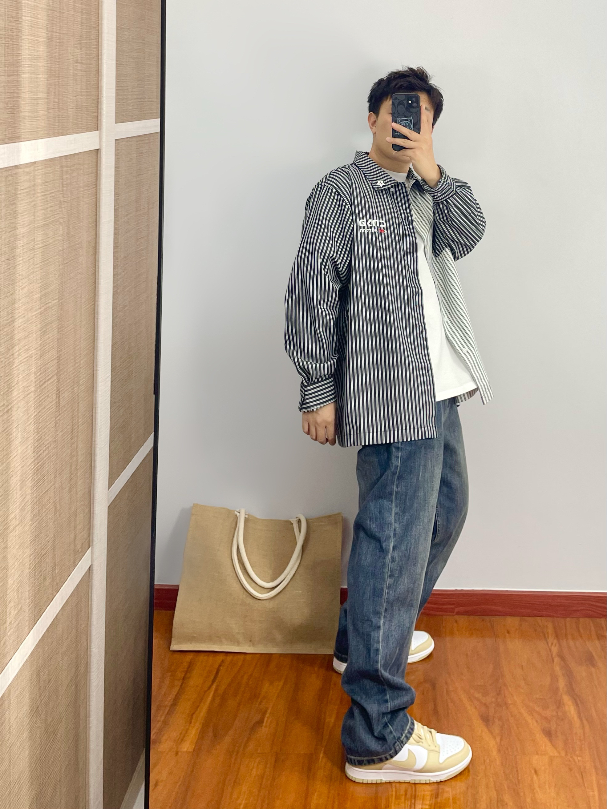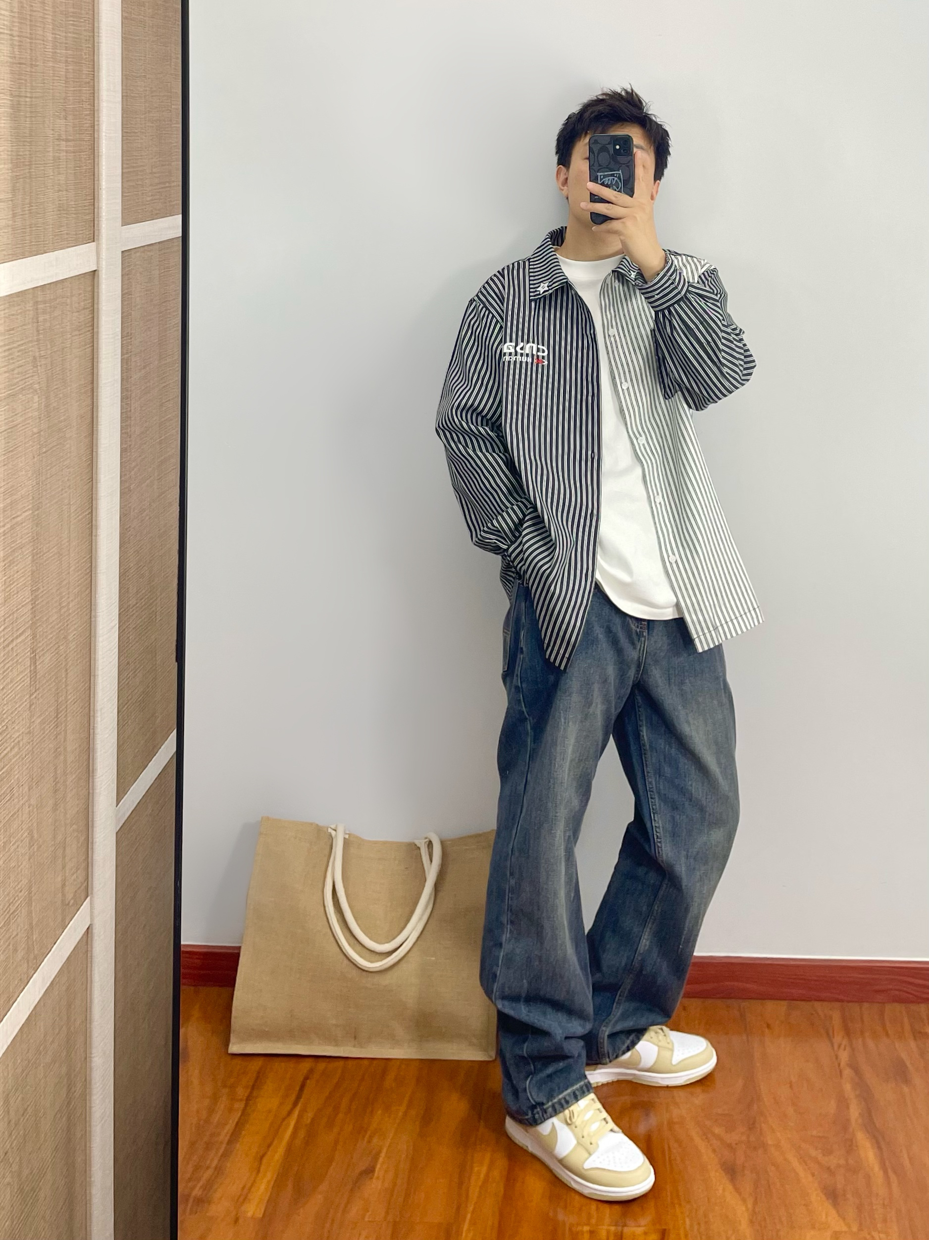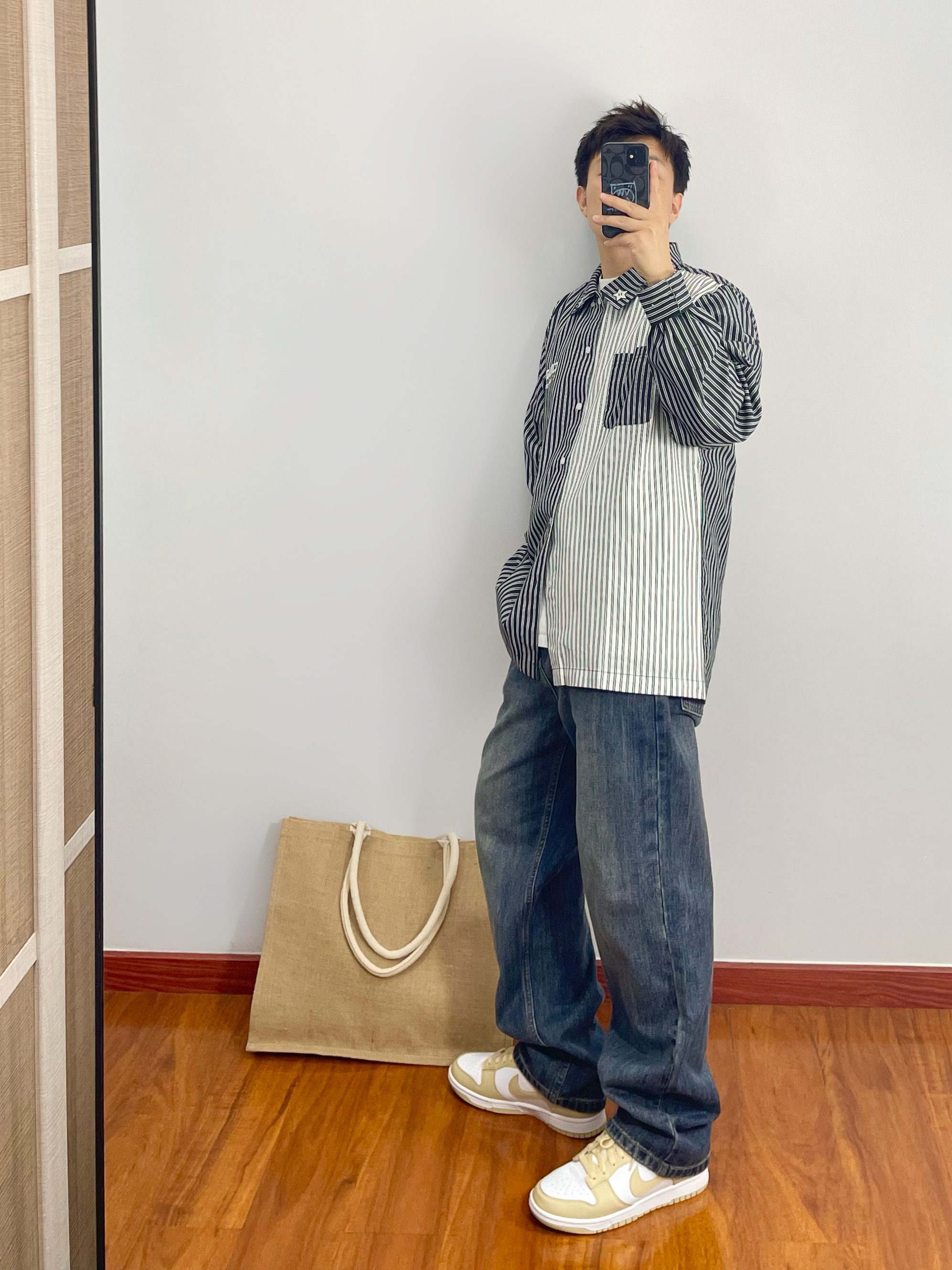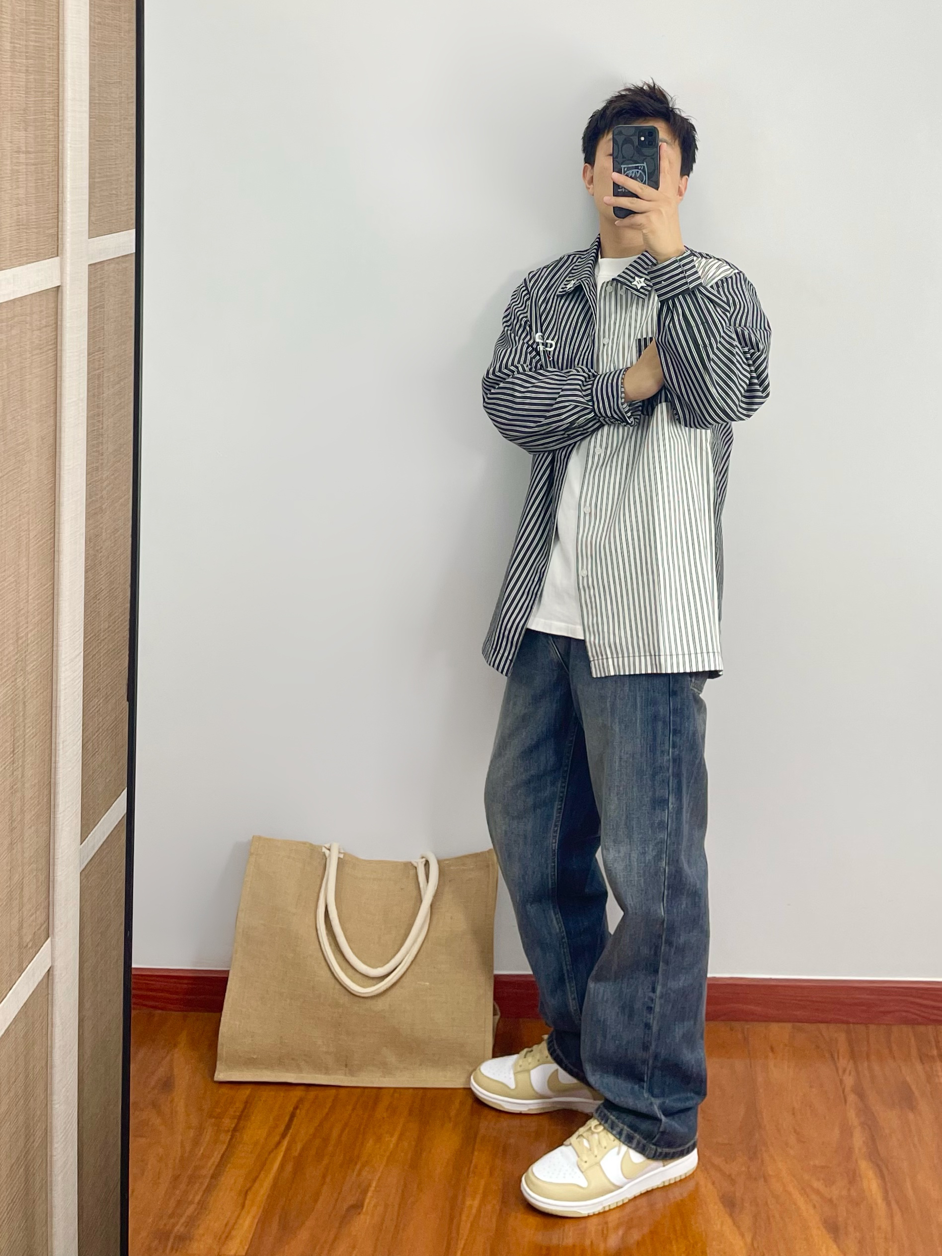👕: 拼色的竖条纹衬衫,初秋穿着正合适,可通勤也可日常搭配穿,衬衫爱好者少不了的条纹衬衫。 - 👖: 简约直筒的牛仔裤,水洗做旧的蓝色,直筒裤型可以增加视觉比例,穿着效果不错。 - 👟: 米黄色的dunk,简简单单好搭配。 - 170cm/67kg 分享男生的日常穿搭OOTD -