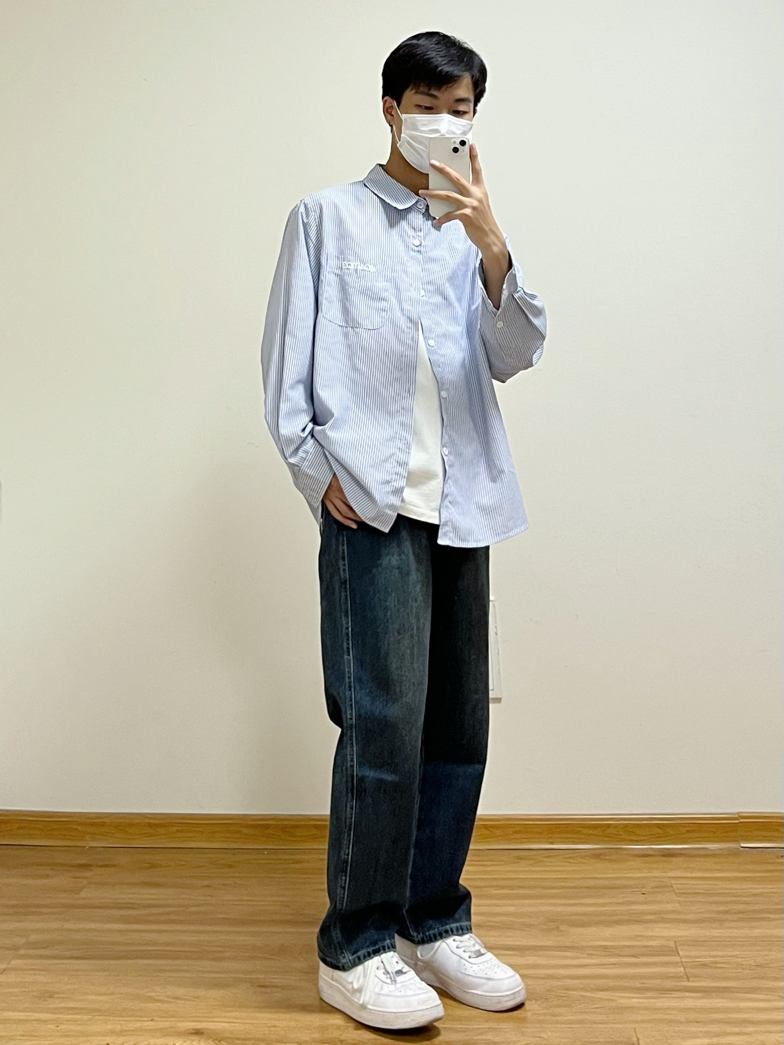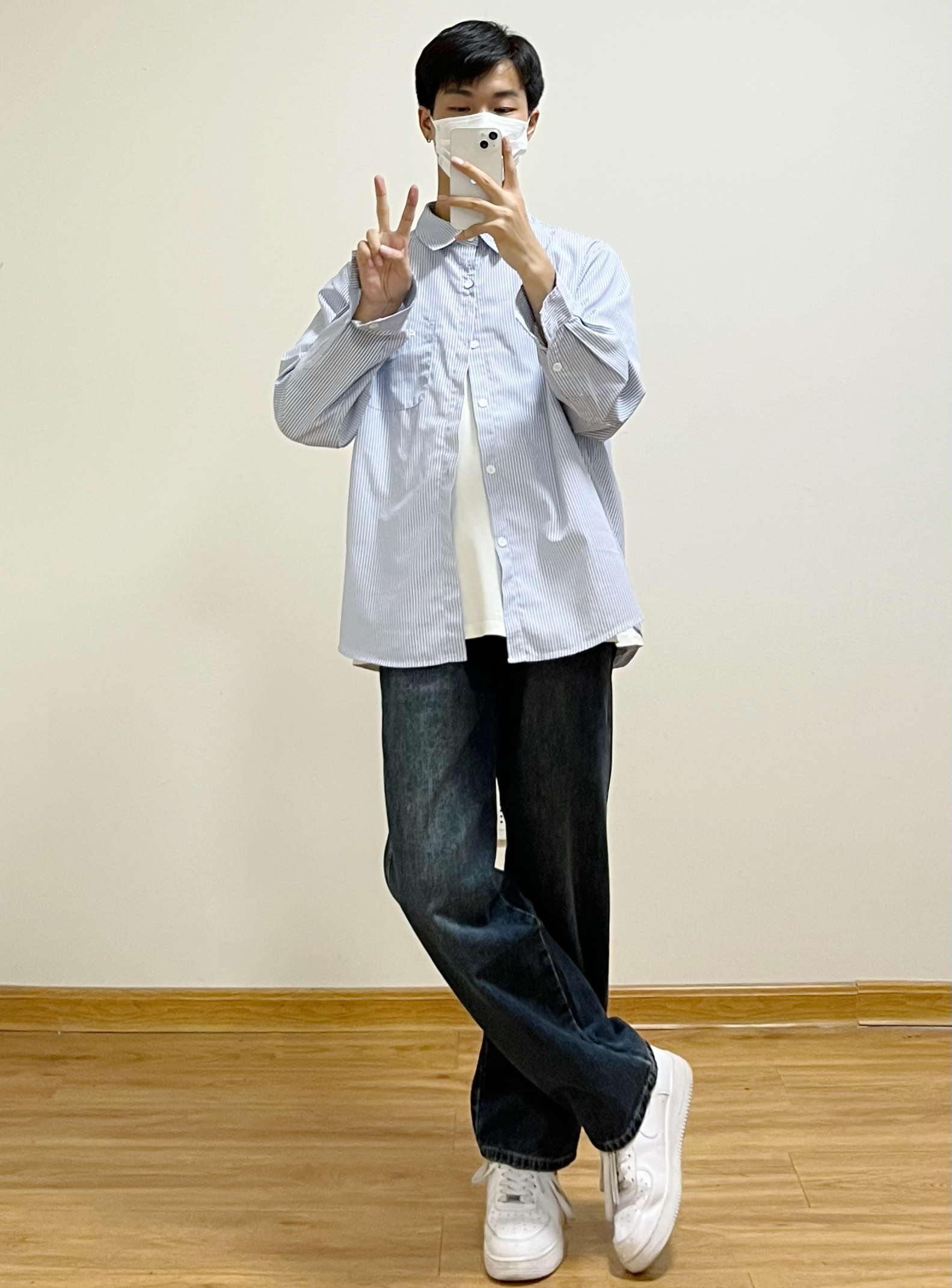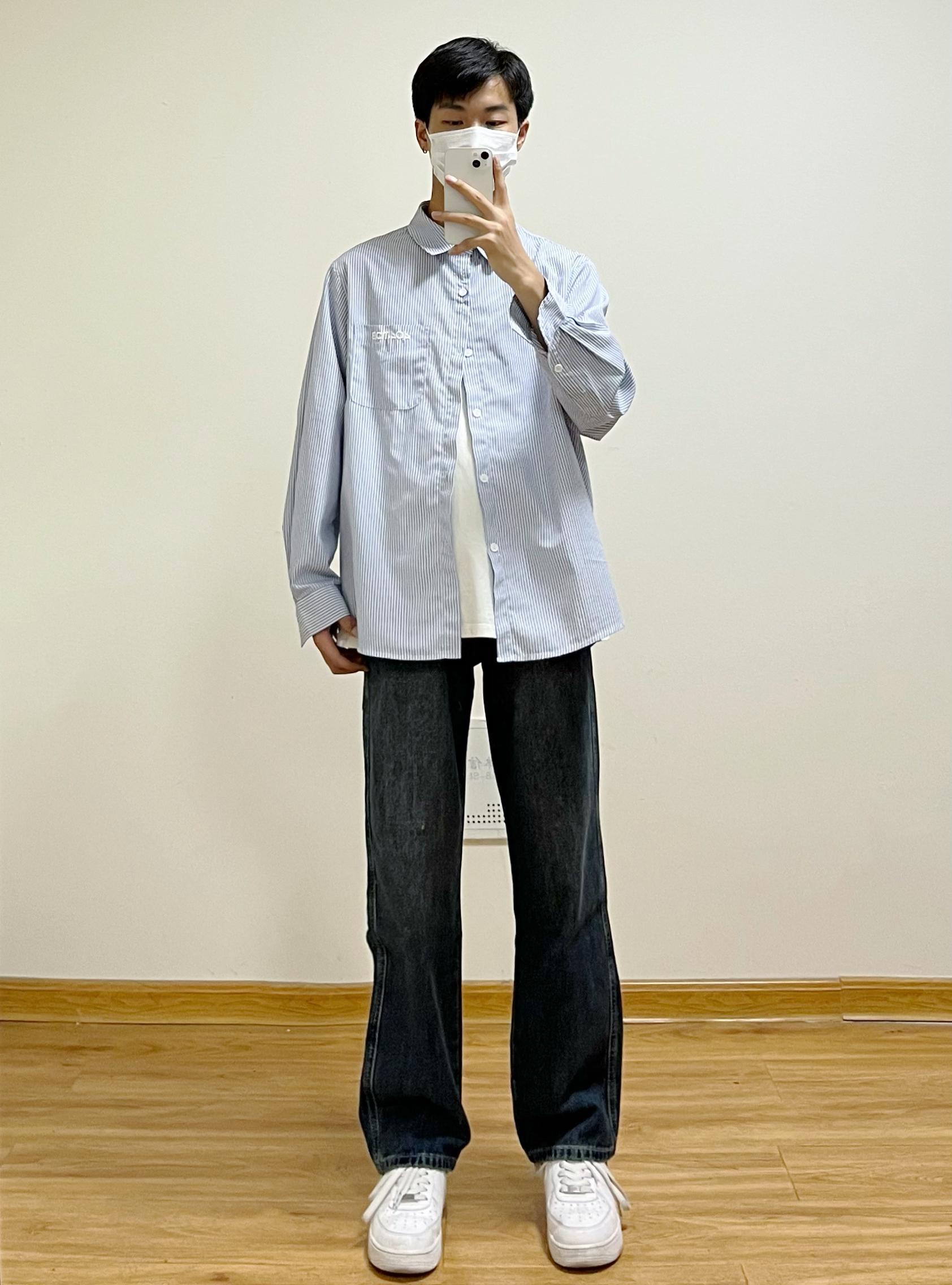 叮叮叮🔔今日穿搭分享来咯~ 📸 这件条纹衬衫真的一点都穿不腻的感觉💗 天蓝色sky的颜色显得整个人都很奶🫒 奶呼呼的配色加上冰冰凉凉的材质🏓 尊滴很适合初秋穿啦🚲🚲 📸 裤子就搭配了一条深蓝色复古牛仔裤🤠 这个版型是直筒的设计我非常喜欢💕 面料厚度的话也刚刚好,适合秋天穿咯🔔 👔:天蓝色条纹衬衫 👖:深蓝色复古牛仔裤 👟:纯白色板鞋