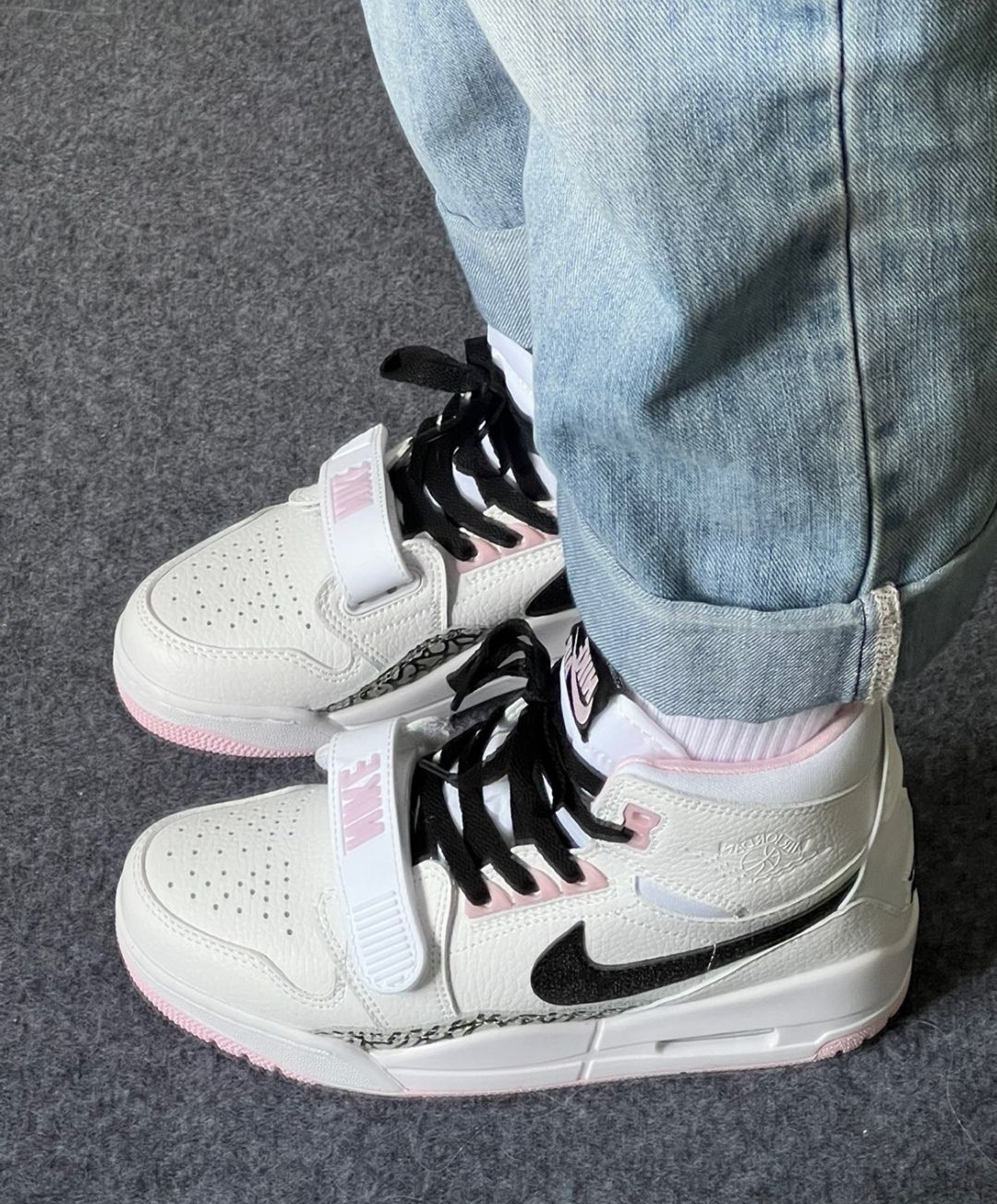 七夕礼物 Air Jordan Legacy 312( GS )缓震耐磨复古高帮实战篮球鞋樱花粉白 鞋子采用了牛皮革/牛剖层革和合成革的材质,质感相当棒,白色的鞋面加入了粉色点缀,鞋侧融入了爆裂纹的设计,有种Aj3的即视感,黑色的 Swoosh 有点闪闪的感觉。