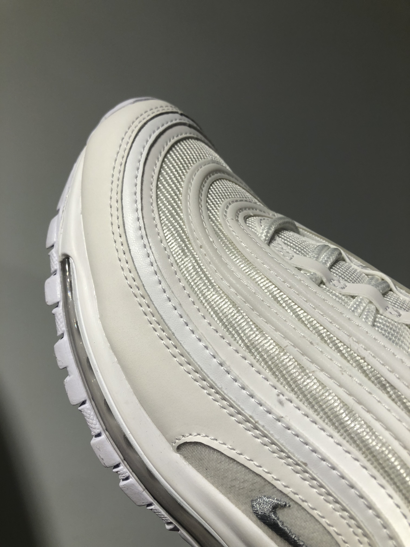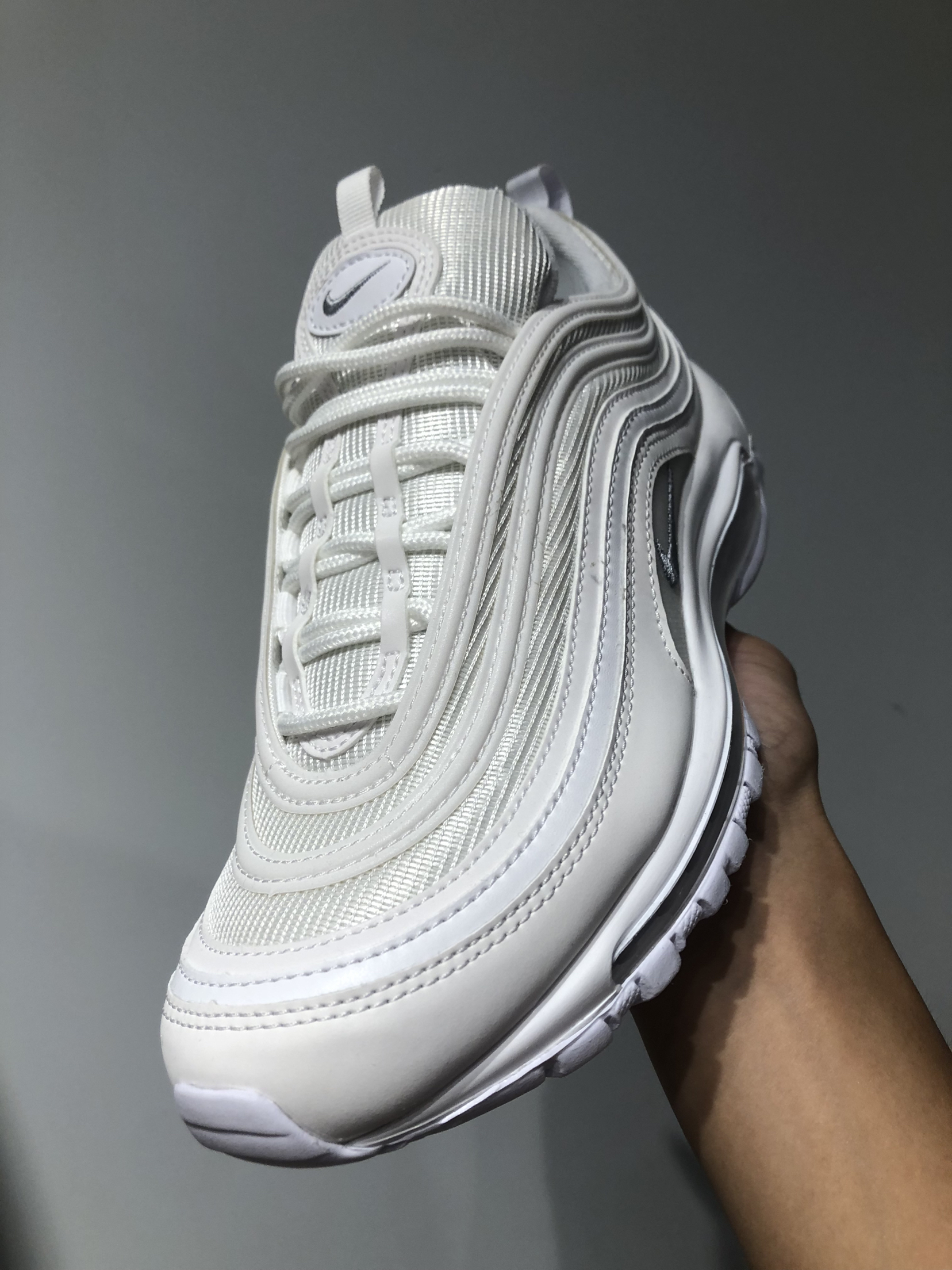 Nike Air Max 97 纯白子弹 白色 这双子弹鞋已经火了好几年了! 在穿搭方面确实非常好看,增高效果也不错! 但是脚感方面真的很差,特别硬。前掌穿起来 还有一点卡脚!