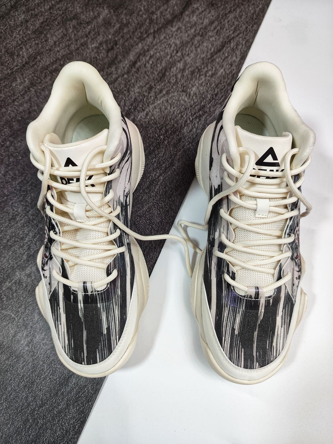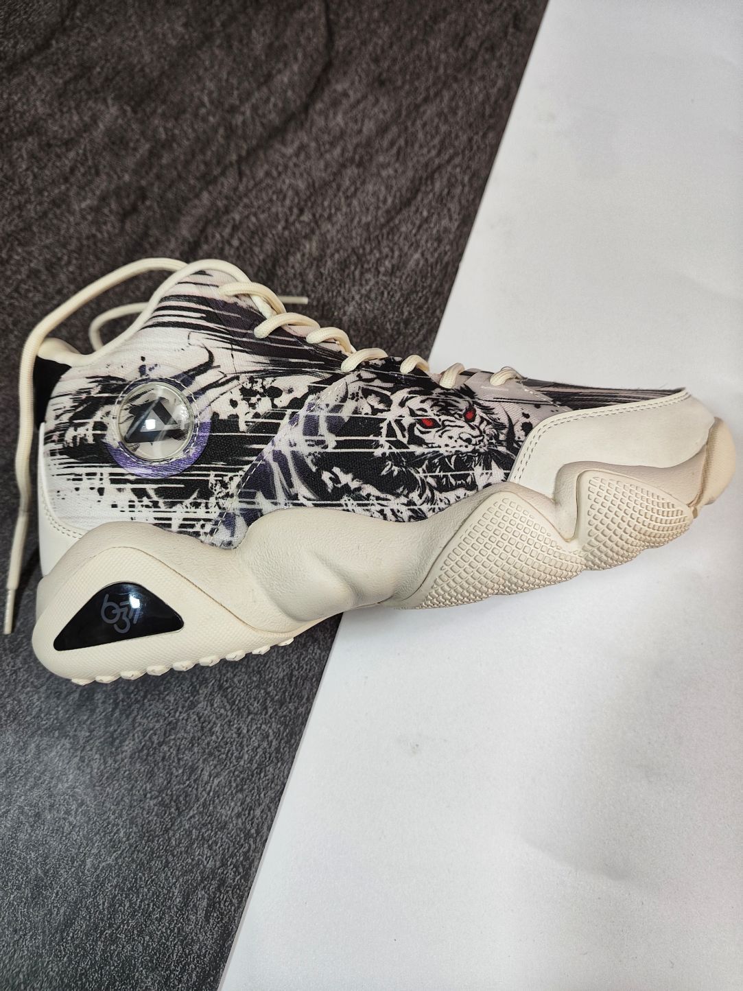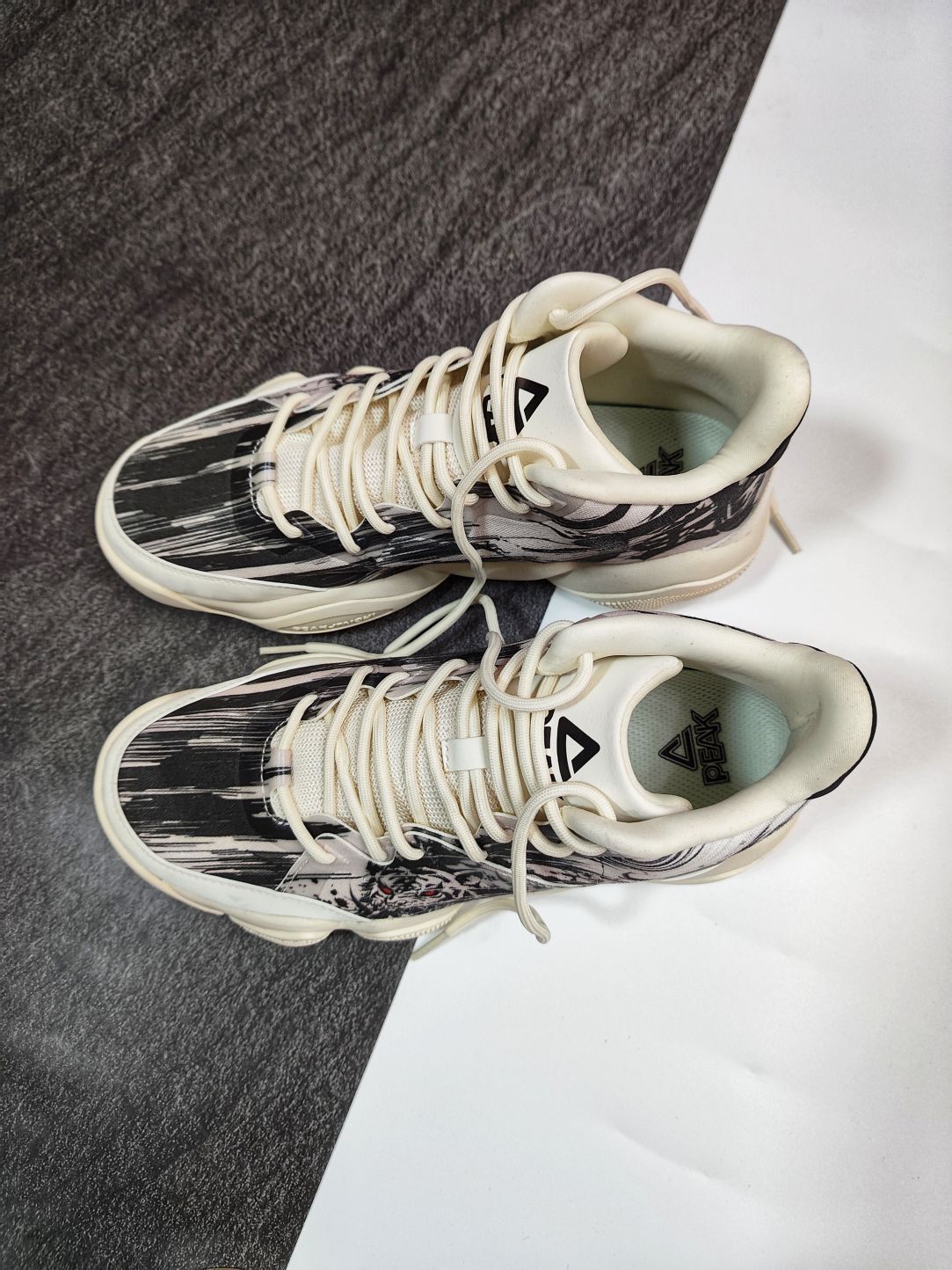🐅匹克延续6371实战鞋元素,增添国风水墨画,打造了一双态极休闲篮球鞋。 🐅首先是手感鞋身上面蒙了一层薄膜,摸上去有明显的感觉,宛如面纱,神秘感剧增。 🐅国风水墨画带入非常有感觉,犹如“虎啸生风”成语,鞋身水墨画白虎呼之欲出,鞋腰处晃动Logo标志,会出现“風” “匹克大三角Logo” 随之交替,忽隐忽现。 🐅态极科技鞋底,缓震足,回弹给力。七夕来临,选择这样一双休闲篮球鞋送给自己是个不错的选择。