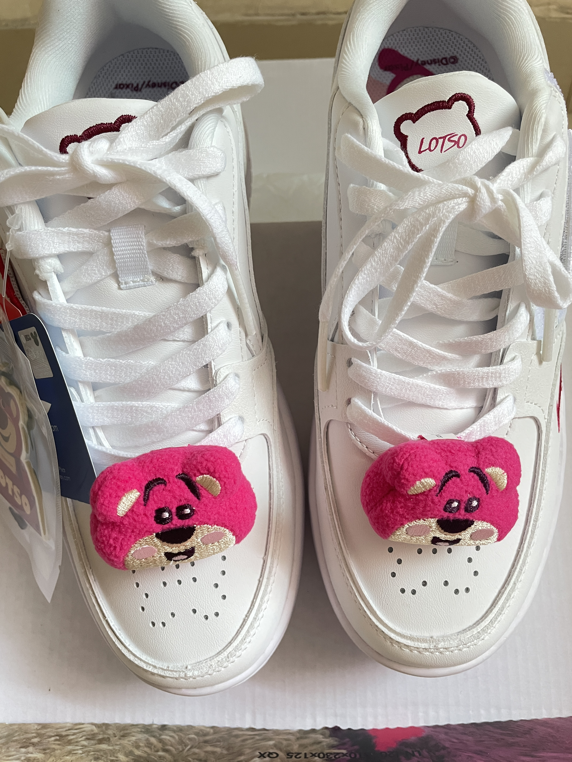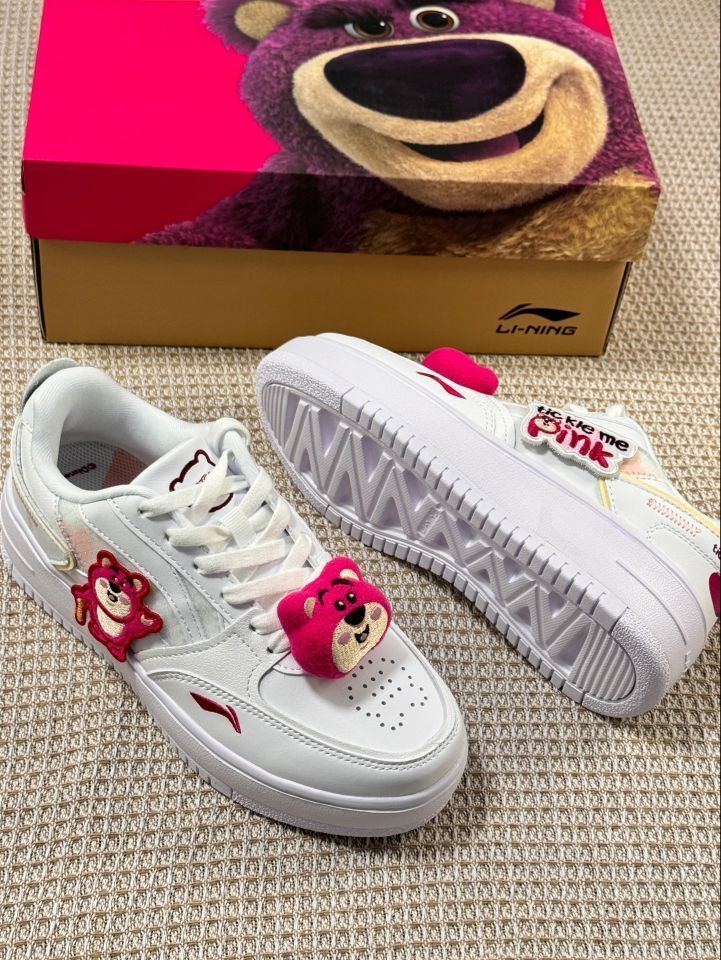 今日分享:Disney/迪士尼xLiNing李宁草莓熊经 典百搭 防滑耐磨低帮 板鞋 女款白色#送礼推荐 🐻这款草莓熊之前很火的,被外观设计吸引到,谁穿谁可爱,鞋带上有个熊头 🐻鞋身皮革材质,透气孔都是熊头形状的,侧面还有魔术贴两边都不一样,非常不错