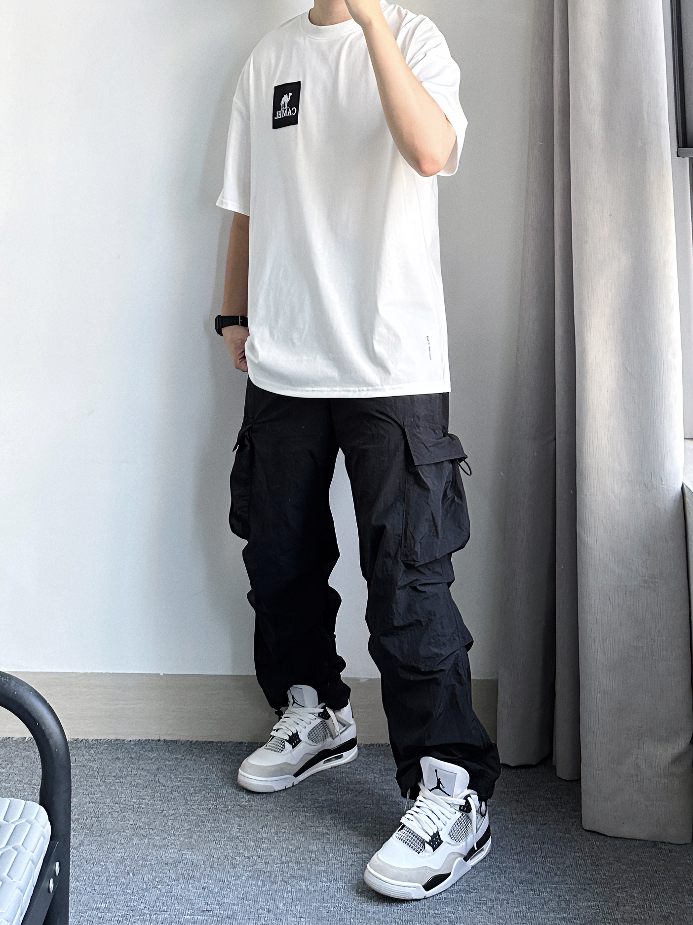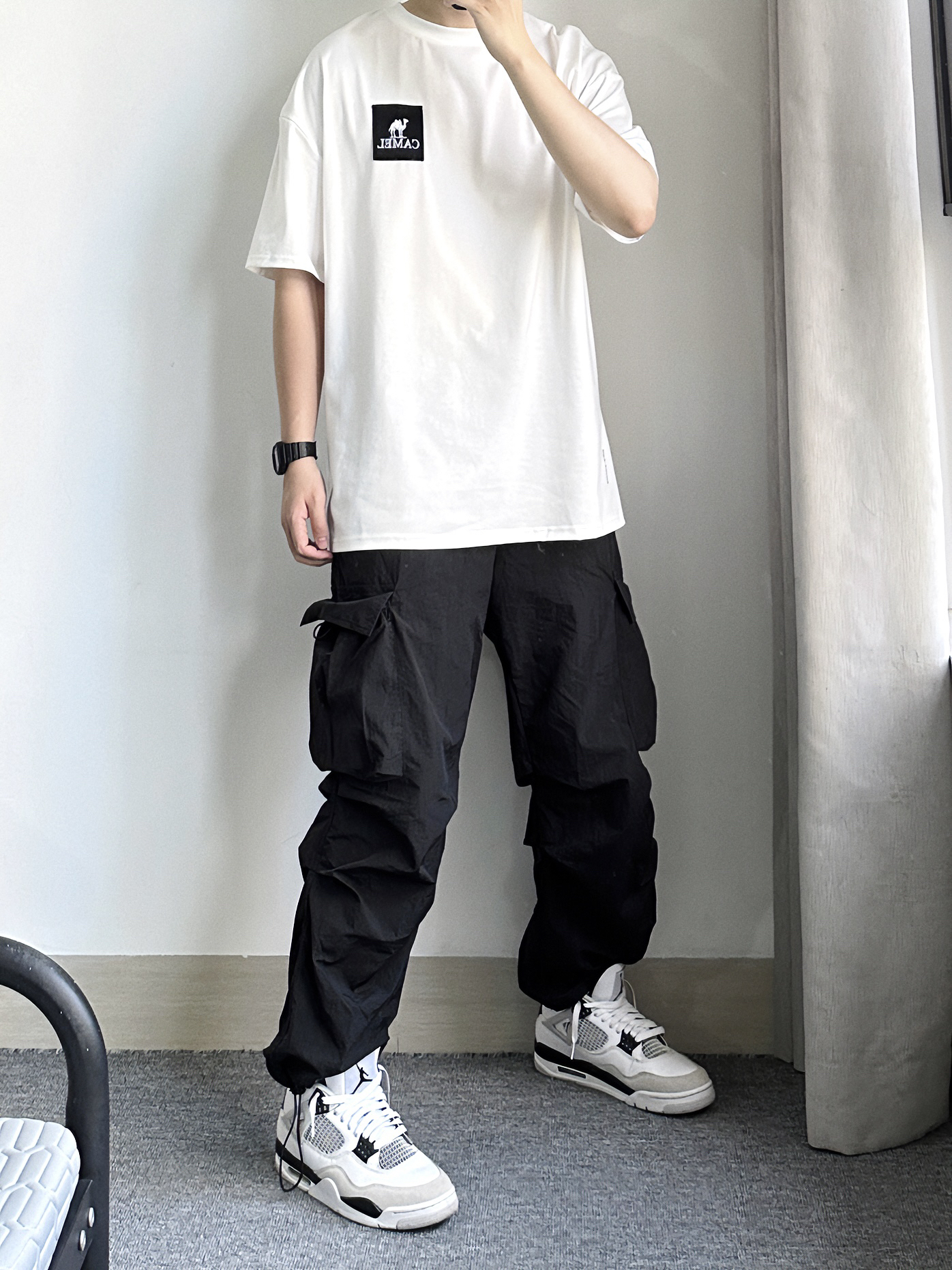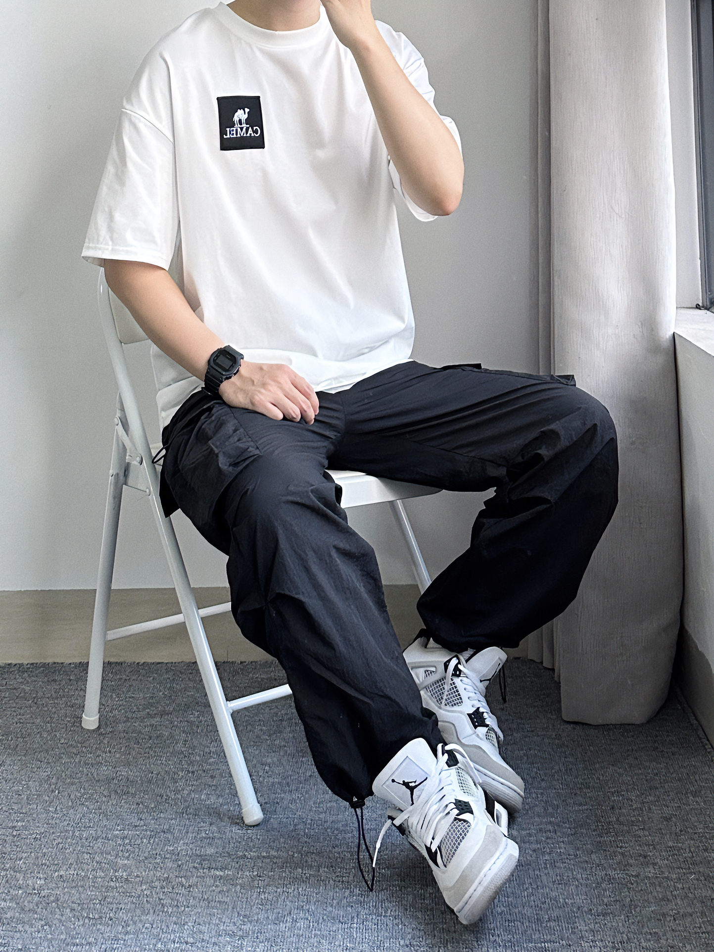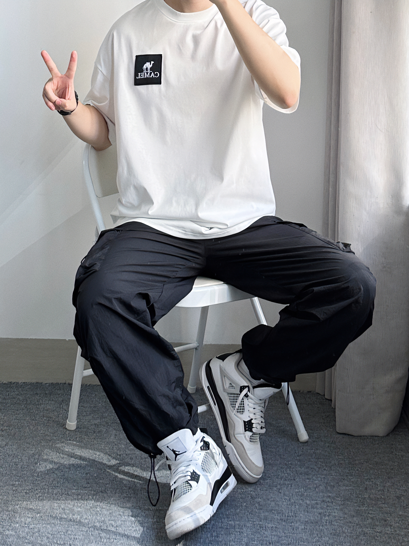 夏天这样穿也太帅咯,简单清爽的印花白T,上身干净利落,宽松版型舒舒服服,下身配一条工装裤整体白黑色系经典百搭,真的不挑人!细节方面可以自己搭配帽子或者一些配饰,准备到七夕了,约会这样穿出门也是不错的选择👍 兄弟们夏天帅就完事啦~ 短袖🔗- CAMEL骆驼 - 裤子🔗- Resonance17 - 鞋子🔗- AJ4 小白水泥 - 参考:175cm|65kg