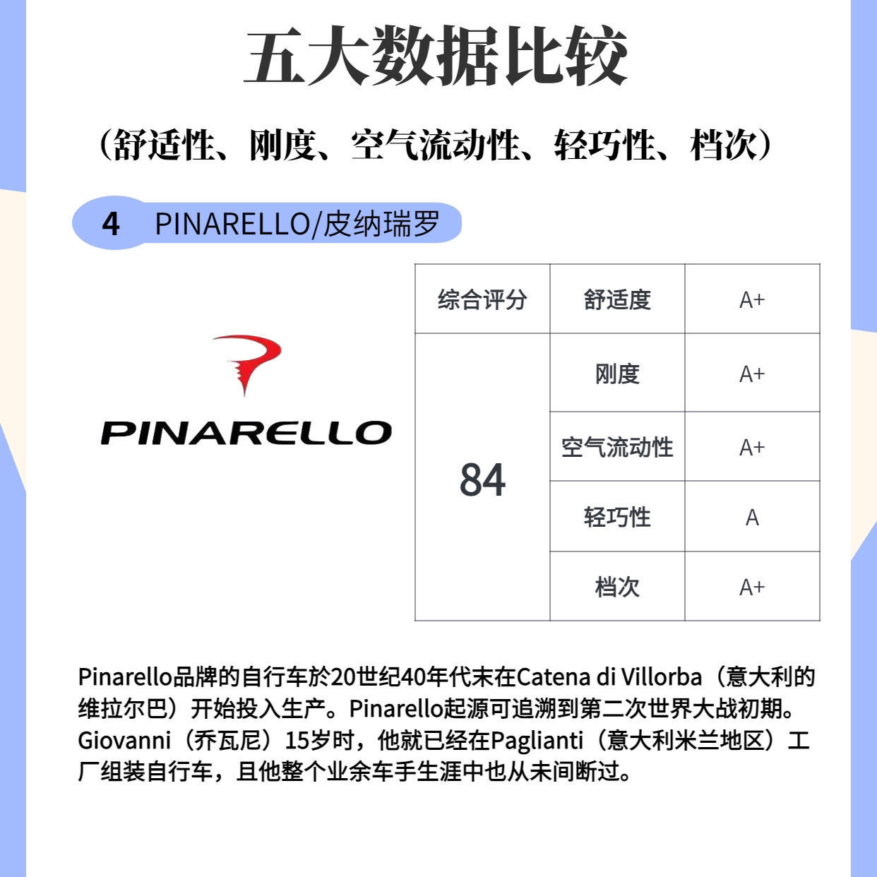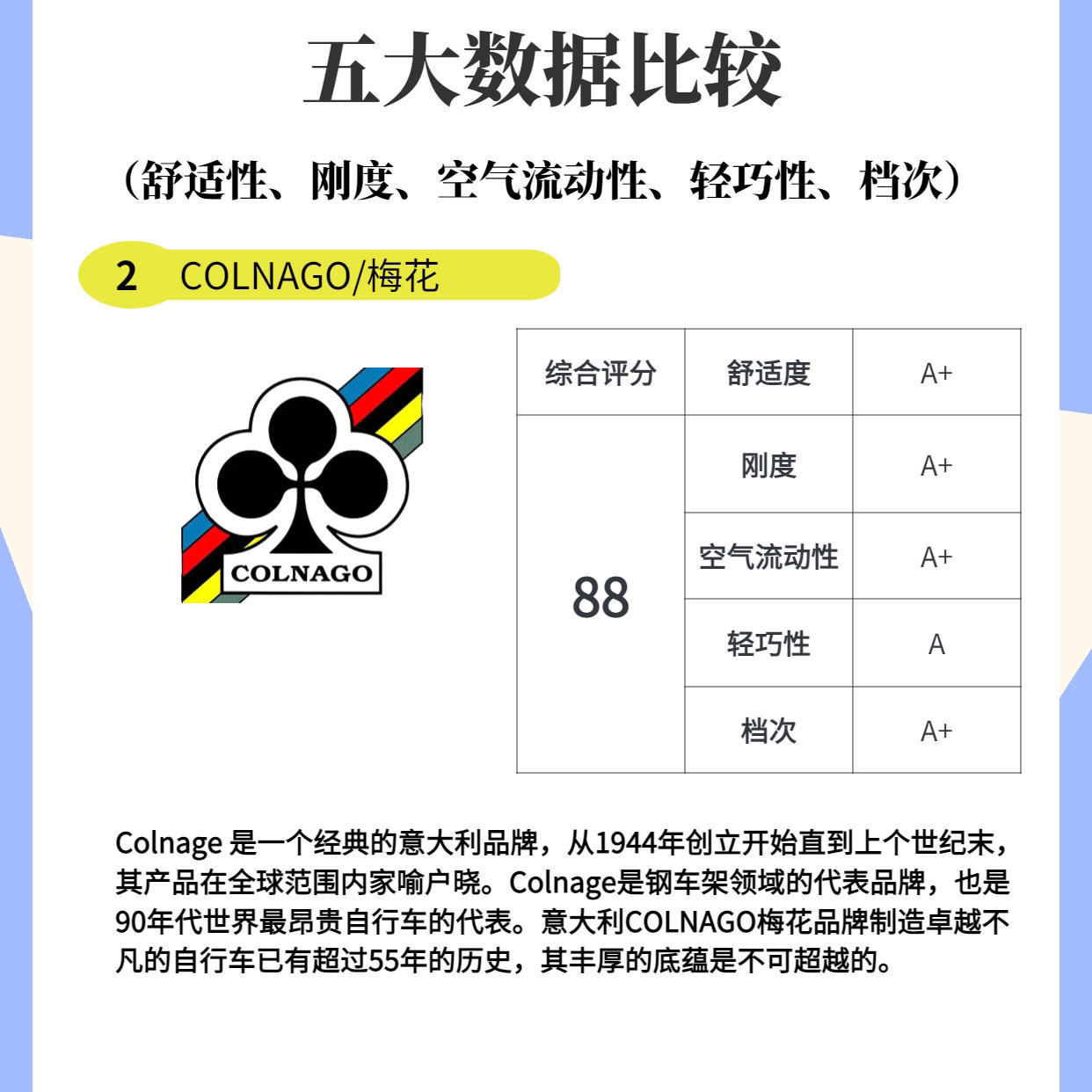 大家选择公路自行车的时候肯定免不了看车的品牌,今天我通过五大数据比较做了个高端品牌排行榜,欢迎大家在评论区交流指正! 1.Specialized 美国品牌闪电,综合评分92 2.Colnago 意大利品牌梅花,综合评分88 3.Cervelo 加拿大品牌赛维罗,综合评分86 4.Pinarello 意大利品牌皮纳瑞罗,综合评分84
