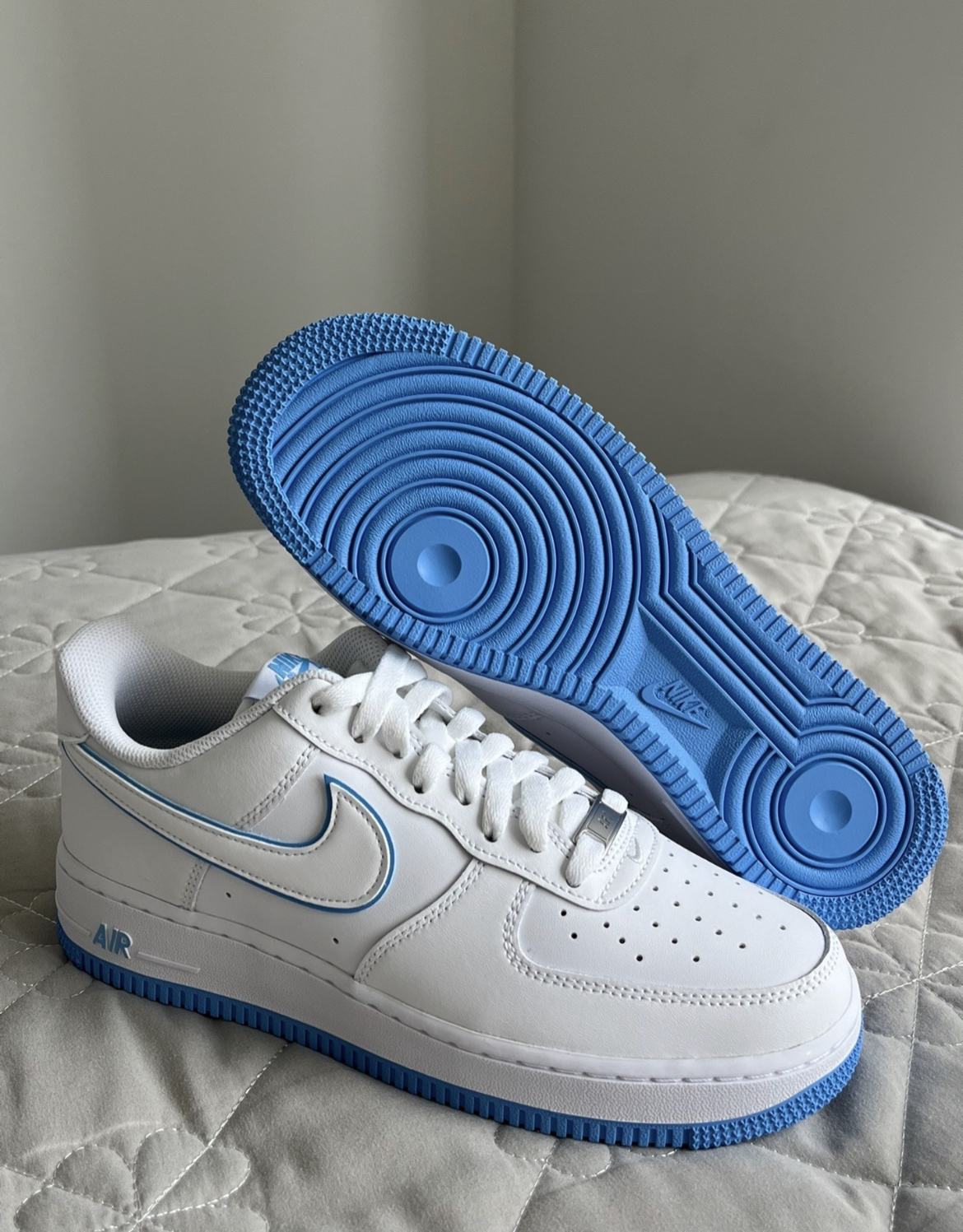大学蓝配色的空军一号也太好看啦 是夏天的颜色哦 整体采用以白色为主色调为基底 加上清新自然的大学蓝配色 给人焕然一新的感觉 空军一号的鞋型加上简约的配色 真的很受欢迎很百搭 全鞋身光面牛皮革的设计 质感柔软细腻 虽然白色易脏 但光面皮革真的好打理 鞋舌和内衬均采用织物材质 并且都配有海绵填充 上脚以后包裹性真的很棒 再加上兄弟搭载的Air Sole气垫 整体的脚感是绝对要比大多数板鞋舒服很多的 平...