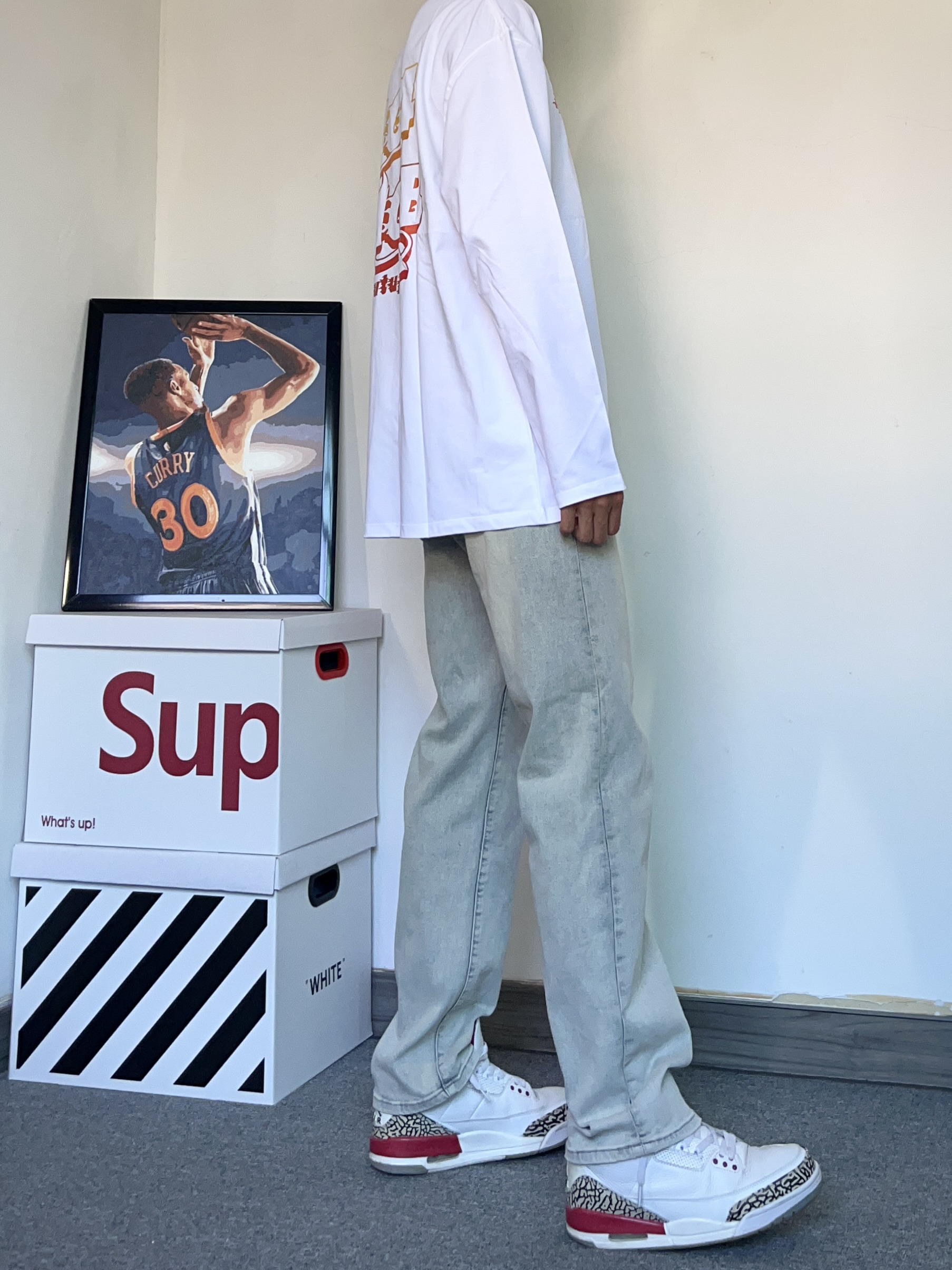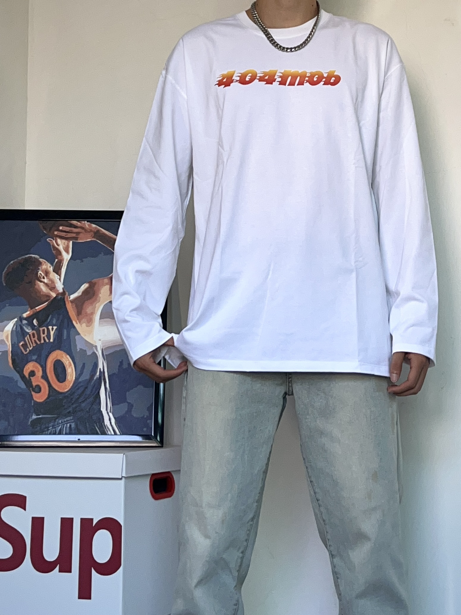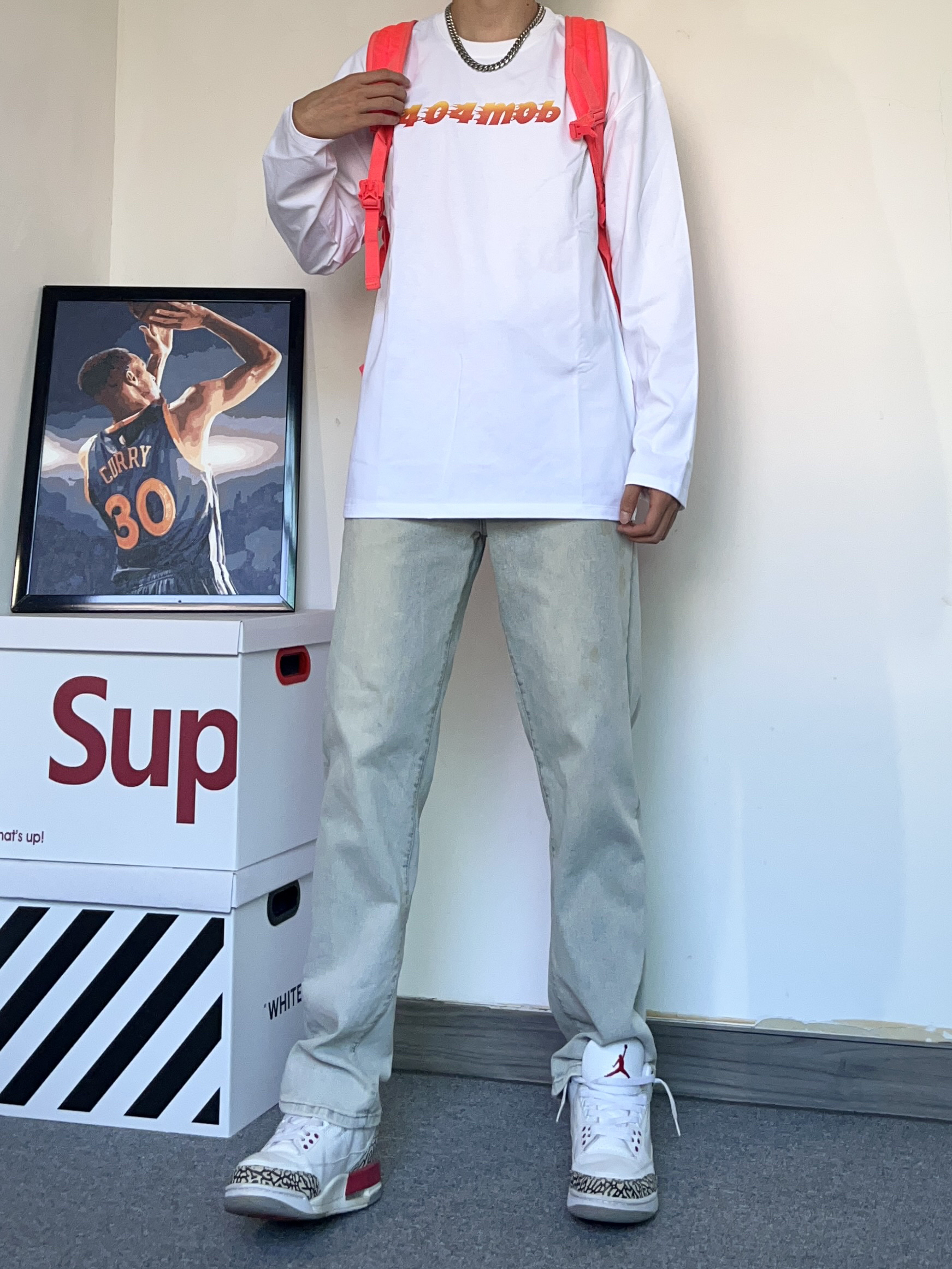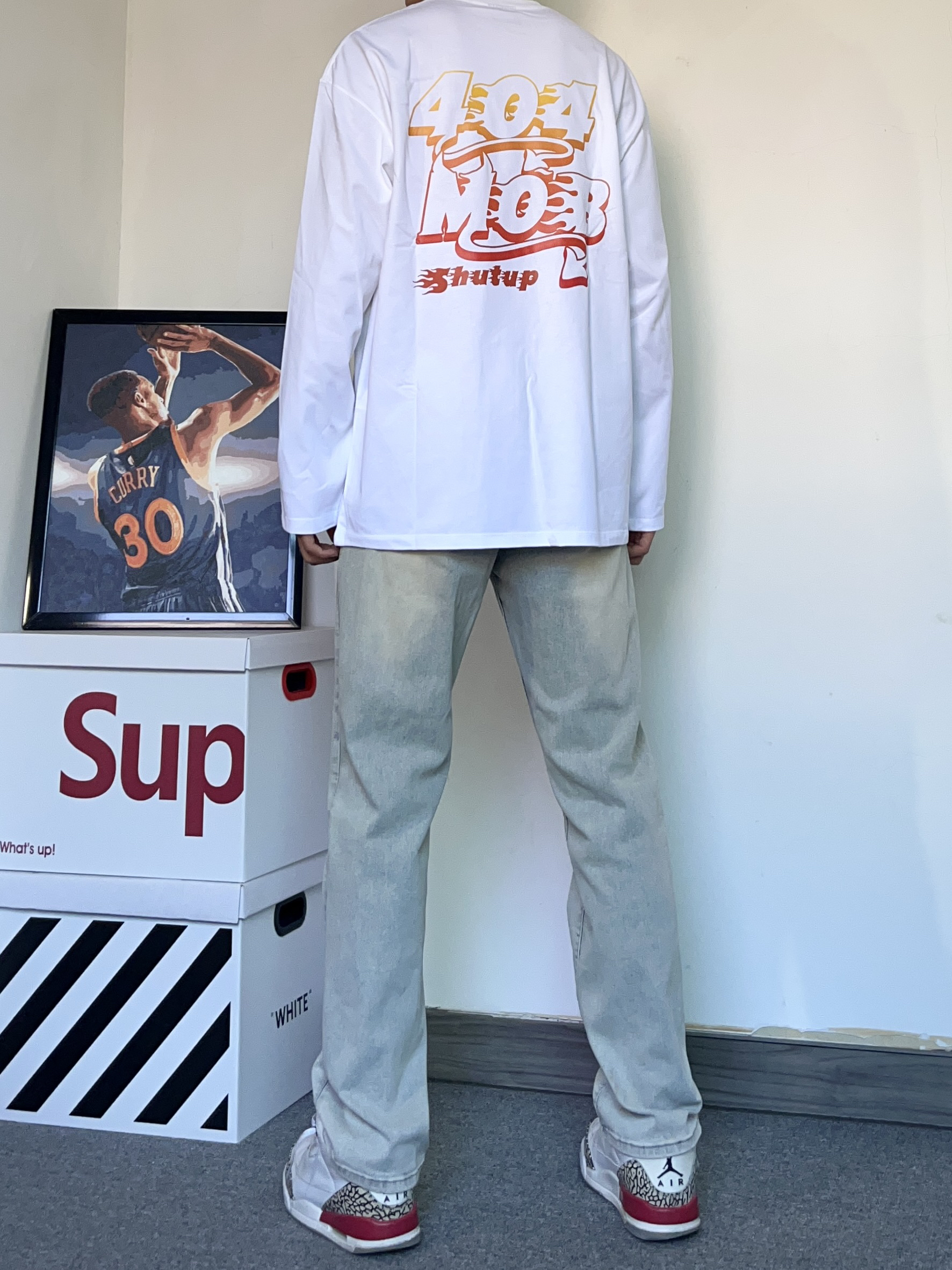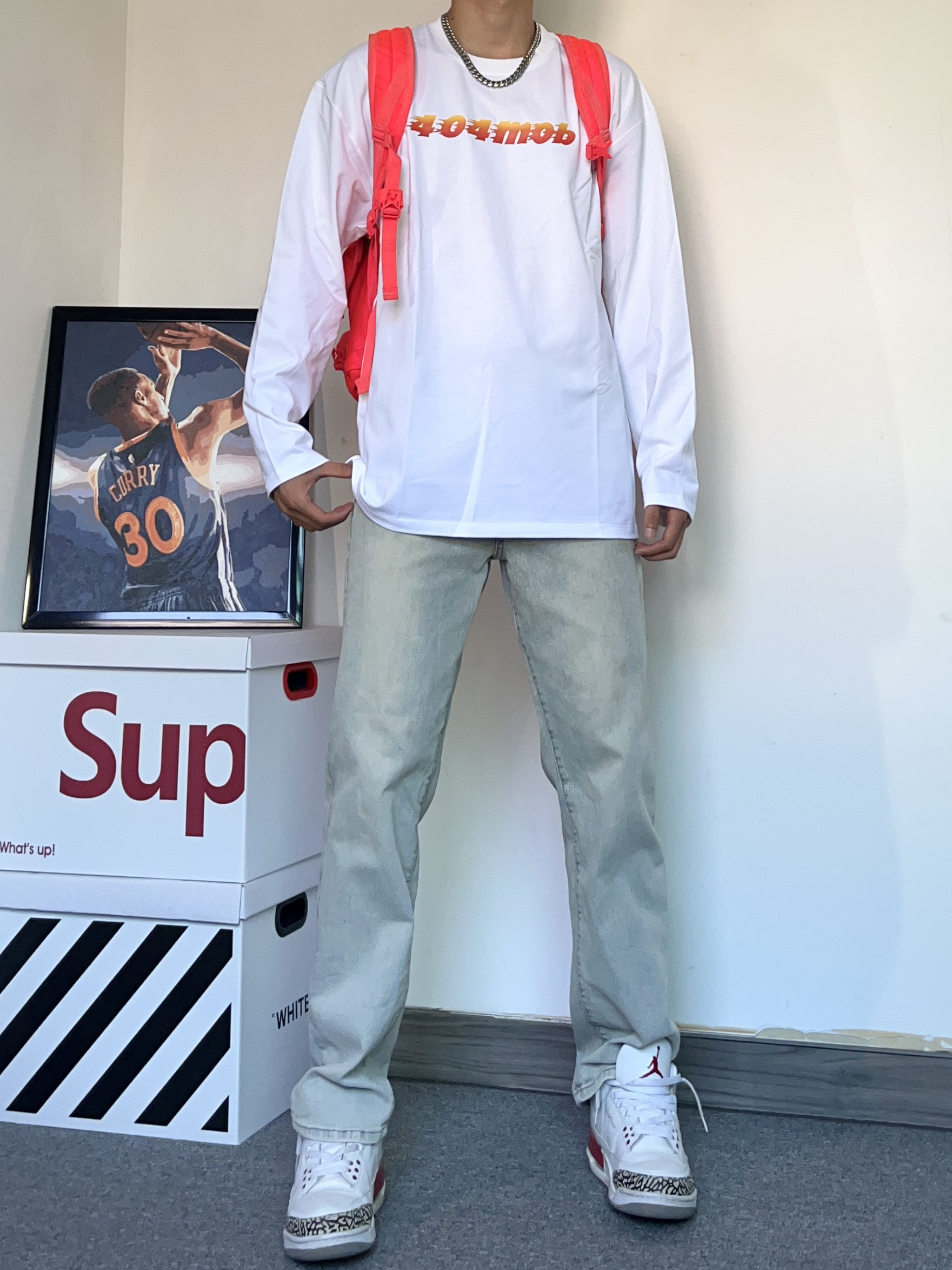 白t真的永远穿不腻! 今天上身一件口404MOB GANG 的火焰宇母 印花T恤! 圆领的设计很透气,整体的版型刚刚好 真的很喜欢这个面料材质,穿在身上真的巨柔软、舒服! - 搭配了一条修身黄泥色牛仔裤! 版型巨显腿长,裤脚的垂度刚刚好 搭配一件白t直接帅晕! - 穿了一双百搭的ai3