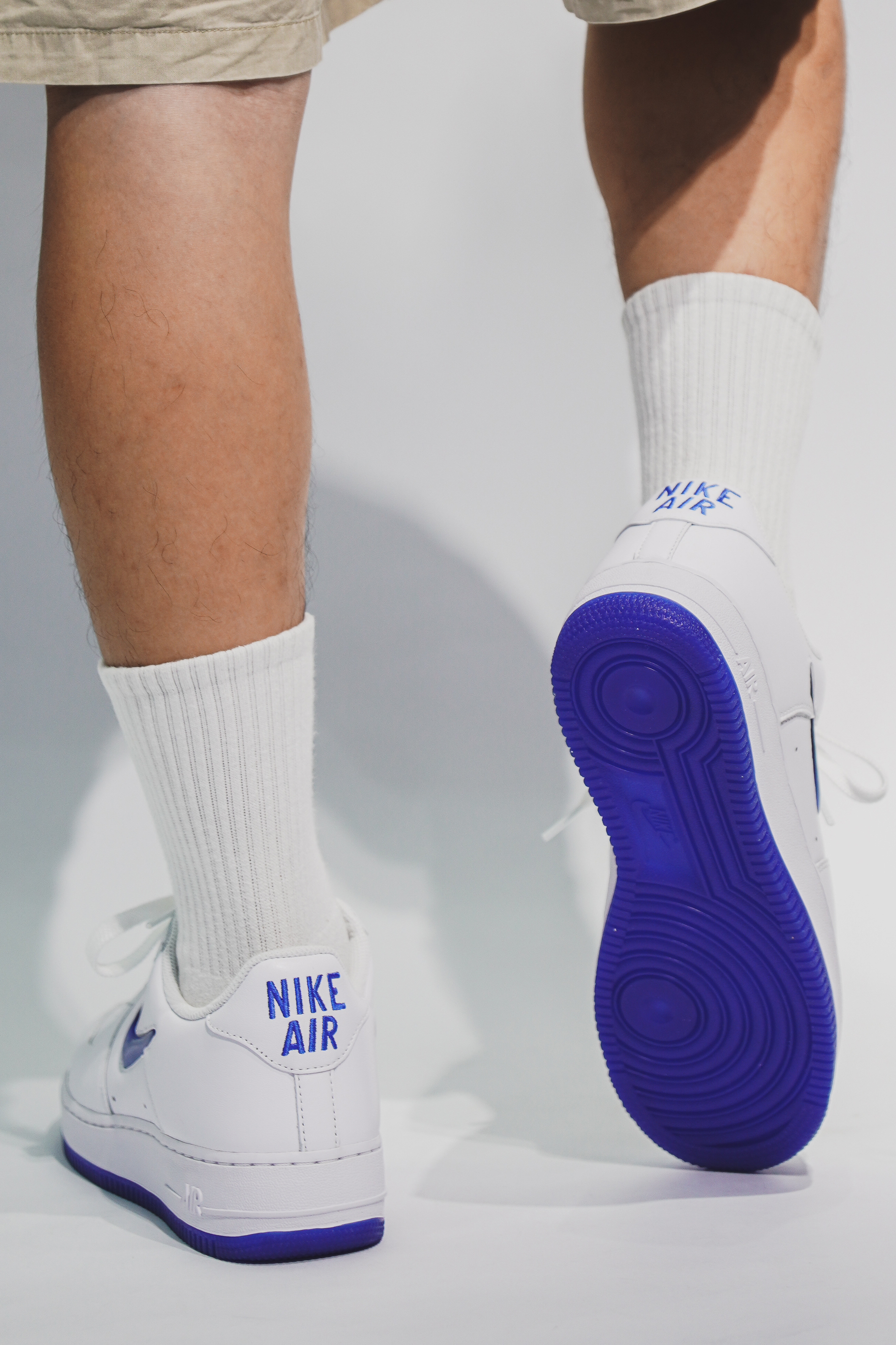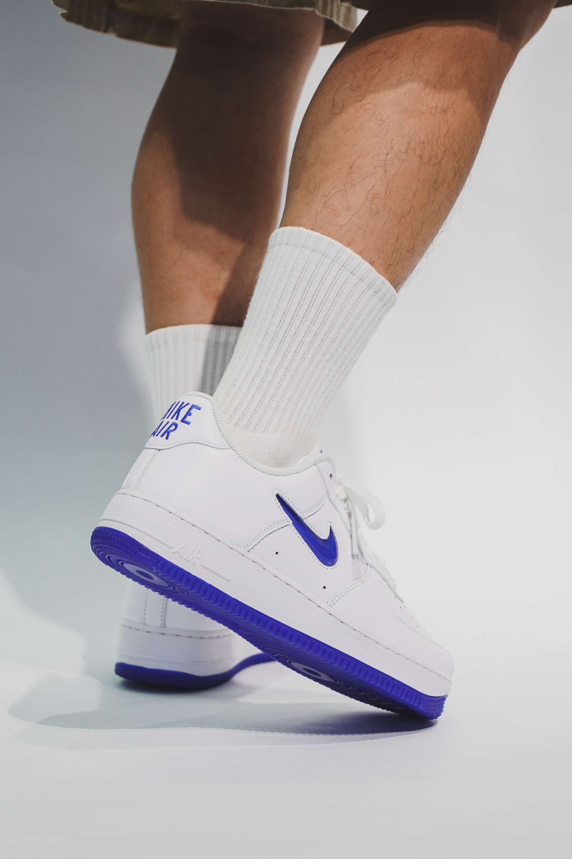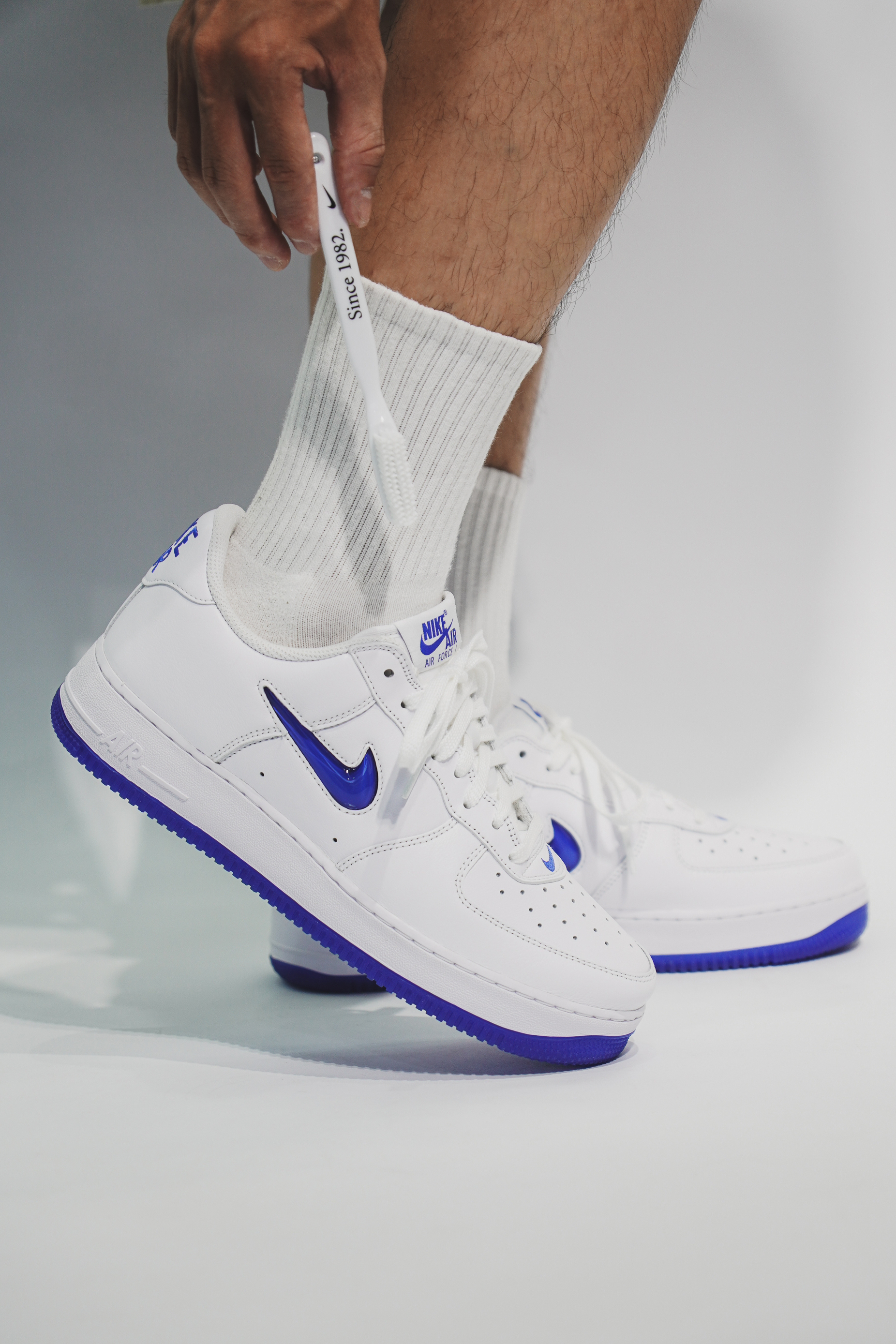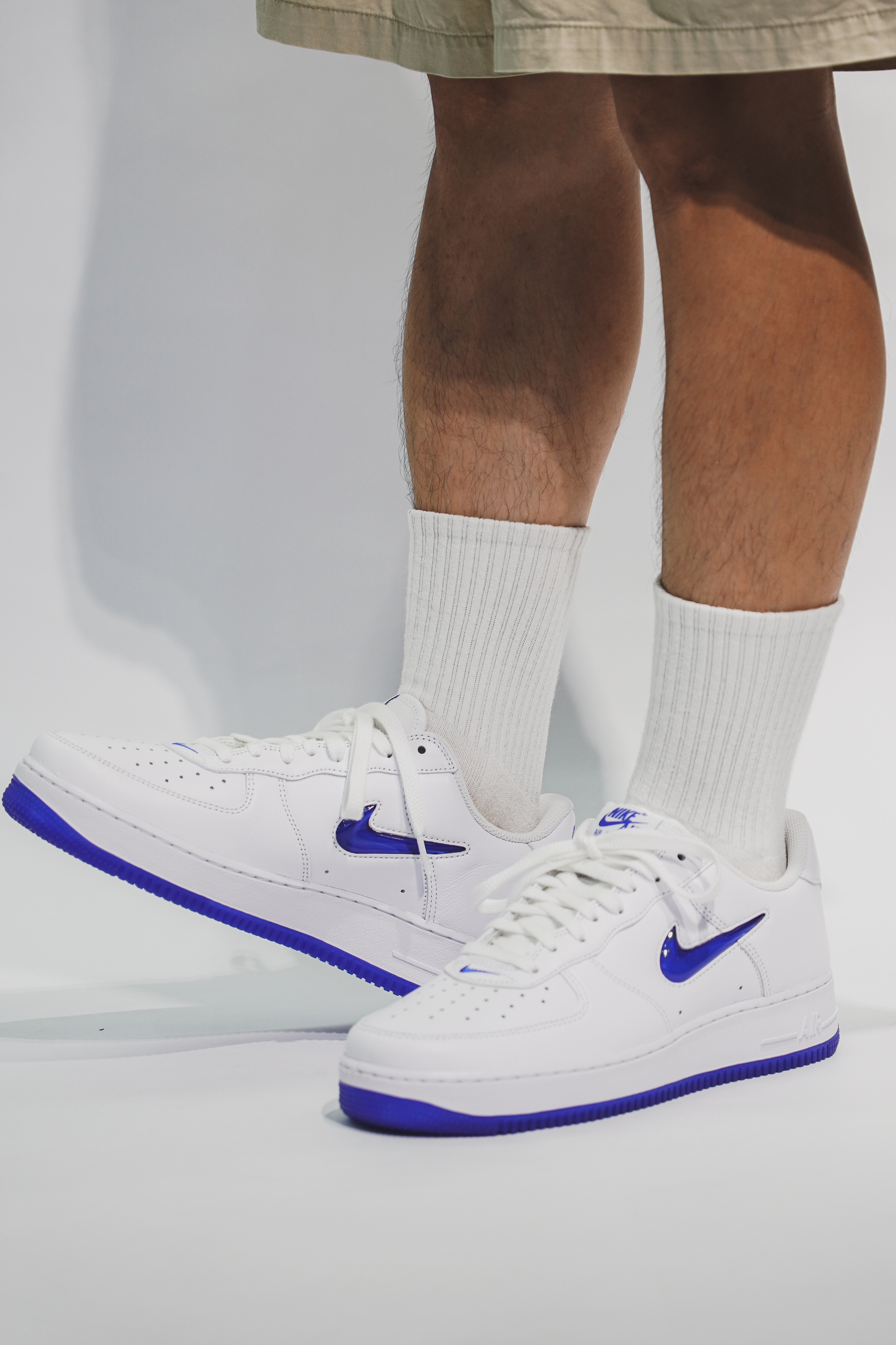 Nike Air Force 1 Low Royal Jewel 整双鞋依旧选用纯白色皮革打造鞋面,之后,在鞋侧两边分别加入果冻质感的 Swoosh Logo 并辅以蓝色点缀,吸睛十足。与此同时,在鞋舌、鞋尾等位置同样辅以蓝色点缀,凸显本次主题。最后,鞋底选用白色中底巧搭蓝色橡胶外底,完成整体设计。