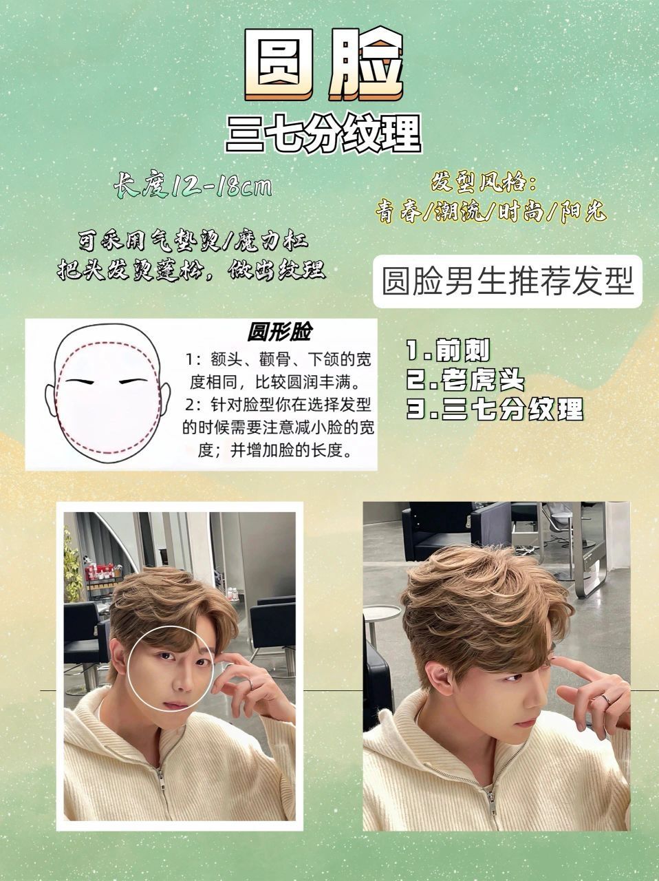 男生不同脸型发型推荐合集|||男生不同脸型发型推荐合集|||⚠️想知道自己适合什么发型吗?❗ 🌟六种脸型适合不同发型🌟 1️⃣圆脸 圆脸男生特征:脸型偏短,脸颊圆润,骨骼感弱 圆脸男生推荐发型: 1.前刺 2.老虎头 3.三七分纹理 2️⃣菱形脸 菱形脸男生特征:额头窄,颧骨宽,下巴尖 菱形脸男生推荐发型: 1.老虎头 2.二八微分 3.微分碎盖 3️⃣椭圆脸 椭圆脸男生特征:额头与颧骨基本等宽,...