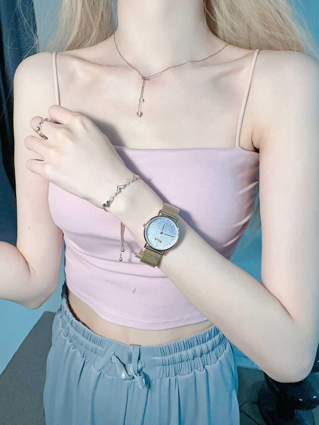 七夕快到了收到男朋友给的惊喜💕 一套玫瑰色礼盒好好看! 解决我配饰所有空缺 哈哈 手表是星空蓝色可以调节 尊嘟好温油呀 灯光打下来满满都是闪烁星星💫 里面还配有这条满爱心的手链 也是可以调节 对于我这贼挑手链的女生太友好了 巨显手白 爱心项链➕戒指好有讲究 ~ 整一套包含项链➕手链➕手表➕戒指 着实满意!可以一起戴也可以分开来单独搭配 送礼太有排面了