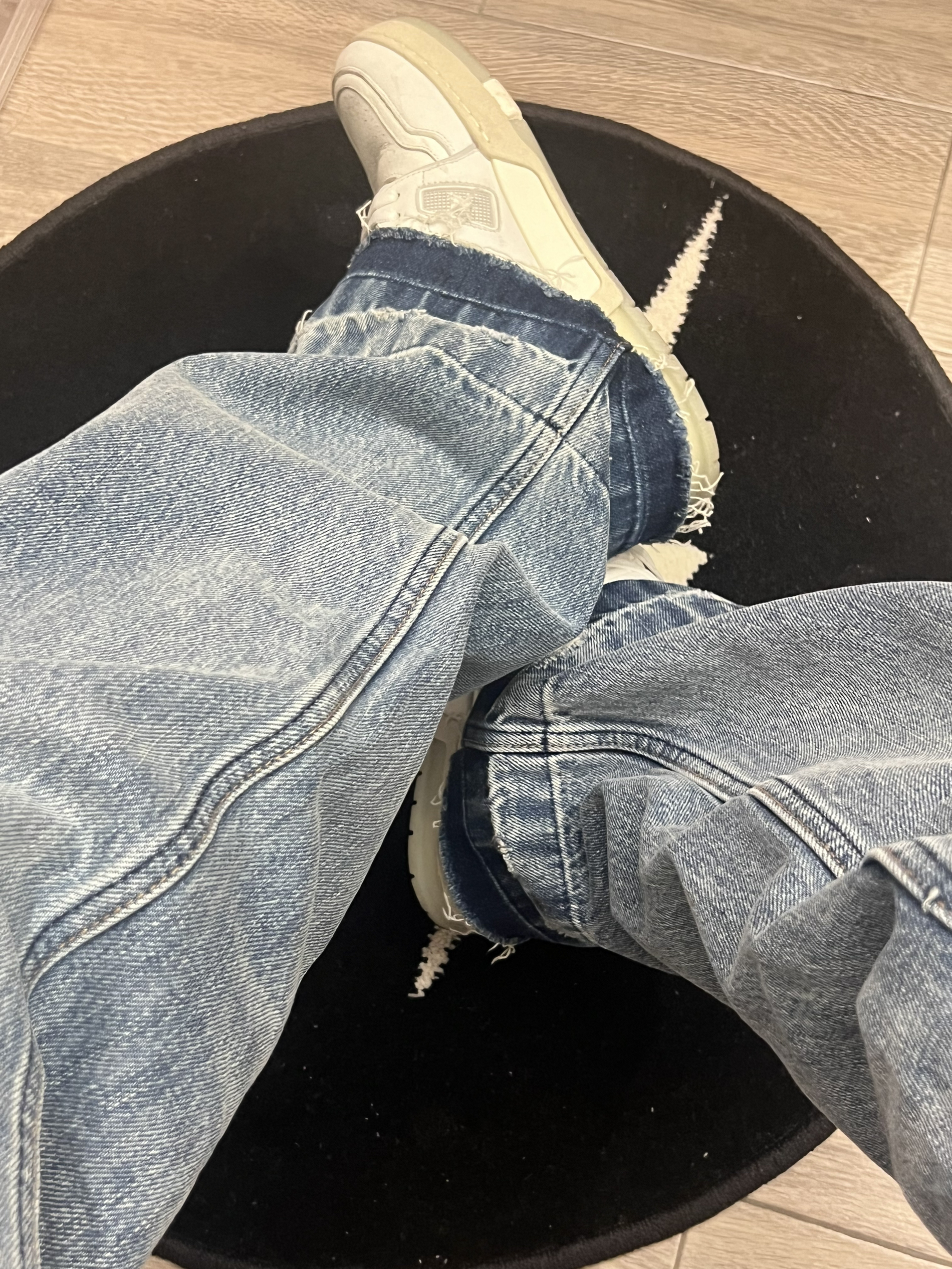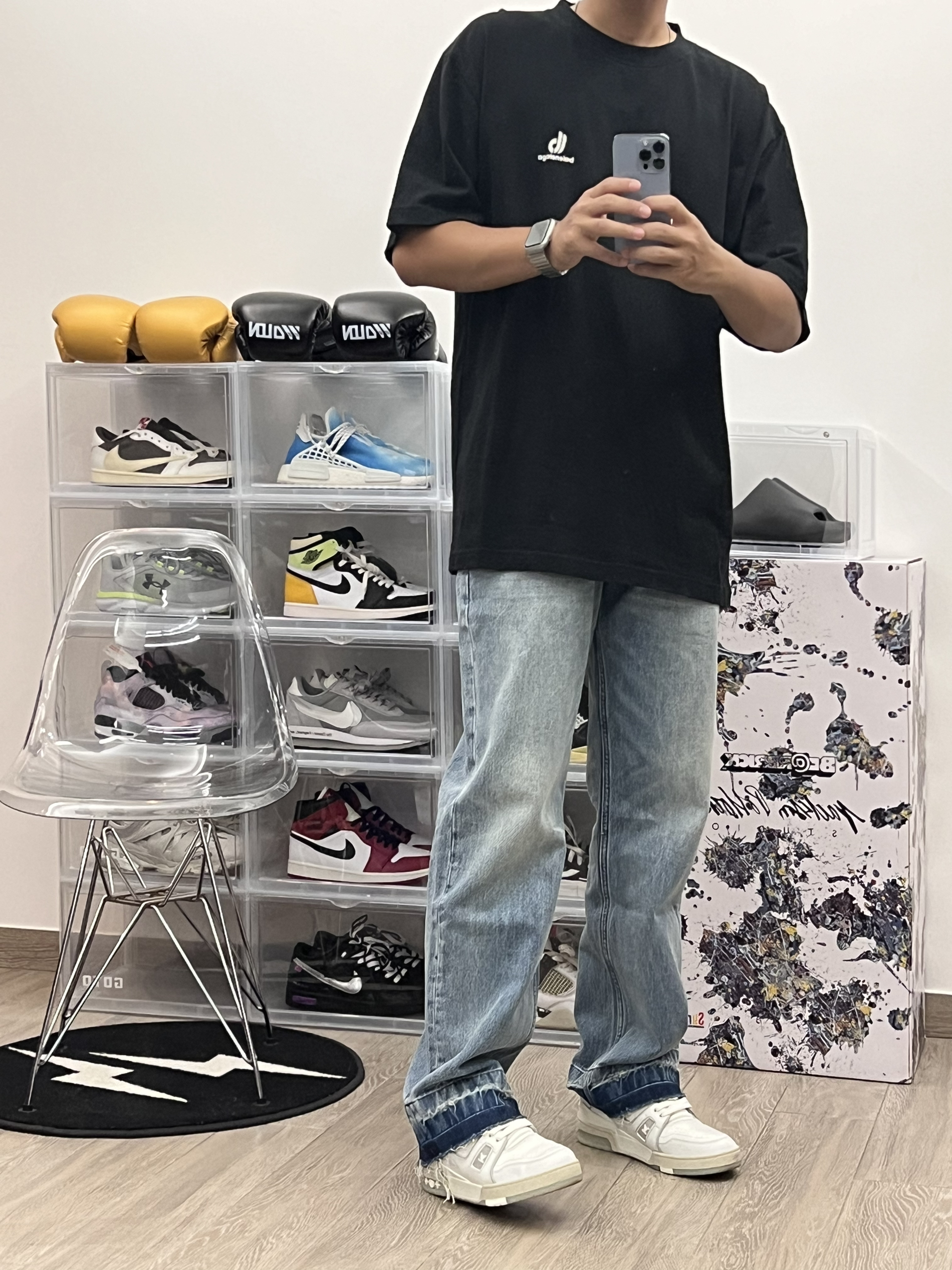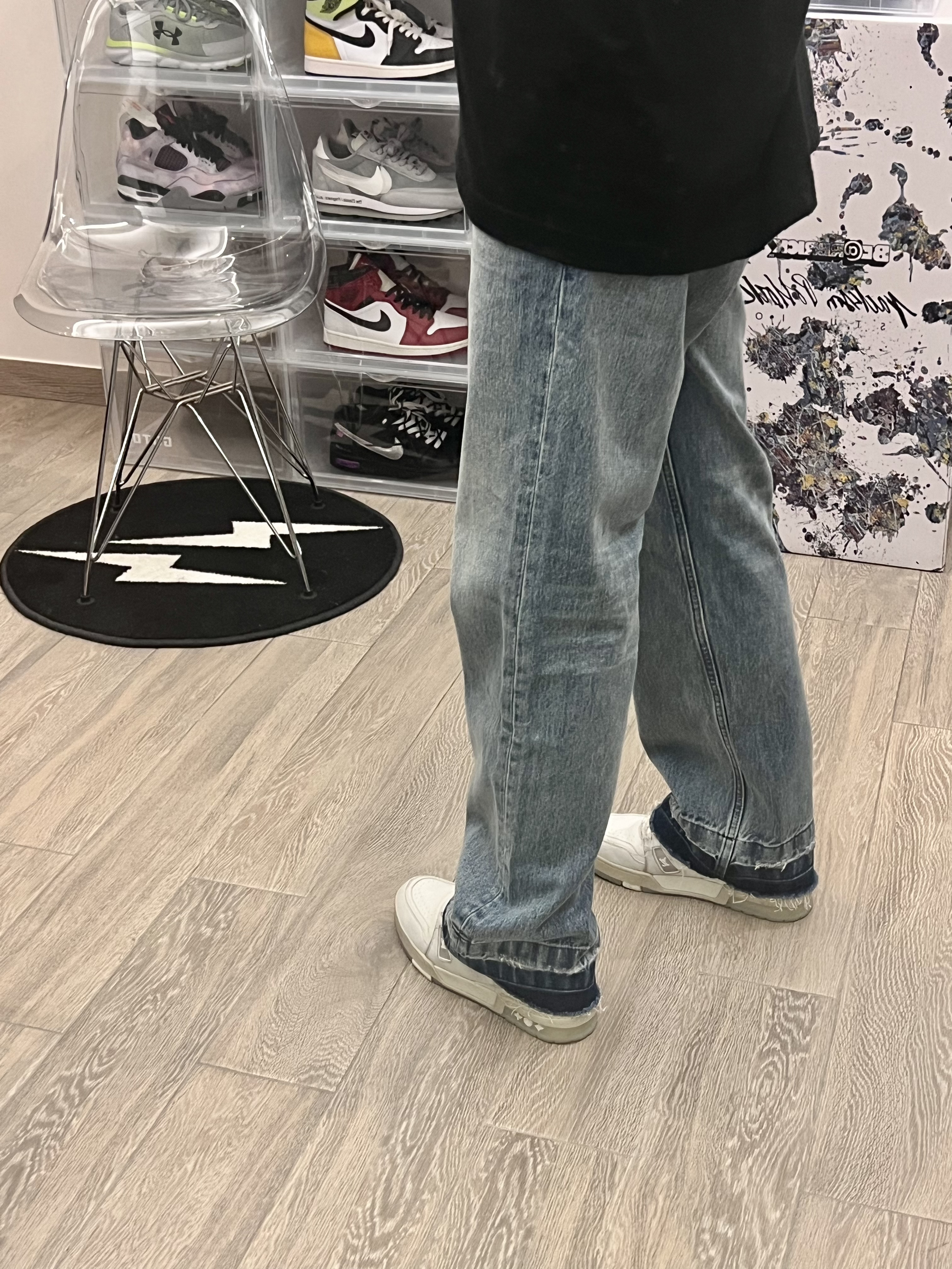 今日穿搭分享 👔上衣:巴黎世家短袖 👖裤子:Gremade Homme 直筒牛仔裤 👟鞋子:lv trainer 白水泥 下装 Gremade Homme 复古水洗蓝牛仔裤 高克数重磅面料 很厚实 硬挺有型 是我想要的感觉 裤腿流苏和拼接设计 高级感满满 版型方面178.144上身31的效果