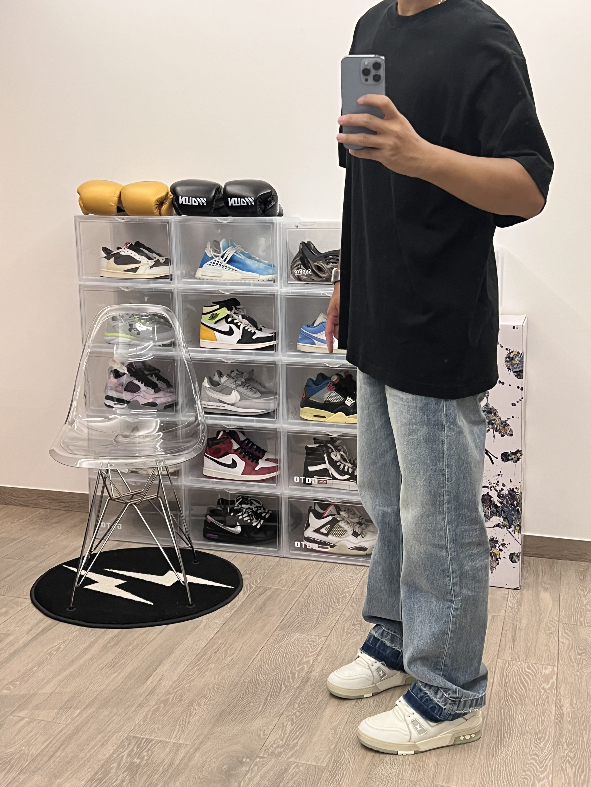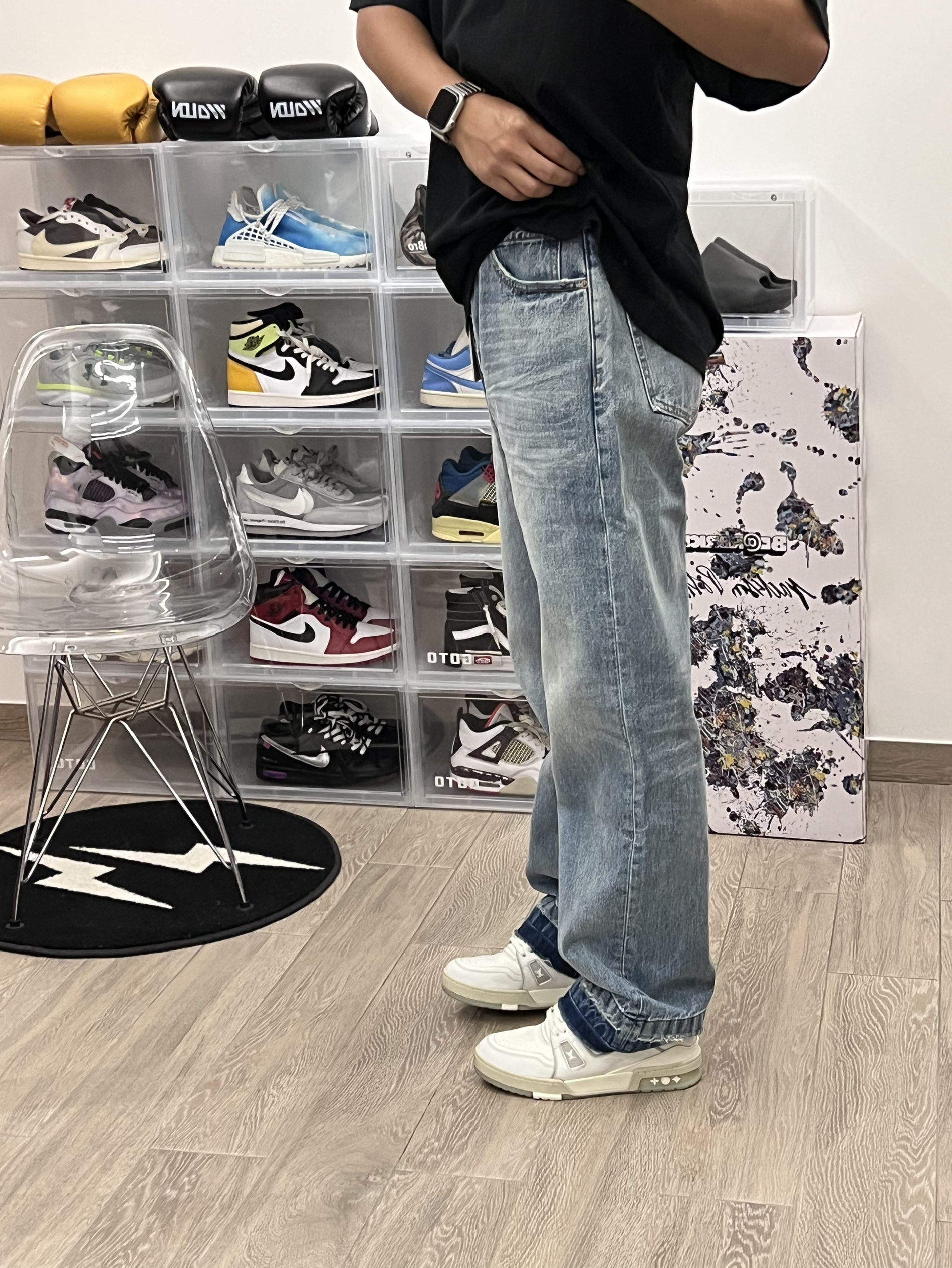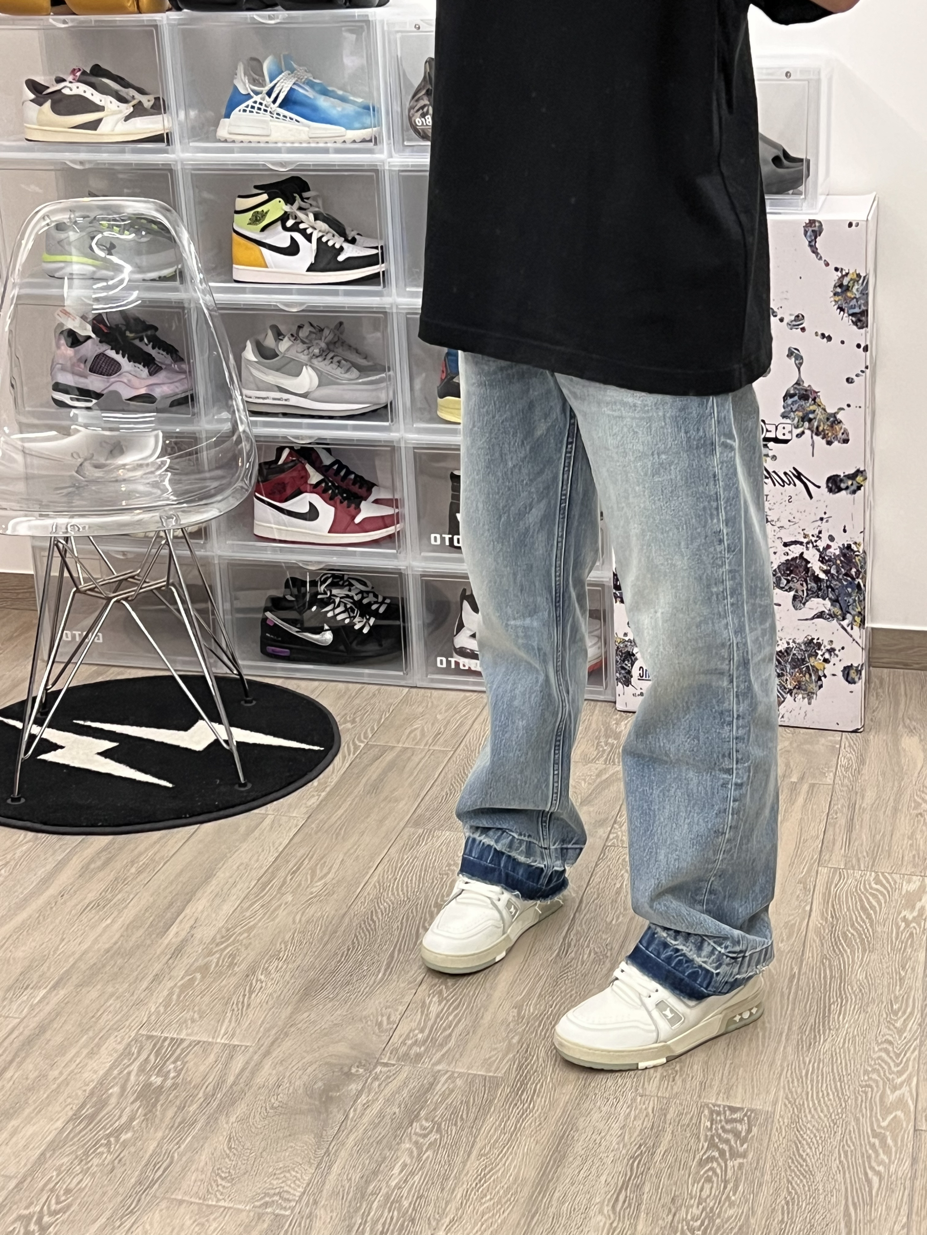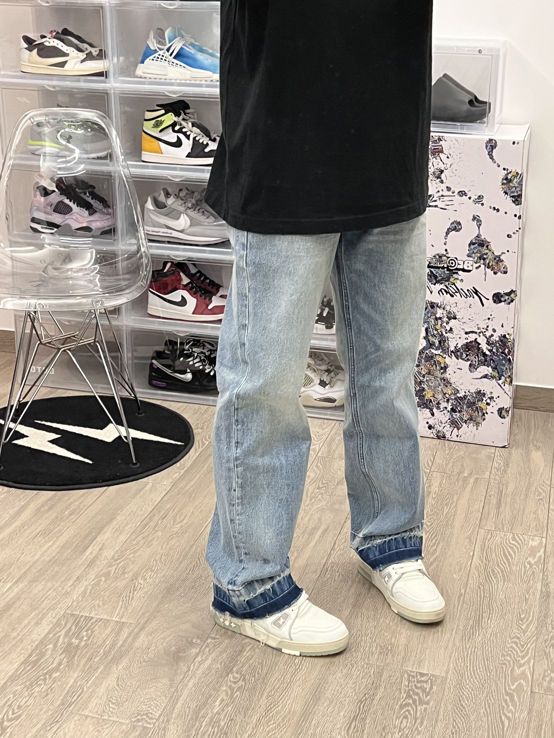 今日穿搭分享 👔上衣:巴黎世家短袖 👖裤子:Gremade Homme 直筒牛仔裤 👟鞋子:lv trainer 白水泥 下装 Gremade Homme 复古水洗蓝牛仔裤 高克数重磅面料 很厚实 硬挺有型 是我想要的感觉 裤腿流苏和拼接设计 高级感满满 版型方面178.144上身31的效果