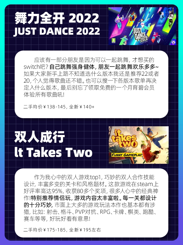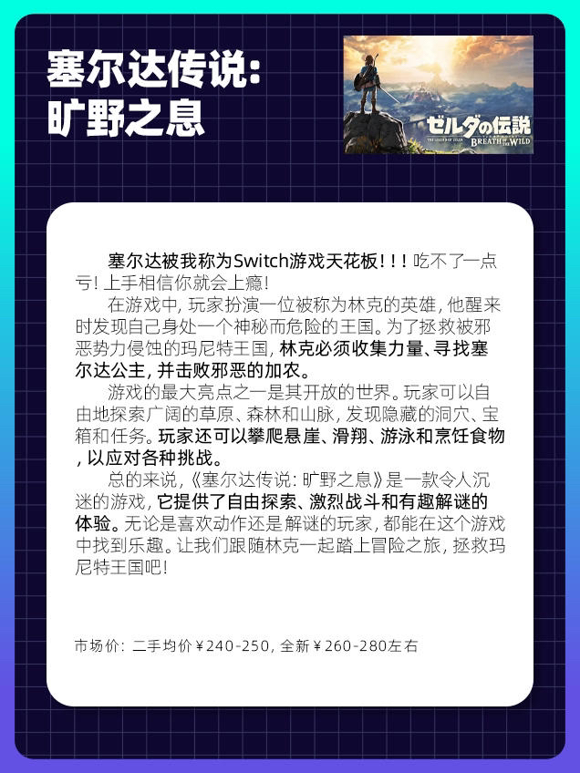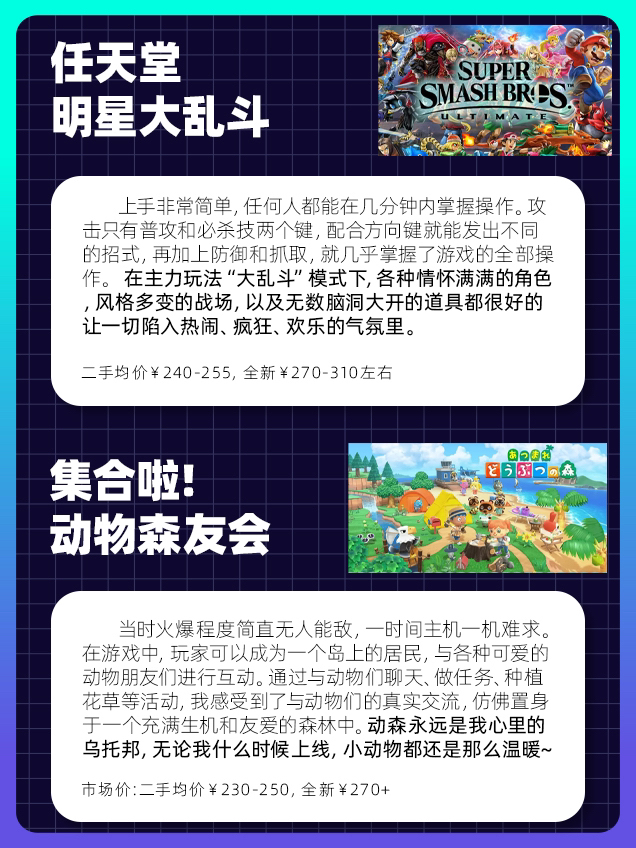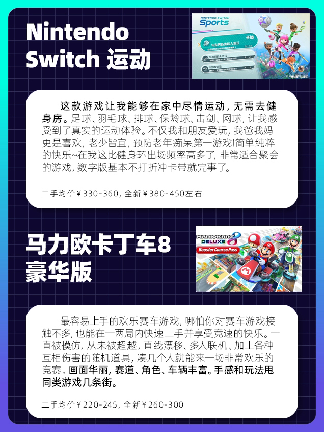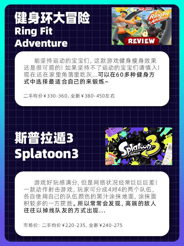 1、塞尔达传说:旷野之息 2、集合啦!动物森友会 3、任天堂明星大乱斗 4、健身环大冒险Ring Fit Adventure 5、斯普拉遁3 Splatoon3 6、星之卡比 探索发现 7、路易吉洋馆3 Luigi's Mansion3 8、Nintendo Switch 运动 9、马力欧卡丁车8 豪华版 10、超级马力欧派对 Super Mario Party 11、超级马力欧奥德赛 12、舞力...