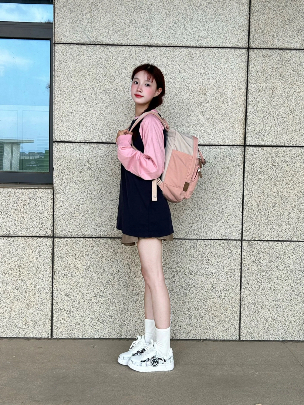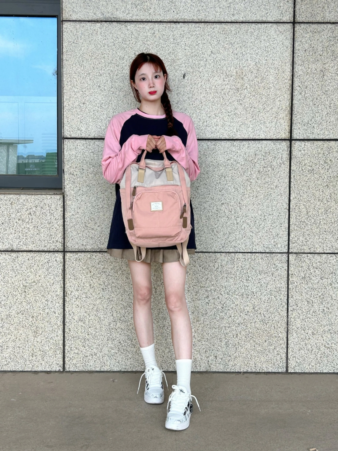 今天穿 蓝+粉拼接长袖+ 卡其色短裙+ MYD冰淇淋系列 书包 +双肩包+电脑包 这款冰淇淋系列配色真的太可啦 粉色+浅白+灰色简直不要太粉嫩啦小女生超爱 而且别看这款书包颜值这么高!容量也是超级大!!能容纳好多东西呀而且内还有夹层!!太爱啦