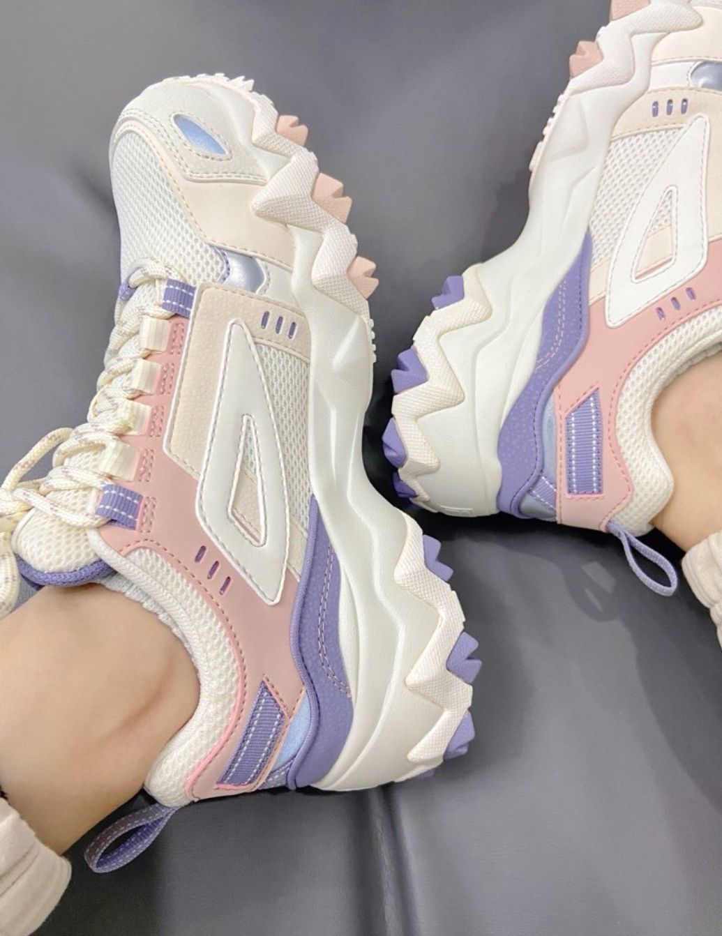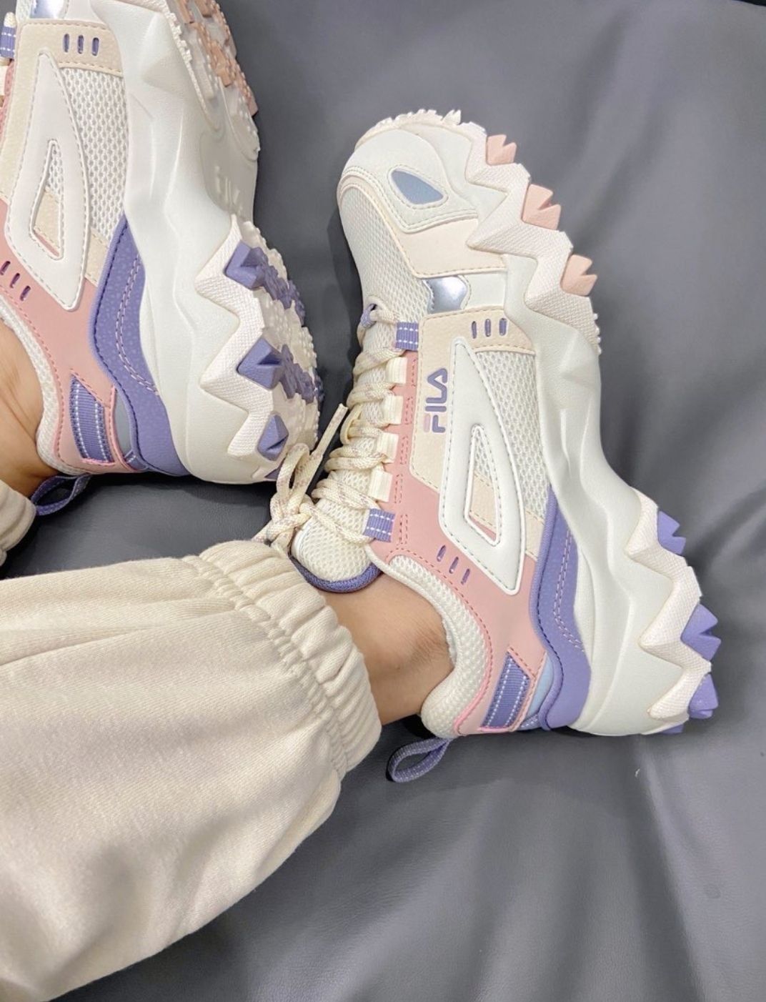 斐乐征峰者烟玫色 鞋子配色非常可爱,紫色+粉色简直太可爱了。鞋型是老爹鞋的外观,设计外观上脚很百搭。 鞋子中底摸起来很软,上脚舒适。 增高效果也很好,秒增56厘米。相加比超高的老爹鞋