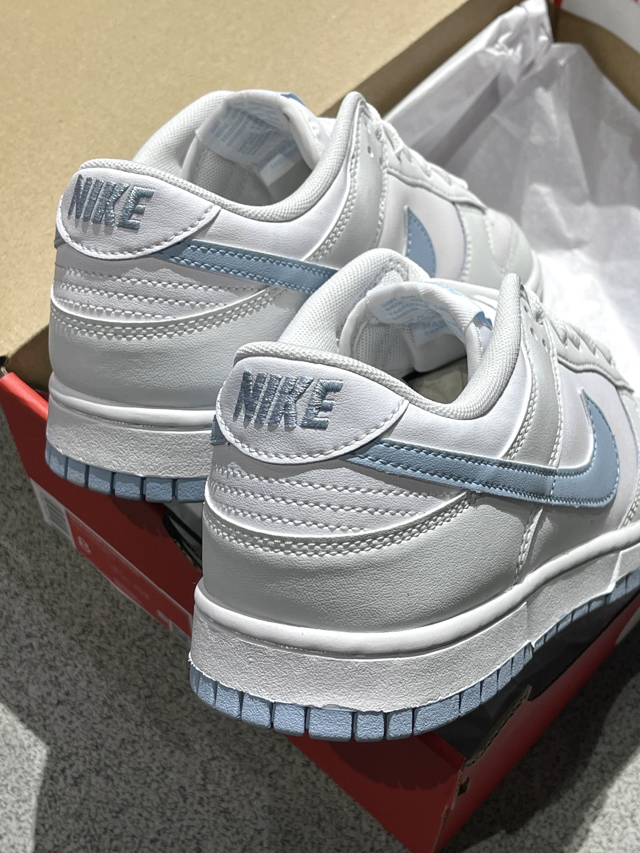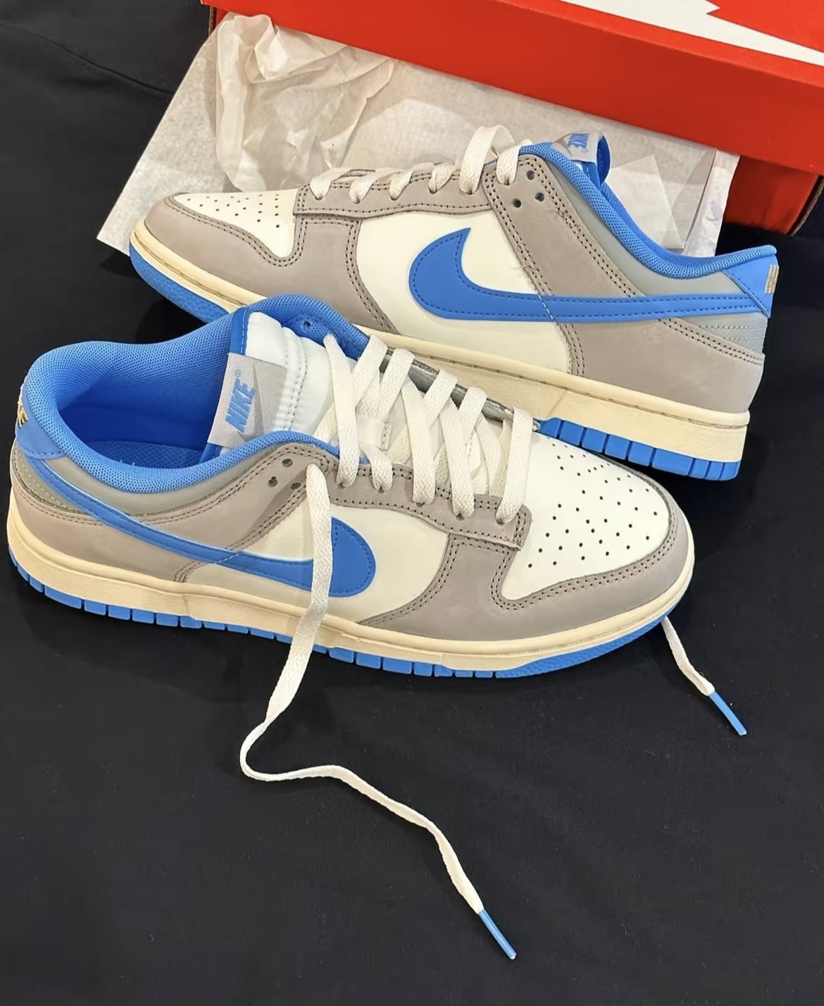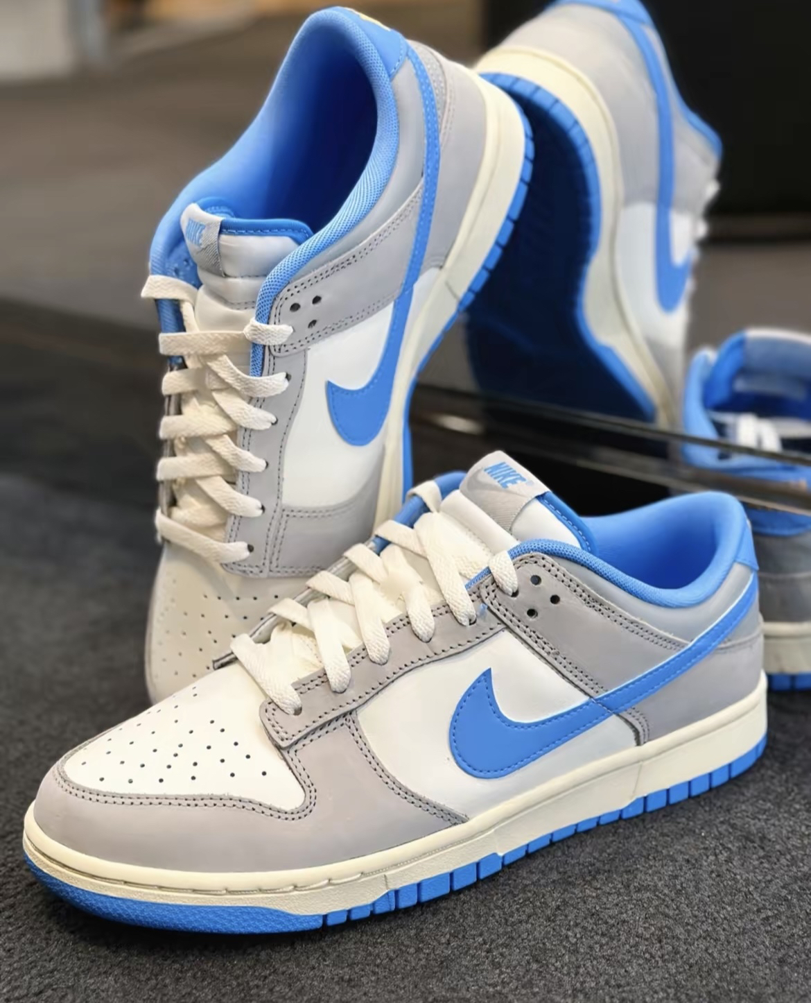 🛒好物名称::NIKE DUNK LOW复古天空蓝 🤔推荐理由:NIKE DUNK LOW[复古天空蓝〕 乡鞋面为双材质拼接!一种是皮革 另一种是偏磨砂的材质 !非麂皮噢 整体的耐久耐用还是蛮高的质感也超级高!型颜色方面是灰白蓝为主广灰色作为框架 0天蓝色点缀 颜色在服装搭配上会比较轻松 长裤短裤都好看!兄弟们快冲吧!