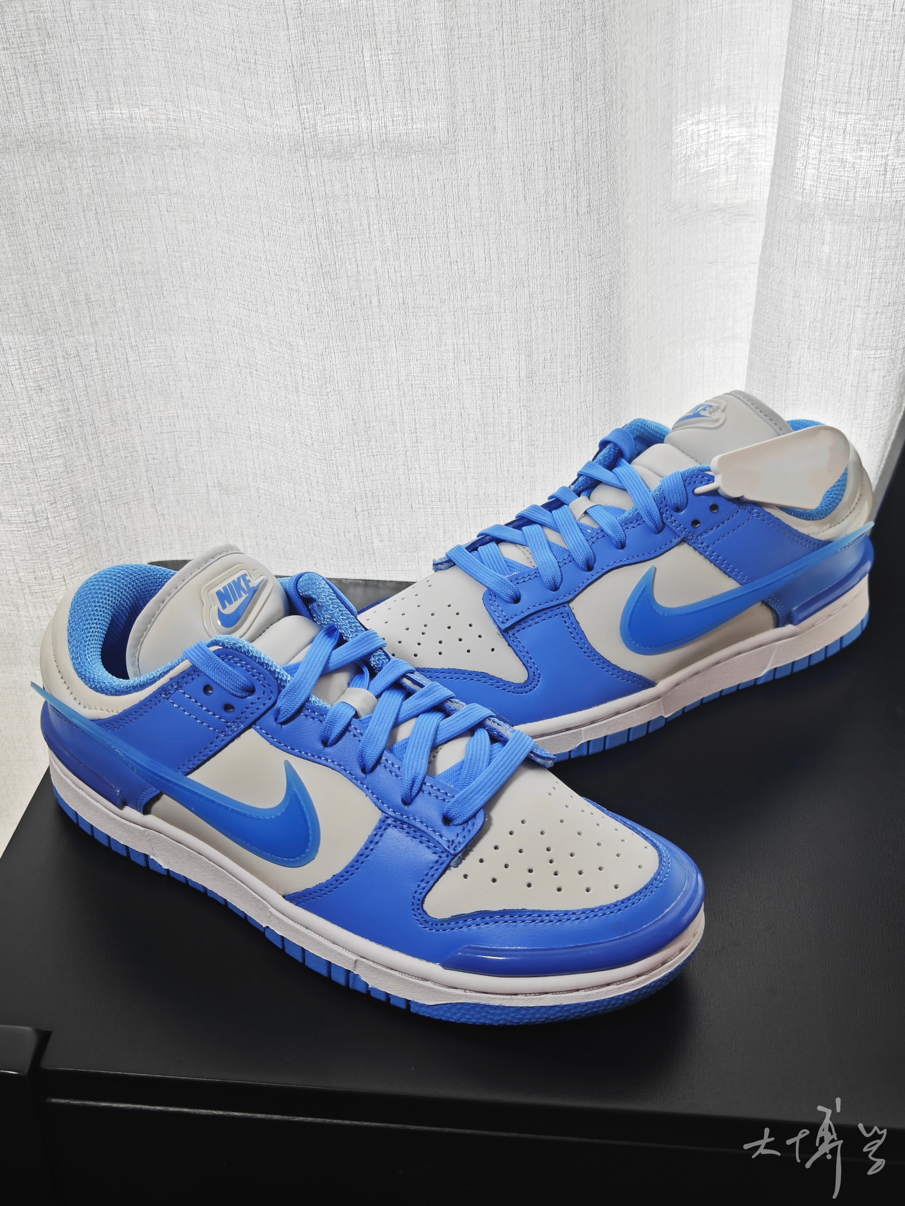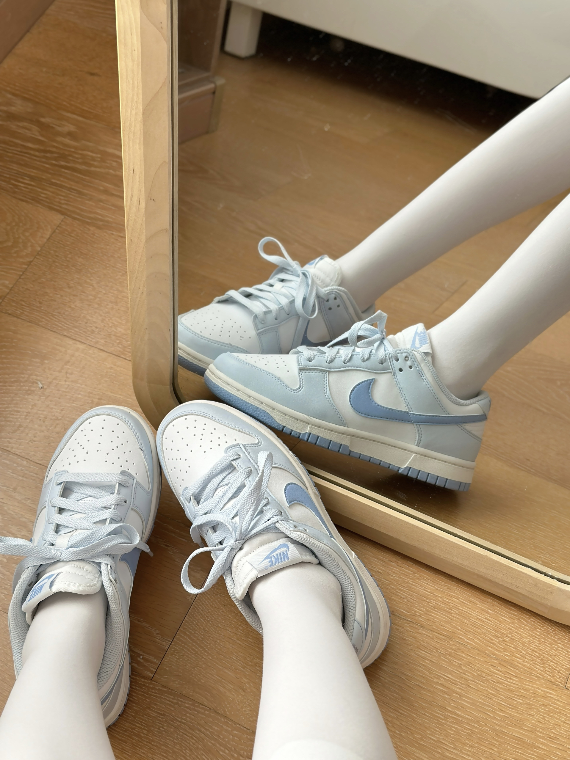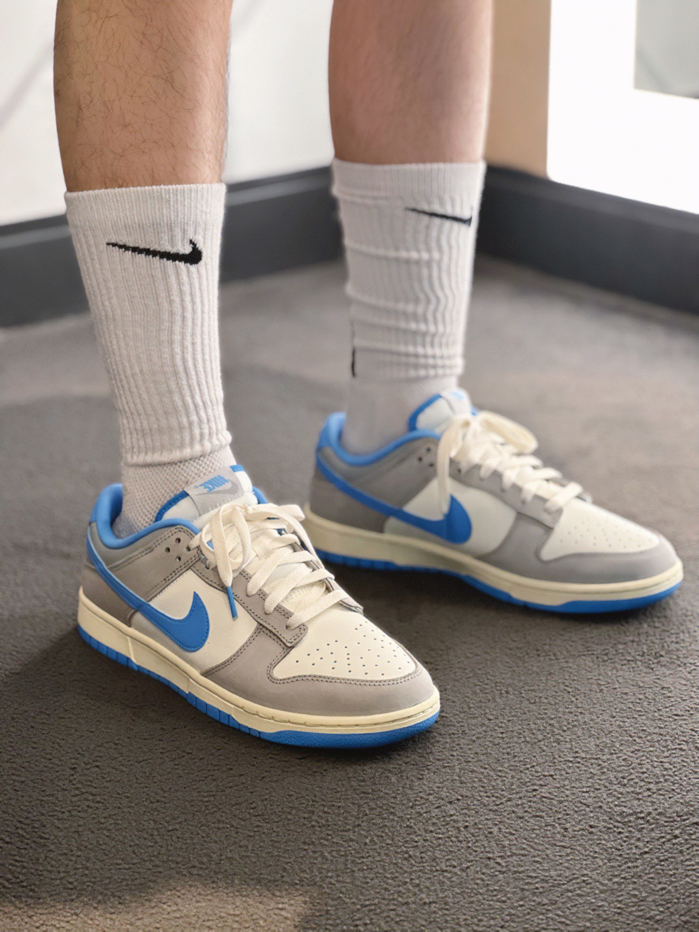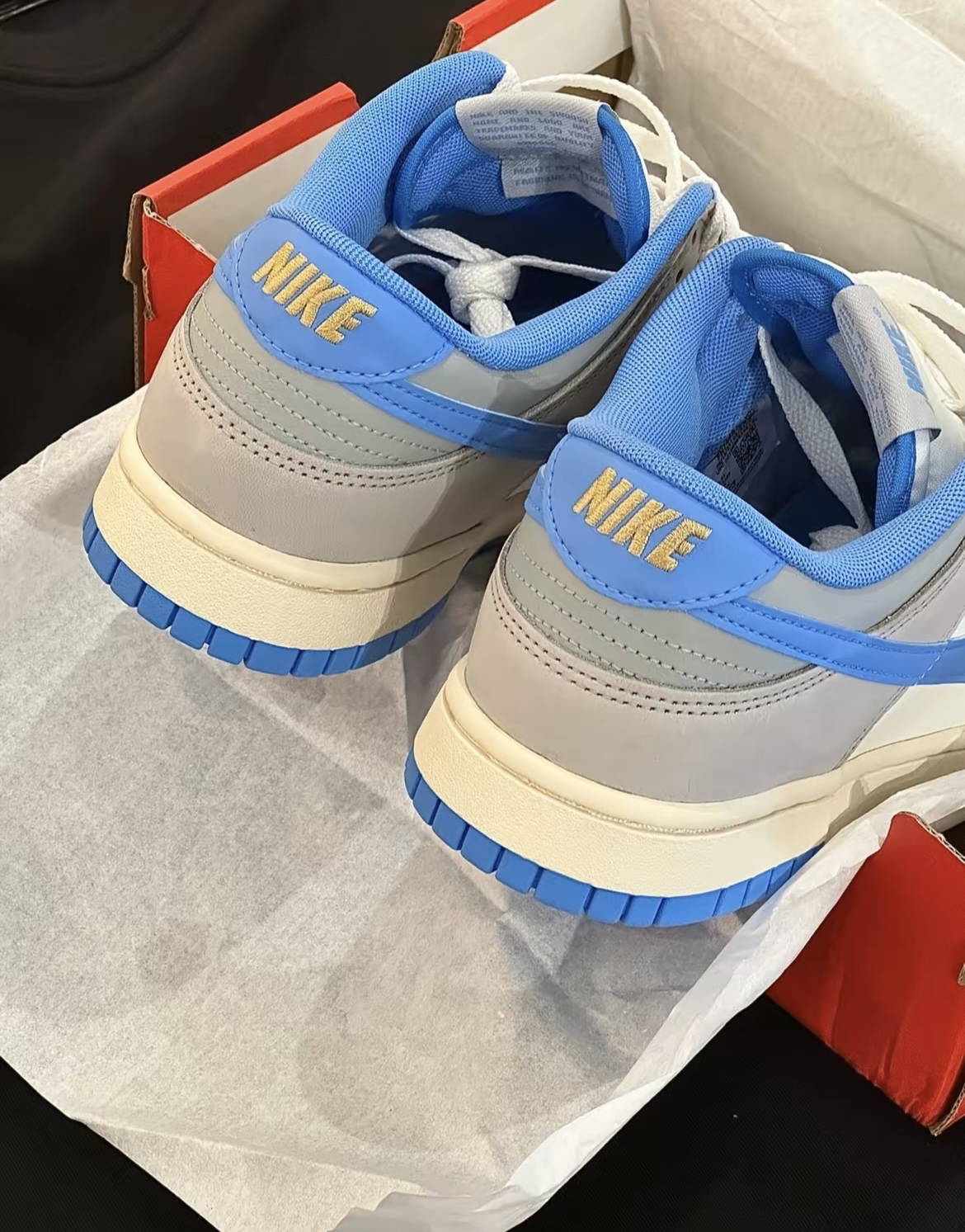 🛒好物名称::NIKE DUNK LOW复古天空蓝 🤔推荐理由:NIKE DUNK LOW[复古天空蓝〕 乡鞋面为双材质拼接!一种是皮革 另一种是偏磨砂的材质 !非麂皮噢 整体的耐久耐用还是蛮高的质感也超级高!型颜色方面是灰白蓝为主广灰色作为框架 0天蓝色点缀 颜色在服装搭配上会比较轻松 长裤短裤都好看!兄弟们快冲吧!