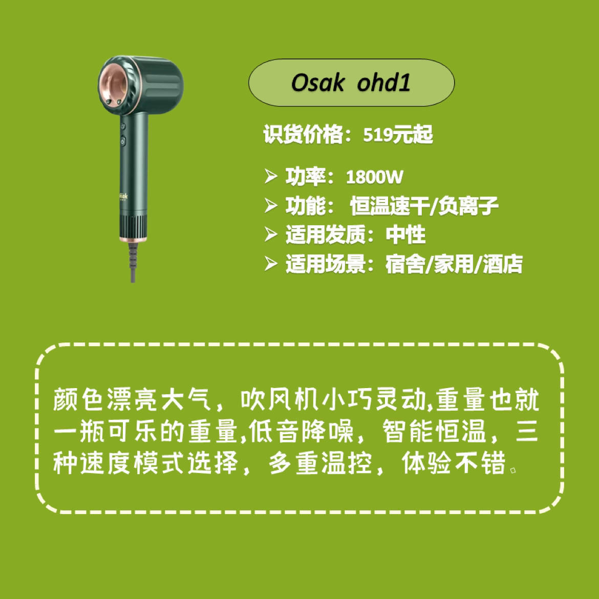 本篇笔记关联了osak 电吹风 速干 负离子护发 大功率 玛瑙绿、Philips/飞利浦 BHD720 电吹风 负离子护发 高速大风力 不伤发 大功率 速干 水离子 恒温 低噪 空气水疗 磁吸式 绝绝紫+磁吸风嘴、dreame/追觅 AHD5 电吹风 速干负离子 恒温 结婚礼盒 大功率 大风力 白色等商品,为用户提供真实的使用体验和购买参考。