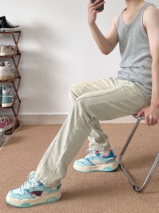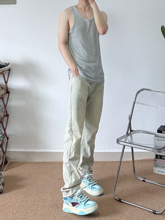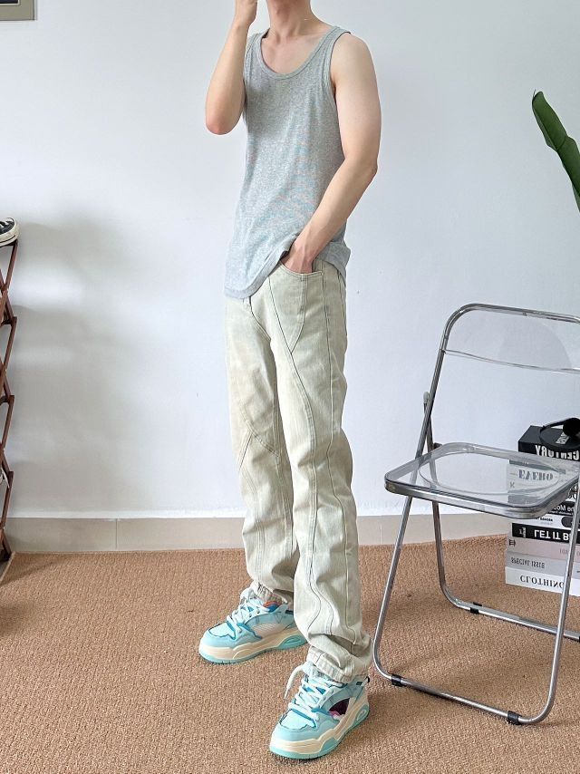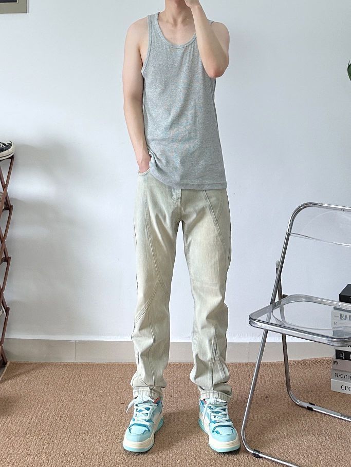 身高|体重: 🧍♂️ 穿搭风格: 👔 上衣:小背心 👖 下装:URSGGON黄泥立体解构牛仔裤 👟 鞋子:相当哇塞的小蓝鞋 兄弟们,裤子是真的帅,上身效果真的绝了