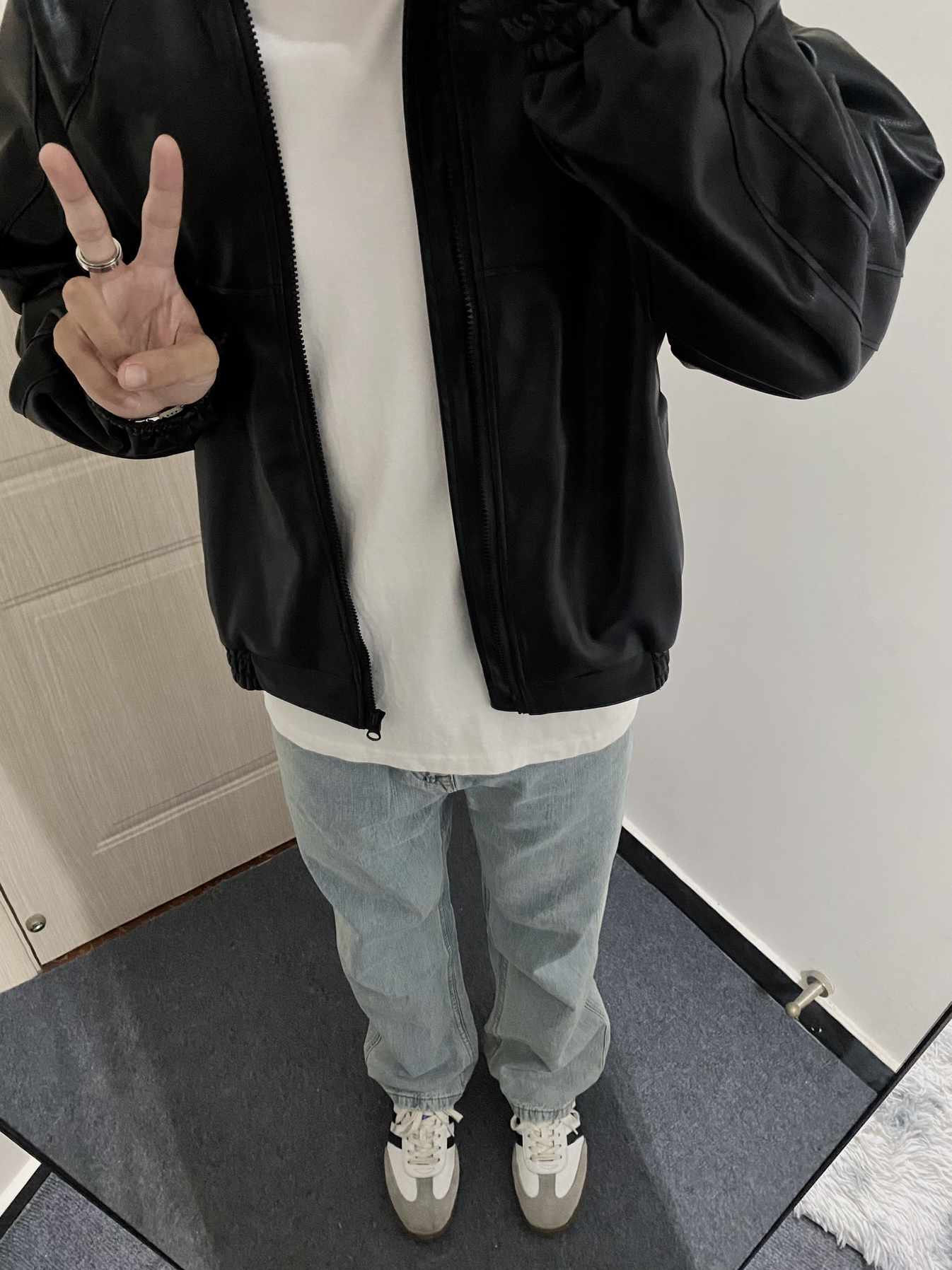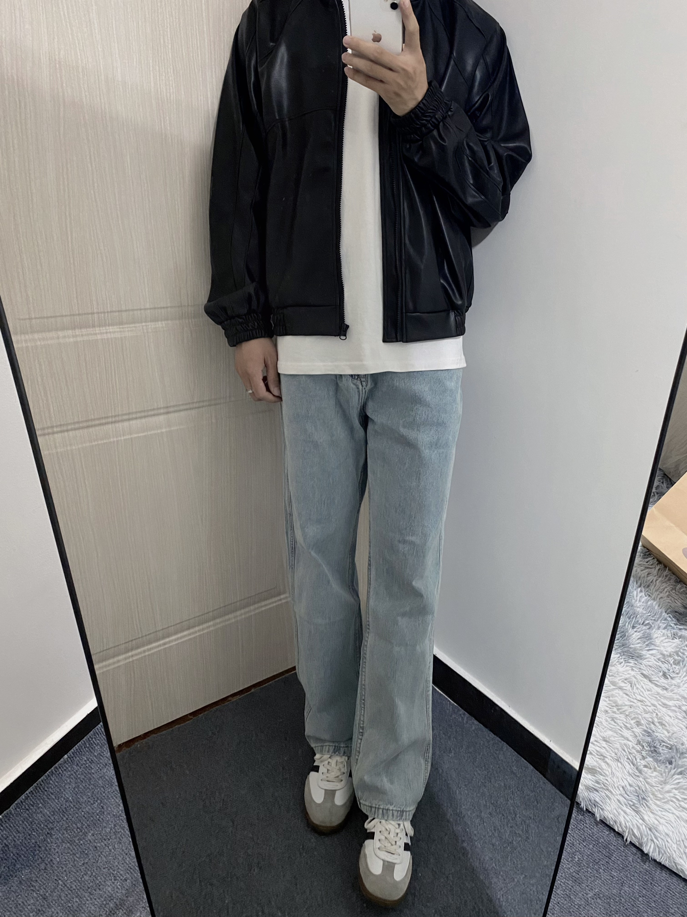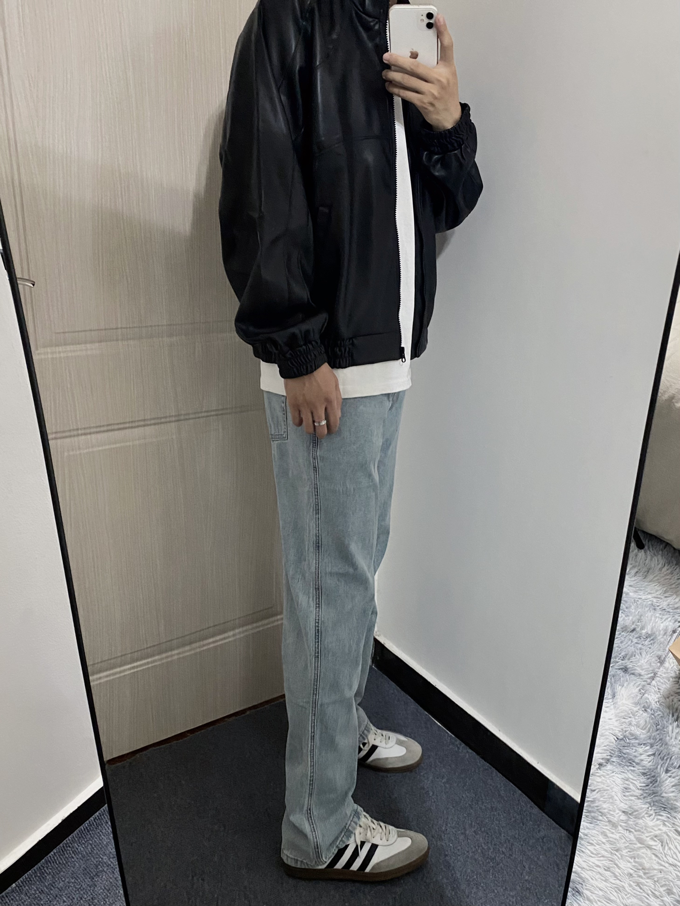 上身一件黑色皮衣外套,内搭一件白T 版型硬挺,有Cleanfit的感觉,简约好看 搭配一条浅蓝色牛仔裤,微喇版型显高显瘦 一整套简约干净,又好看😋