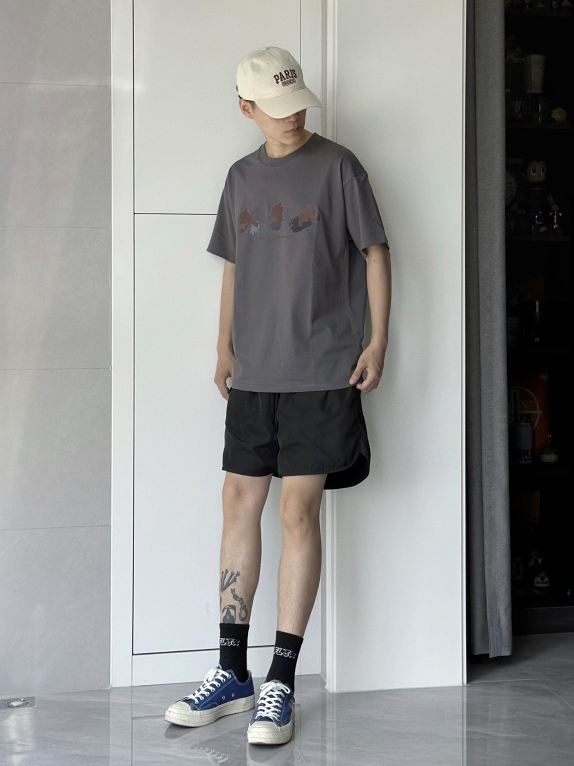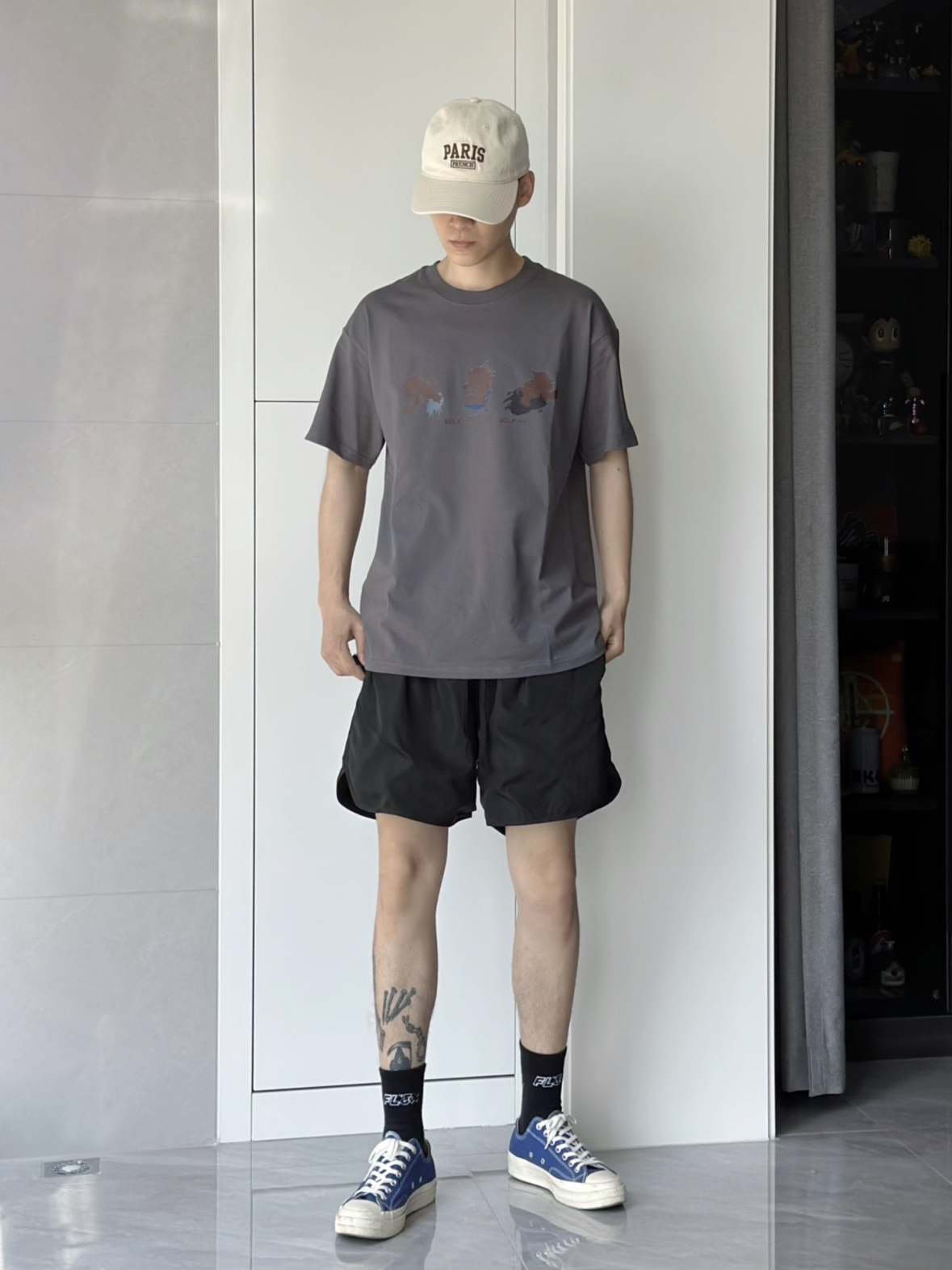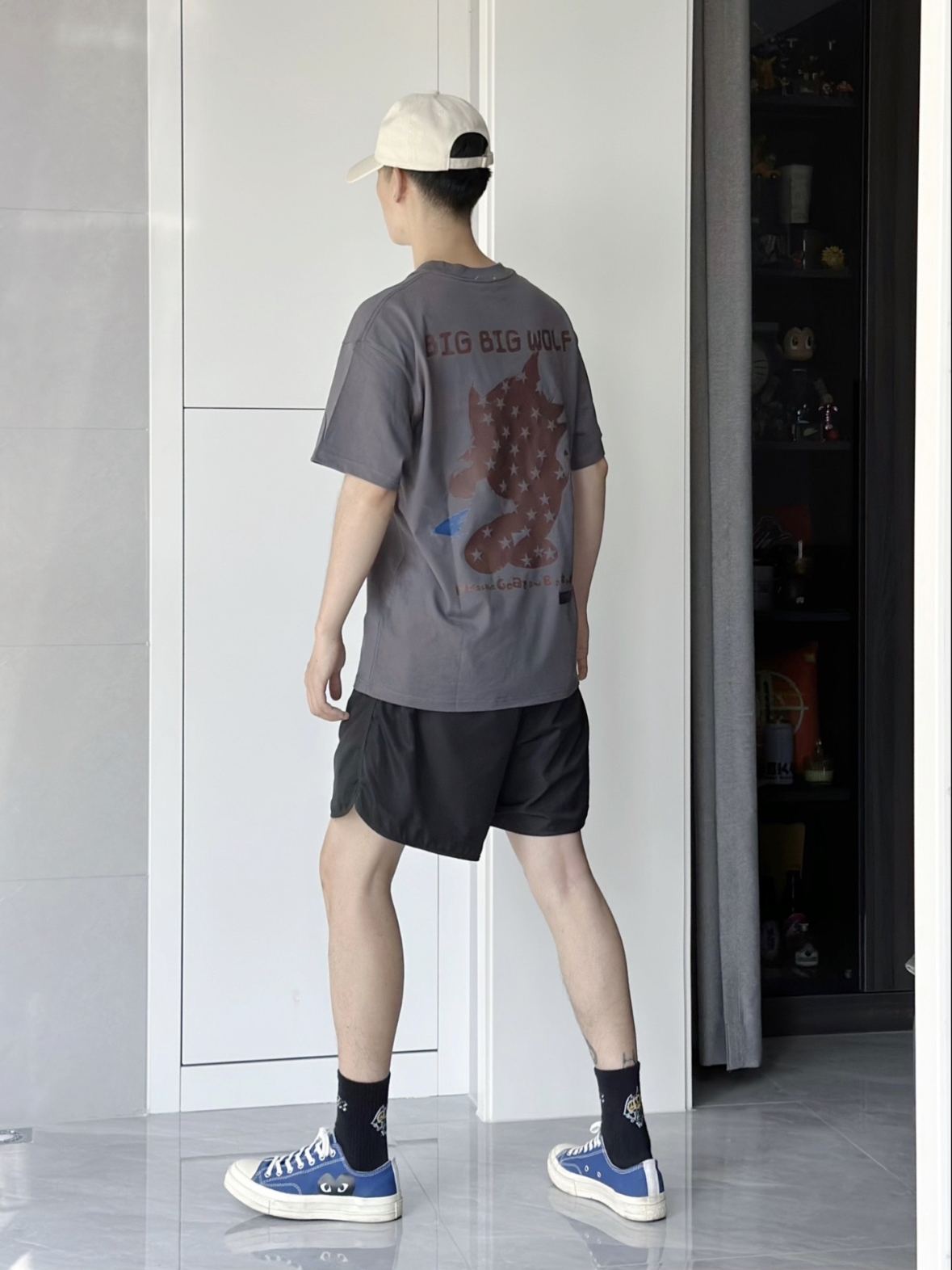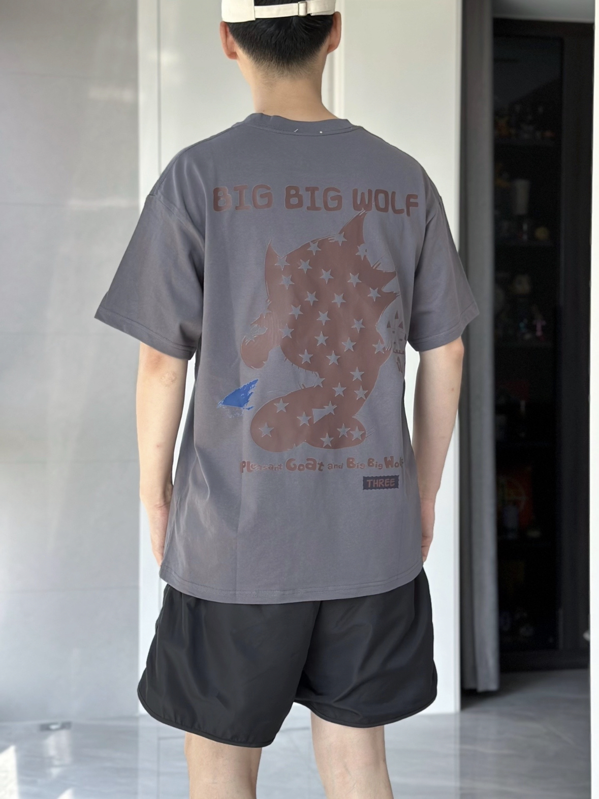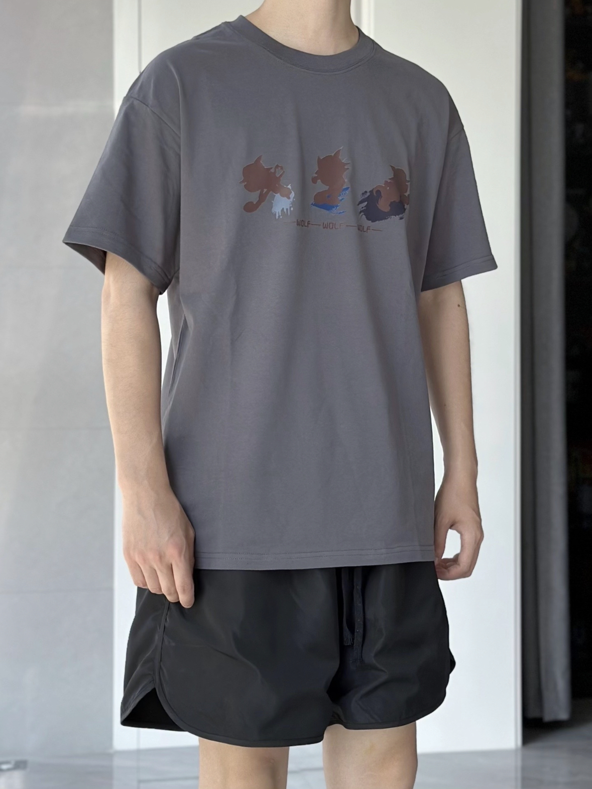 夏天就是喜欢买买买短袖 最近喜欢灰色 低调又好搭配的选择 可可爱爱的喜羊羊与灰太狼 hhh 版型面料都挺不错 上身就很nice 搭配上一条黑色短裤 简简单单 再随便穿上一双帆布鞋 不错子 身高 175 体重 63 L码就蛮宽松了