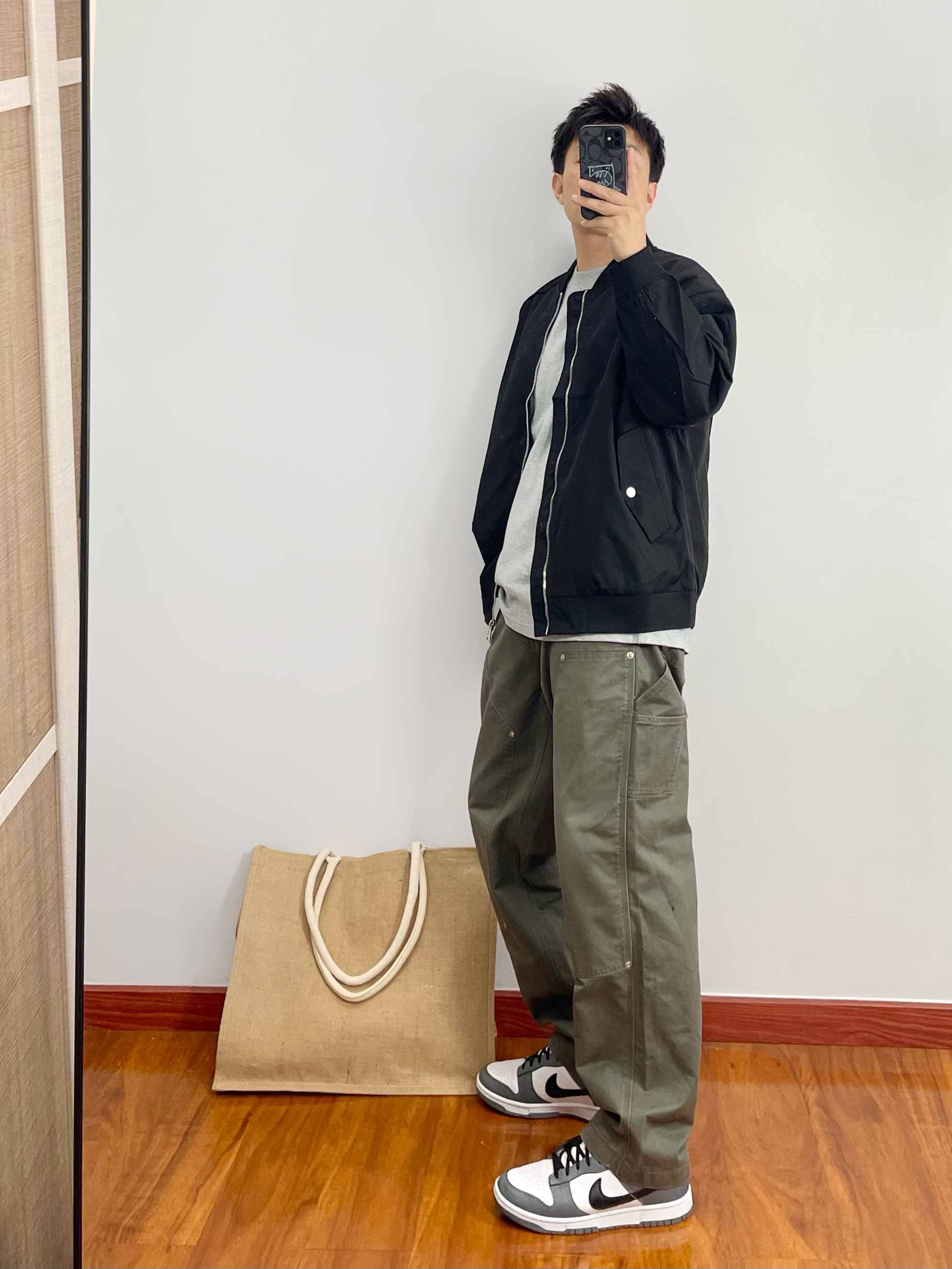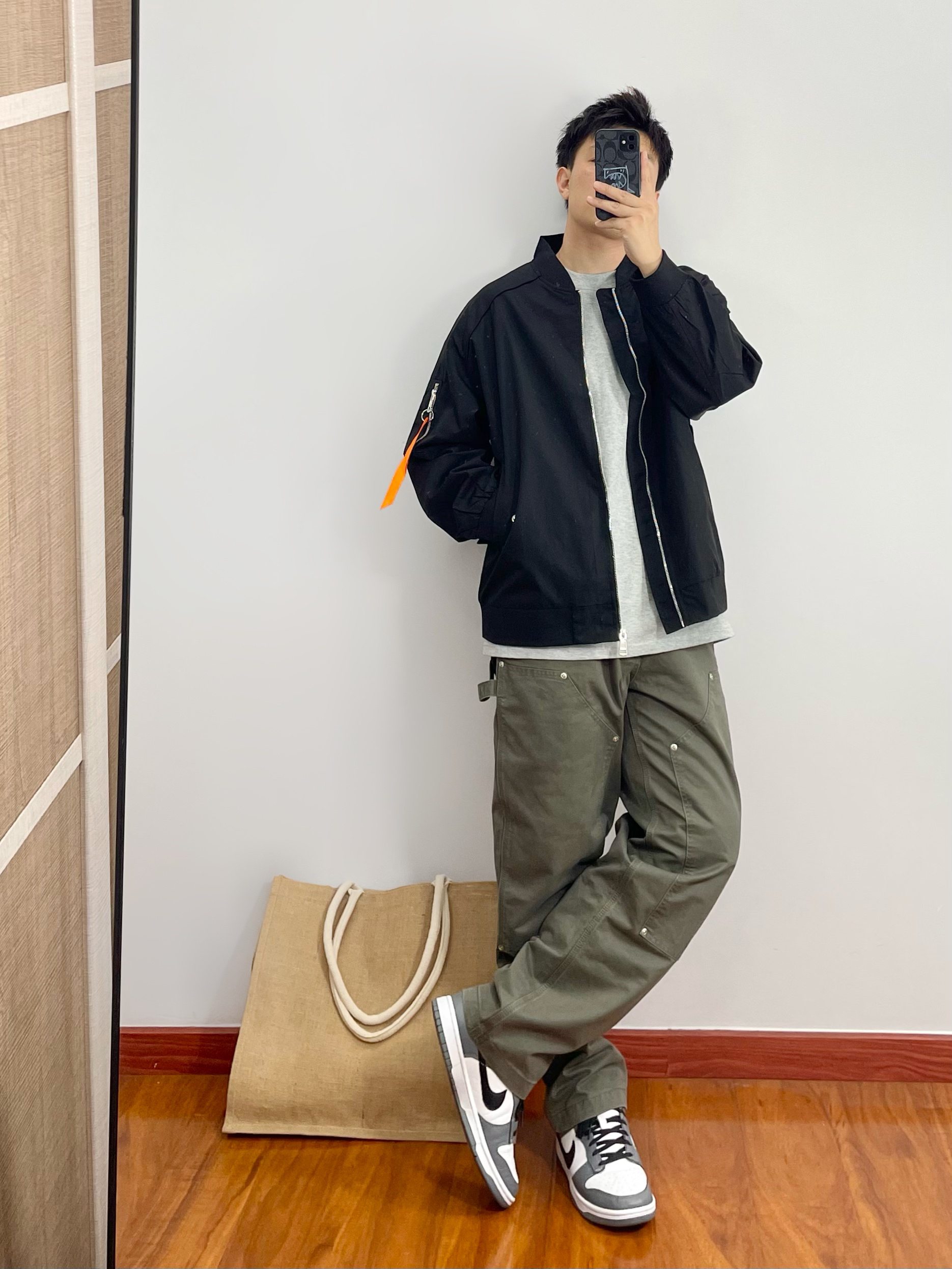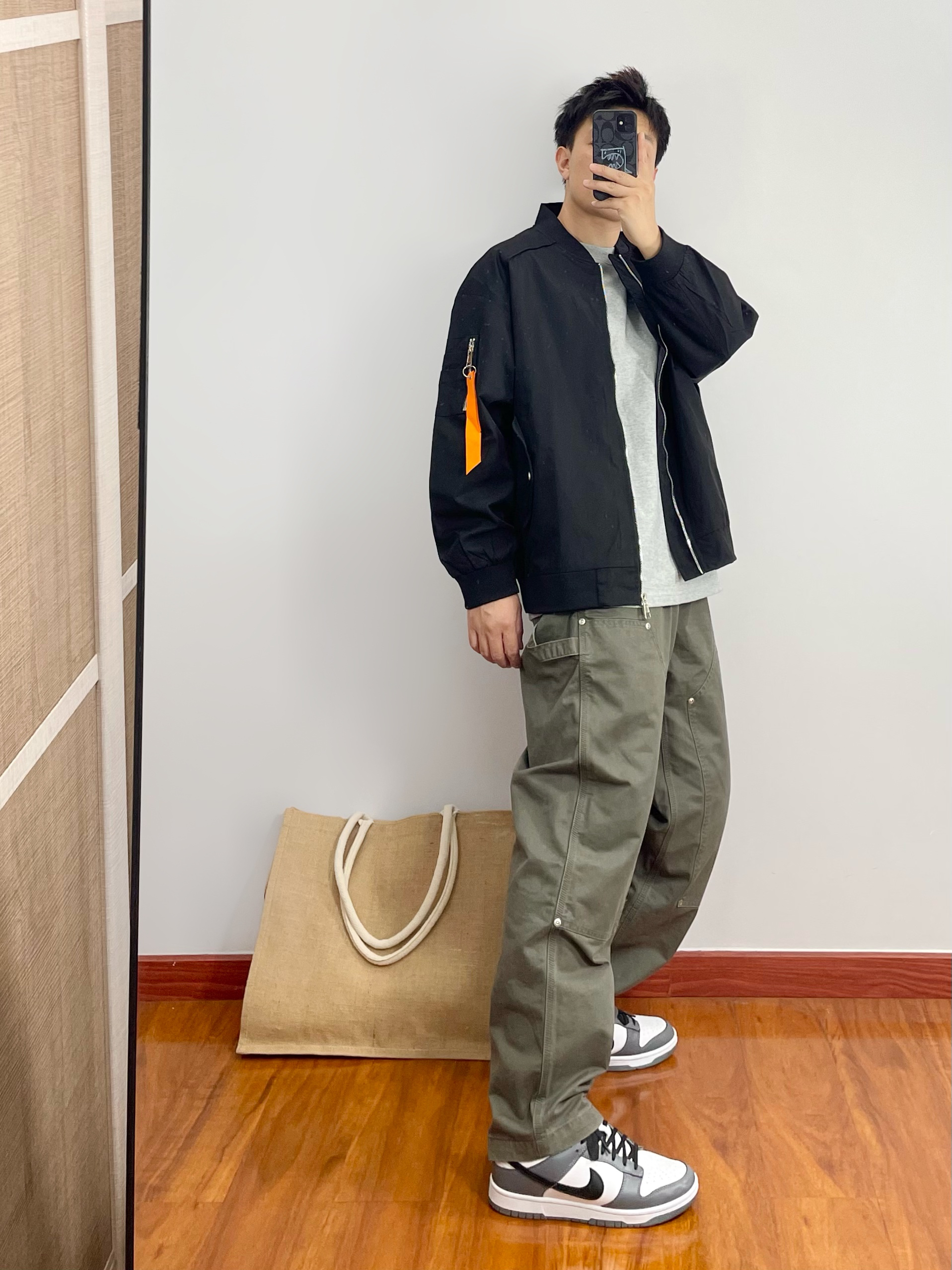 👕:IGOI 纯色的秋装飞行夹克,经典款式简单帅气,橙色的飘带是亮点让简约的夹克却不简单,上身XL码宽松的效果。 - 👖: 双膝伐木裤,厚实面料裤型硬挺非常cleanfit,做旧的灰绿色越洗颜色越好看。 - 👟: Nike dunk - 170cm/67kg 分享男生的日常穿搭OOTD -