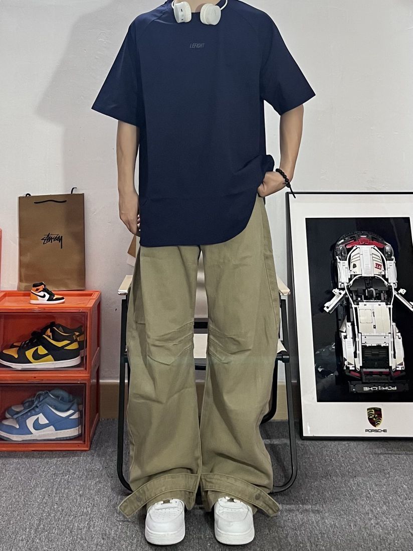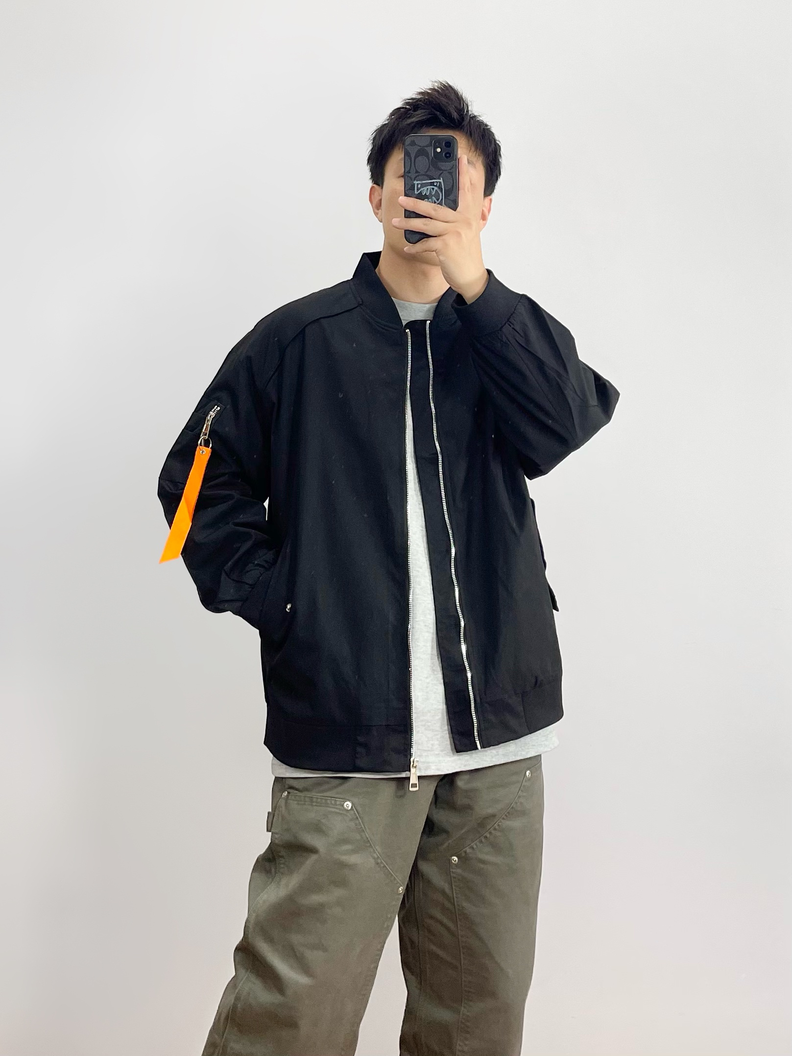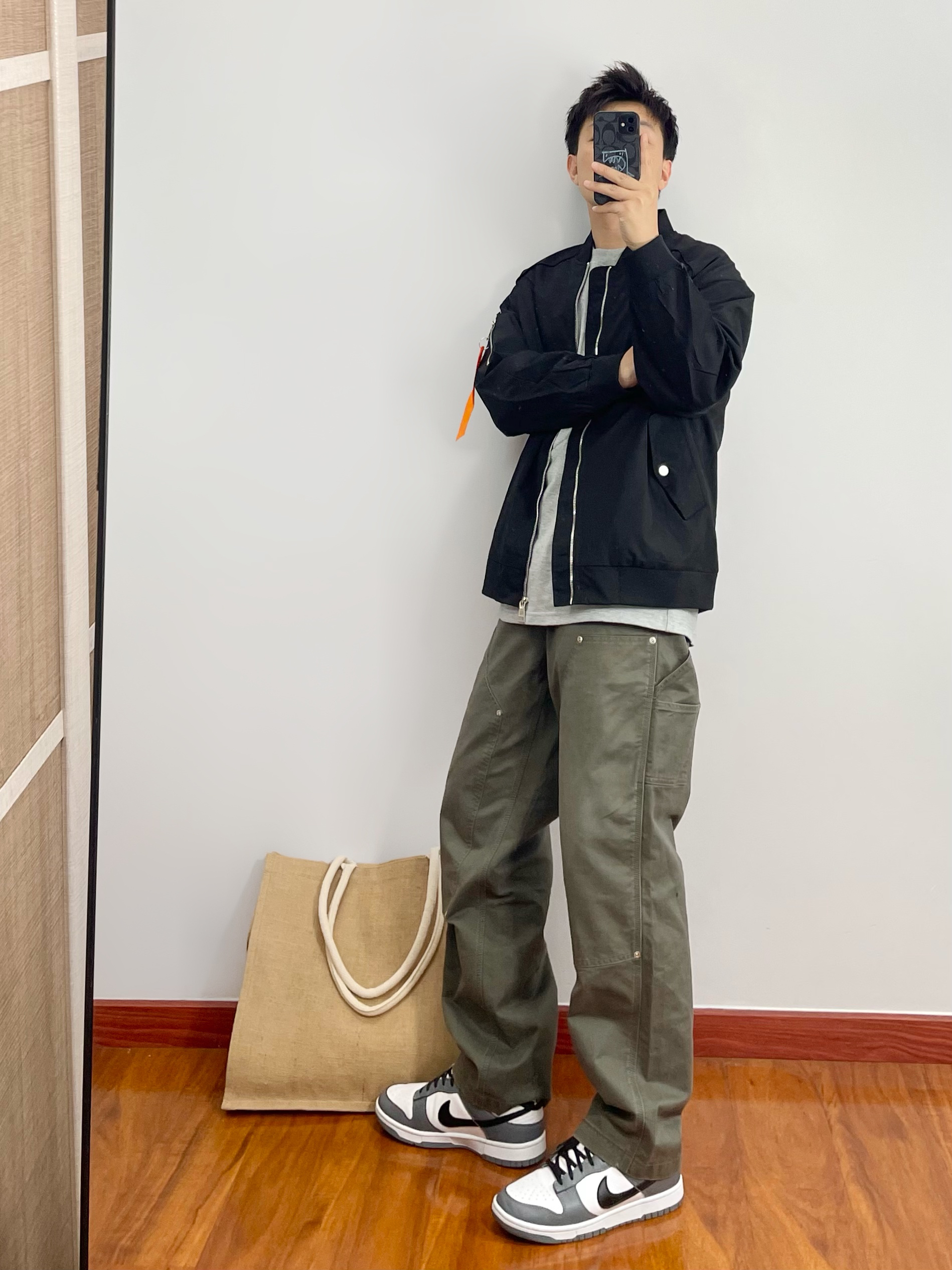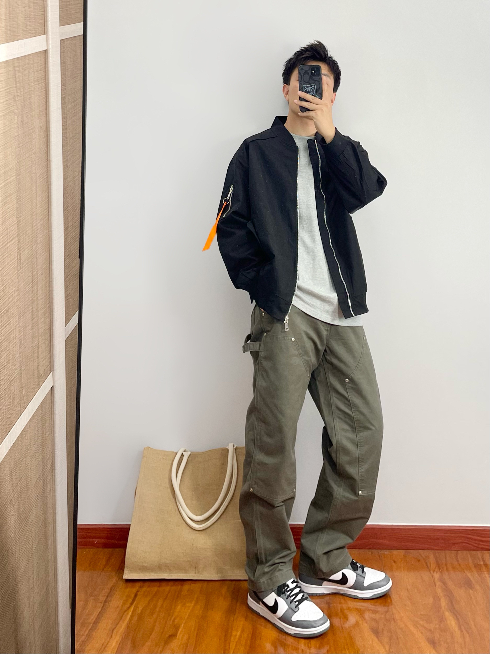 👕:IGOI 纯色的秋装飞行夹克,经典款式简单帅气,橙色的飘带是亮点让简约的夹克却不简单,上身XL码宽松的效果。 - 👖: 双膝伐木裤,厚实面料裤型硬挺非常cleanfit,做旧的灰绿色越洗颜色越好看。 - 👟: Nike dunk - 170cm/67kg 分享男生的日常穿搭OOTD -