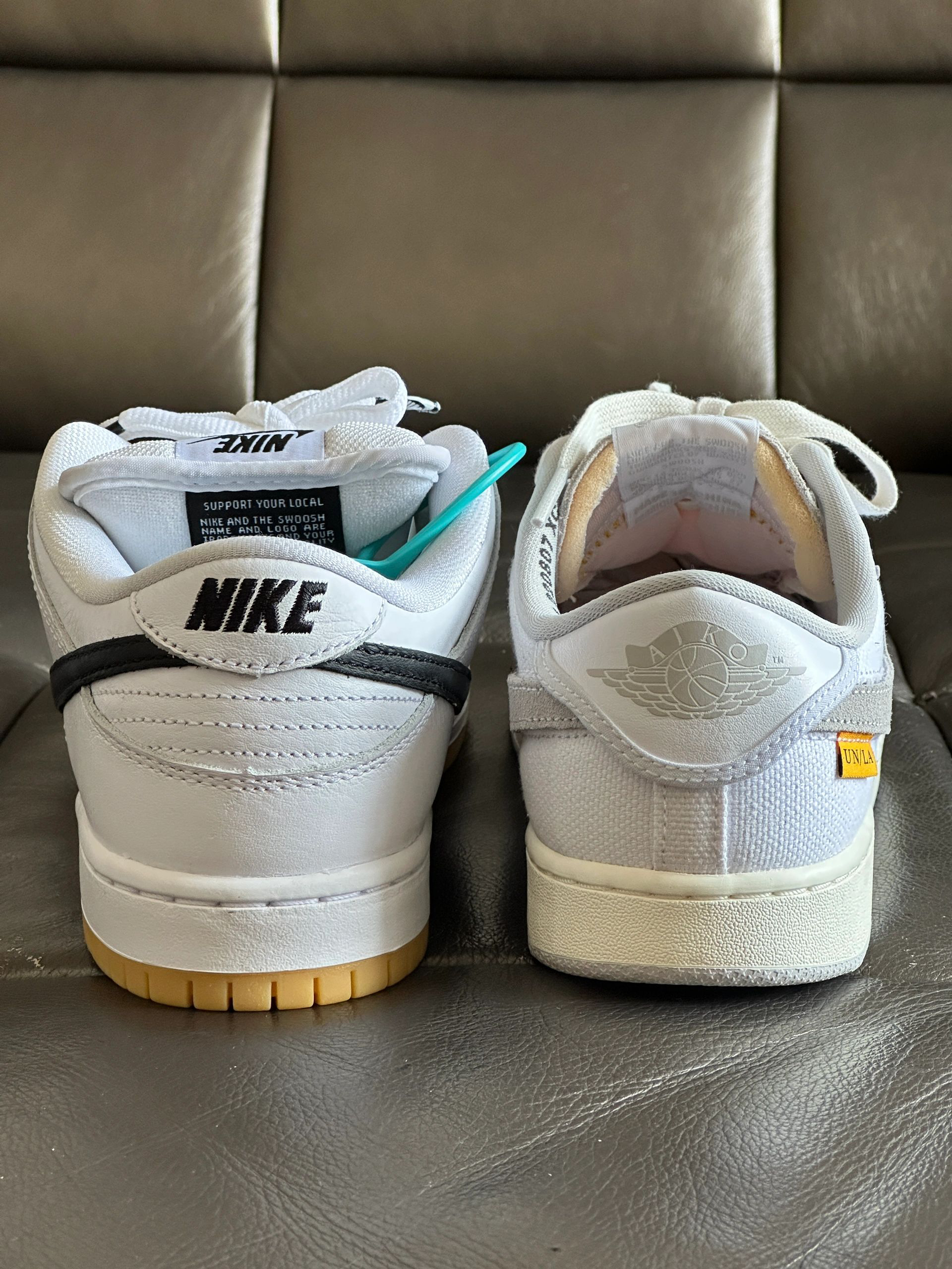 ▶我最爱的两双小白鞋你觉得颜值在线吗? ▶AJ Union联名和Dunk SB白生胶,目前不管是颜值还是价格我真的超满意!只是AJ Union只适合晴天🌞,白生胶雨天也OK! 材质用料方面Union使用了白色帆布,白生胶使用了头层牛皮革,这点我是更喜欢白生胶的,当然也更好打理! 鞋型方面我觉得不相上下,都好看! 脚感方面软硬度都差不多,union大底的弧形设计更跟脚一些,稍胜一筹! ▶尺码方面两双...