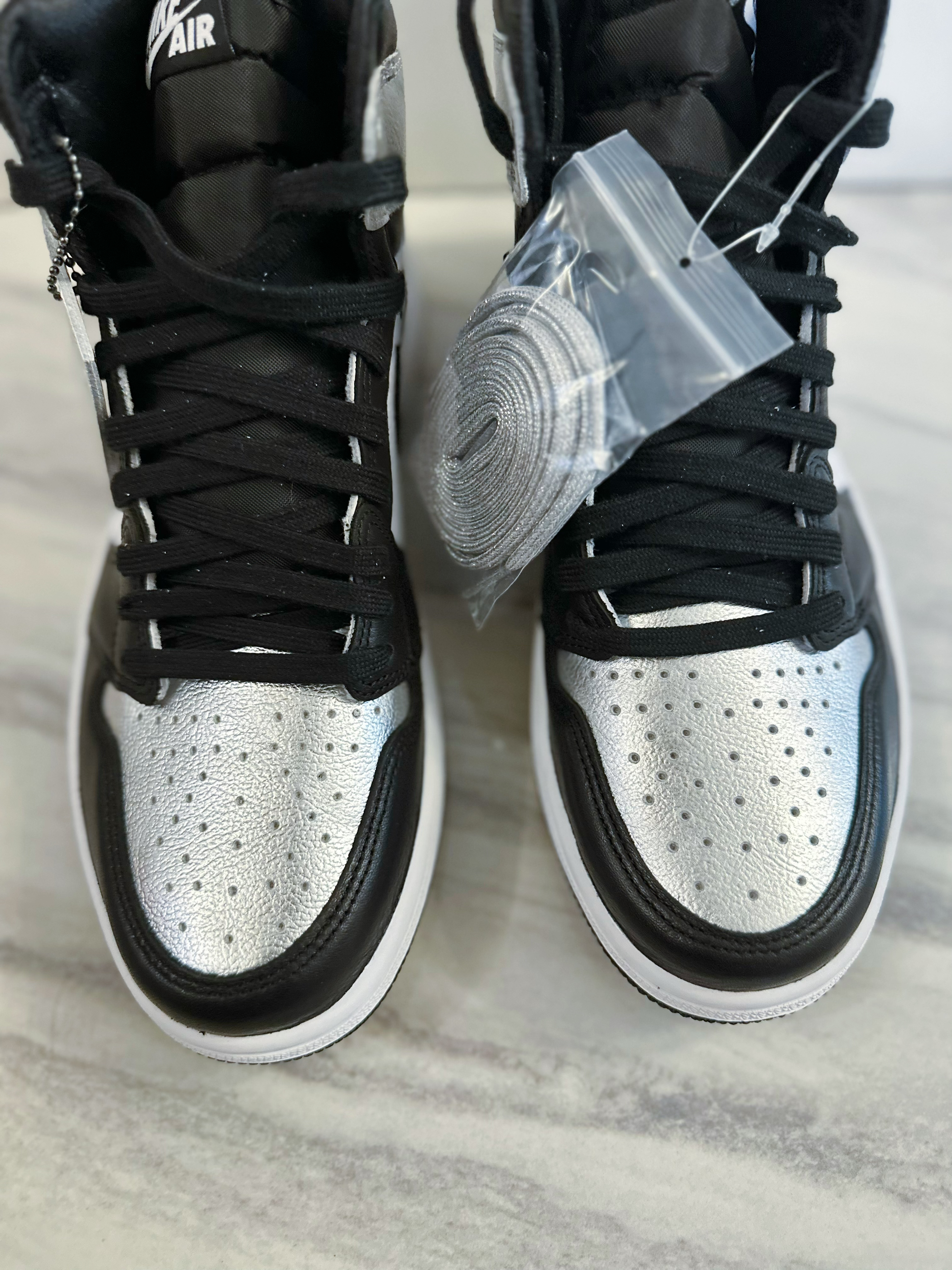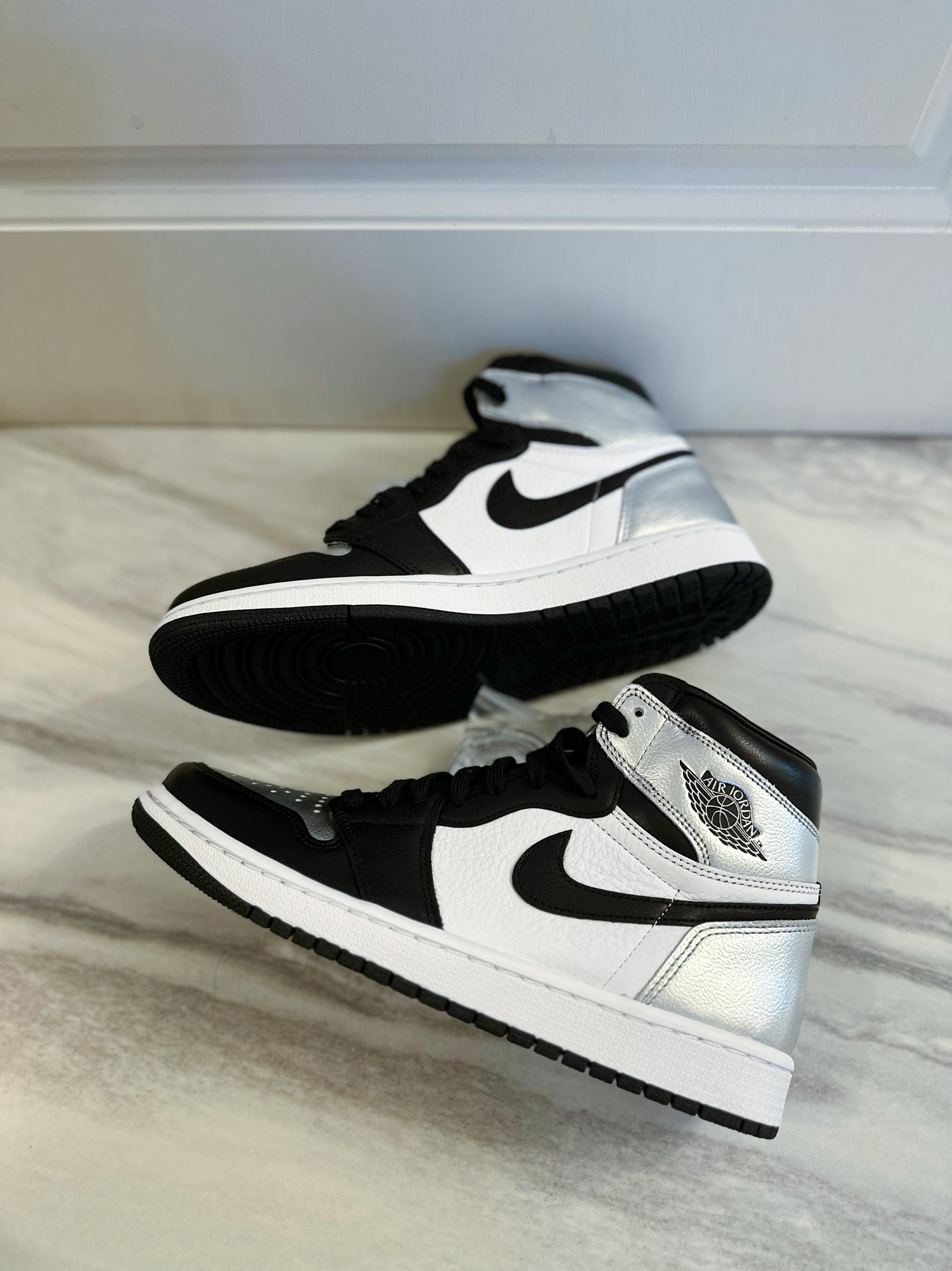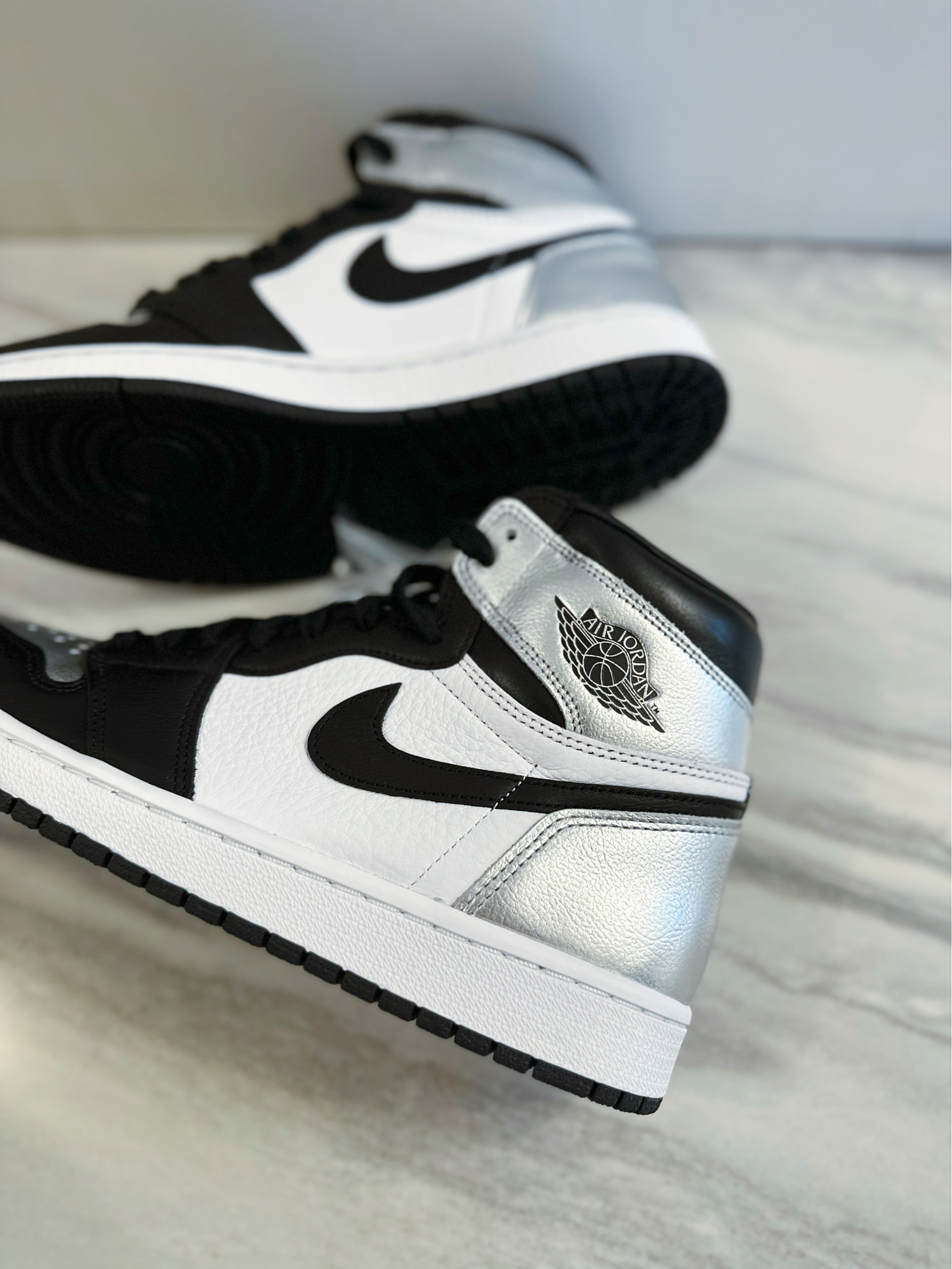 Air jordan 1的OG鞋型无论什么时候都非常经典百搭。这双黑脚趾的配色也很经典,鞋身是常规的牛剖层皮的材质,脚面和后跟是银色涂层。上脚舒适透气,高帮鞋型包裹性很好。亮银黑脚趾配色好看又百搭,就是银色涂层可能会掉漆,穿着之前可以做加固处理,整体做工和质量还是很不错的,尺码正常不偏码