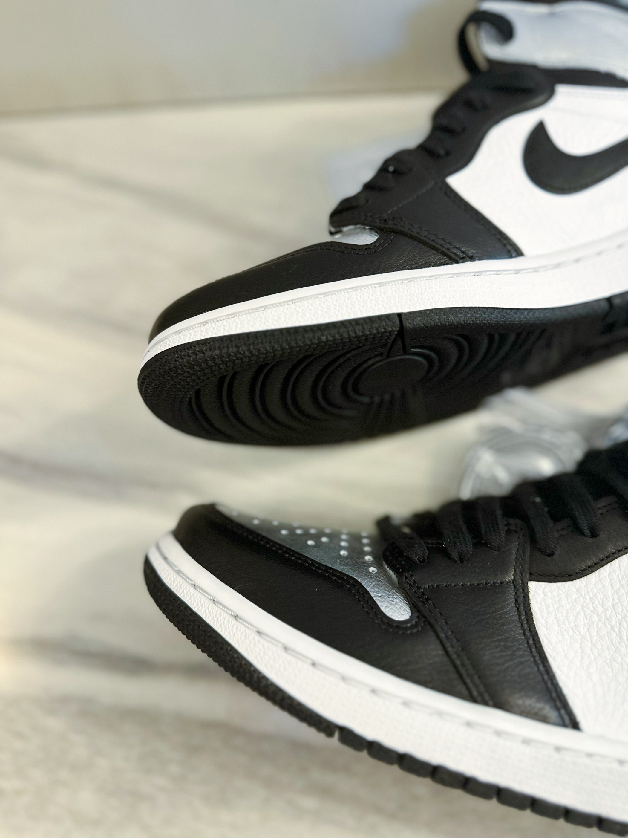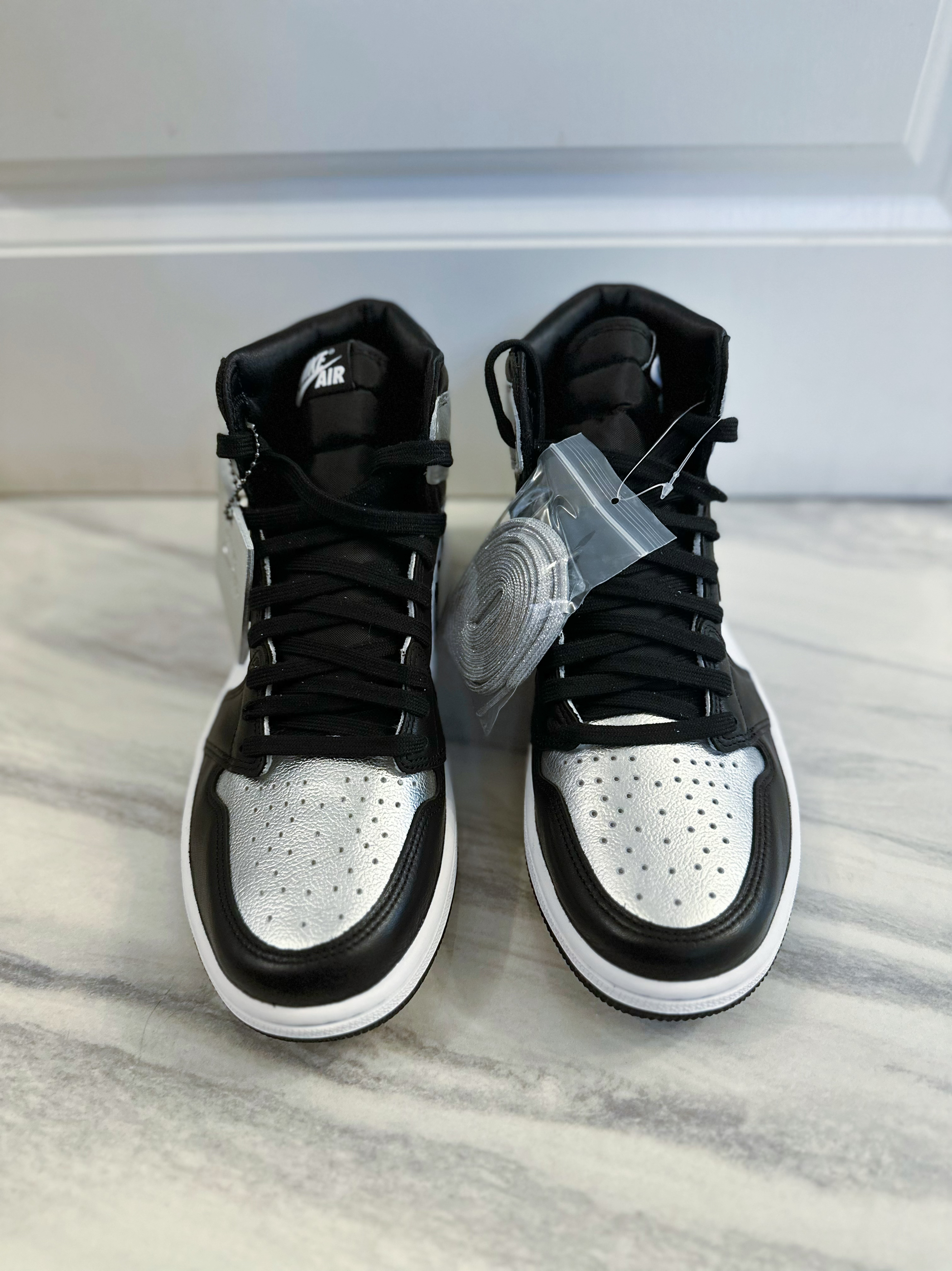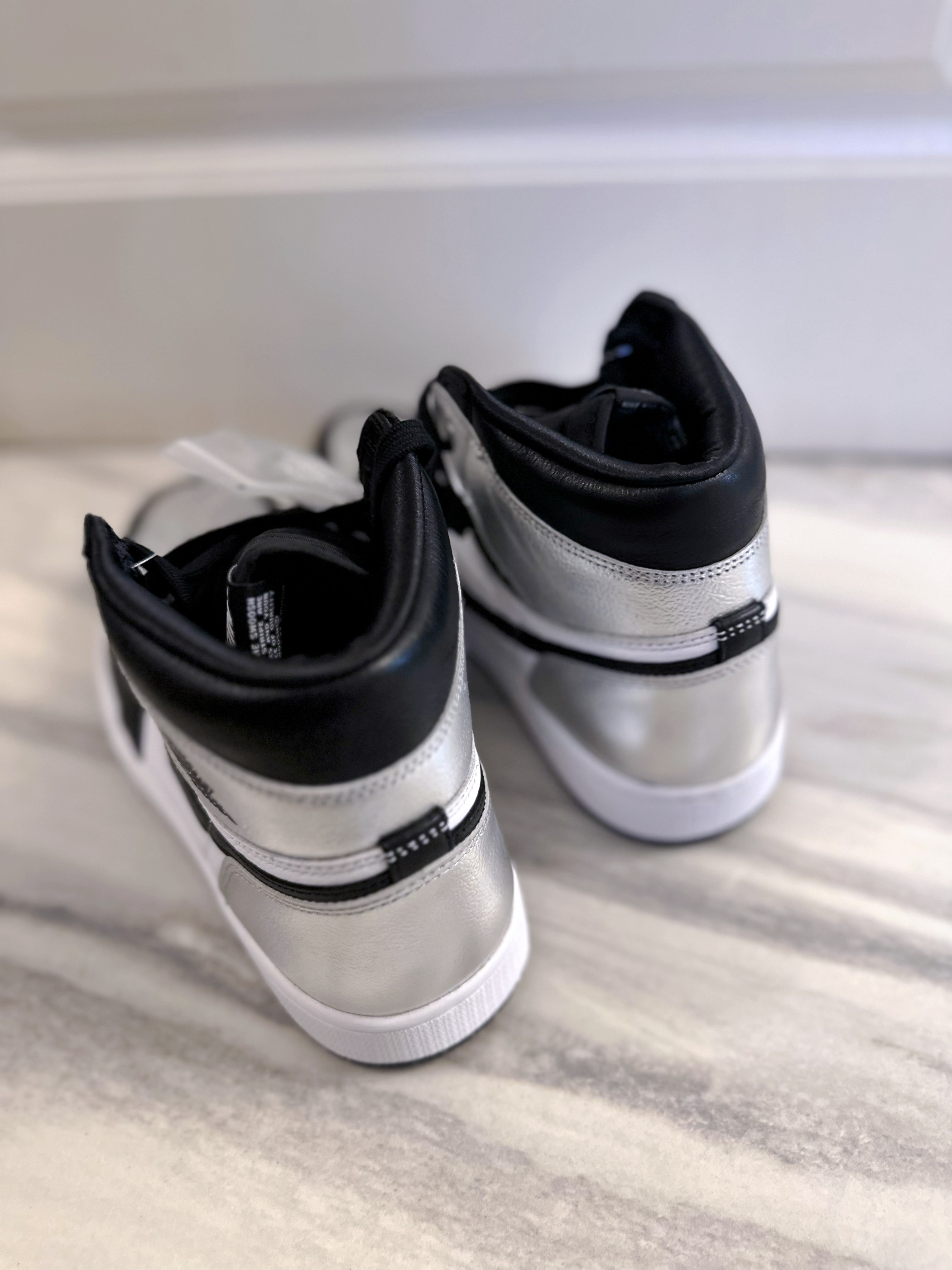 Air jordan 1的OG鞋型无论什么时候都非常经典百搭。这双黑脚趾的配色也很经典,鞋身是常规的牛剖层皮的材质,脚面和后跟是银色涂层。上脚舒适透气,高帮鞋型包裹性很好。亮银黑脚趾配色好看又百搭,就是银色涂层可能会掉漆,穿着之前可以做加固处理,整体做工和质量还是很不错的,尺码正常不偏码