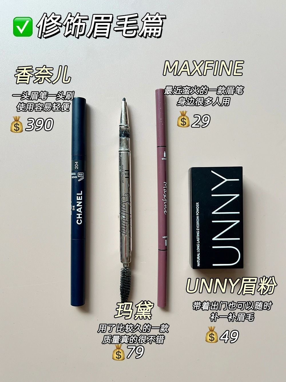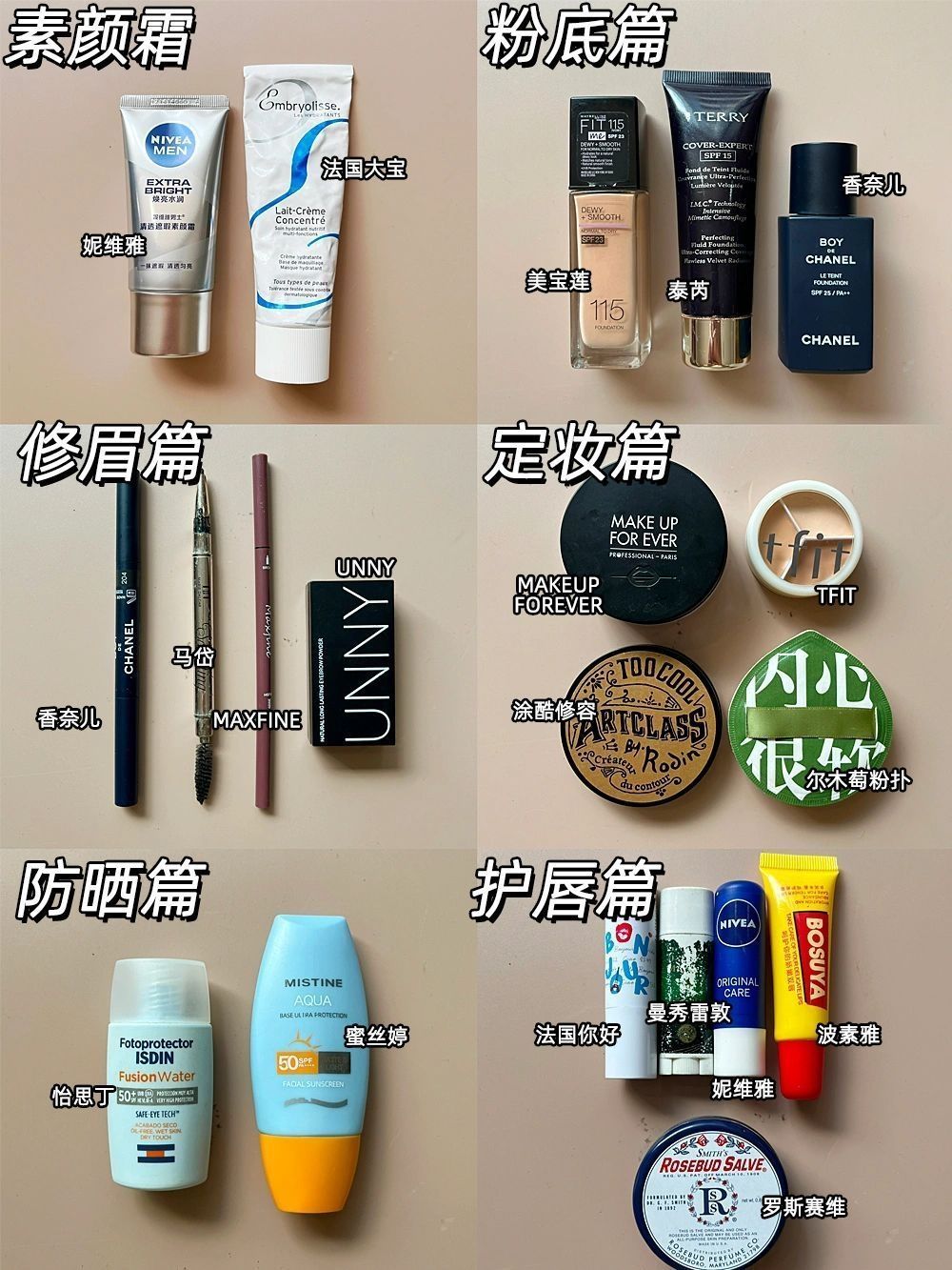 高考结束我这个爱美男生终于可以化妆了!我会用一些简单平价的彩妆,比如素颜霜,粉底液,眉笔之类的,出门还会带上散粉定妆,当然晚上卸妆油和妆后修护也是要用的!分享一下我在用的不错的男士彩妆吧! - 1、 2、法国大宝素颜霜 3、美宝莲经典粉底液 4、泰芮粉底液 5、香奈儿男士粉底 6、香奈儿男士眉笔 7、UNNY眉粉 8、makeup forever散粉 9、涂酷三色修容 10、UNNY眉粉 11、贝...