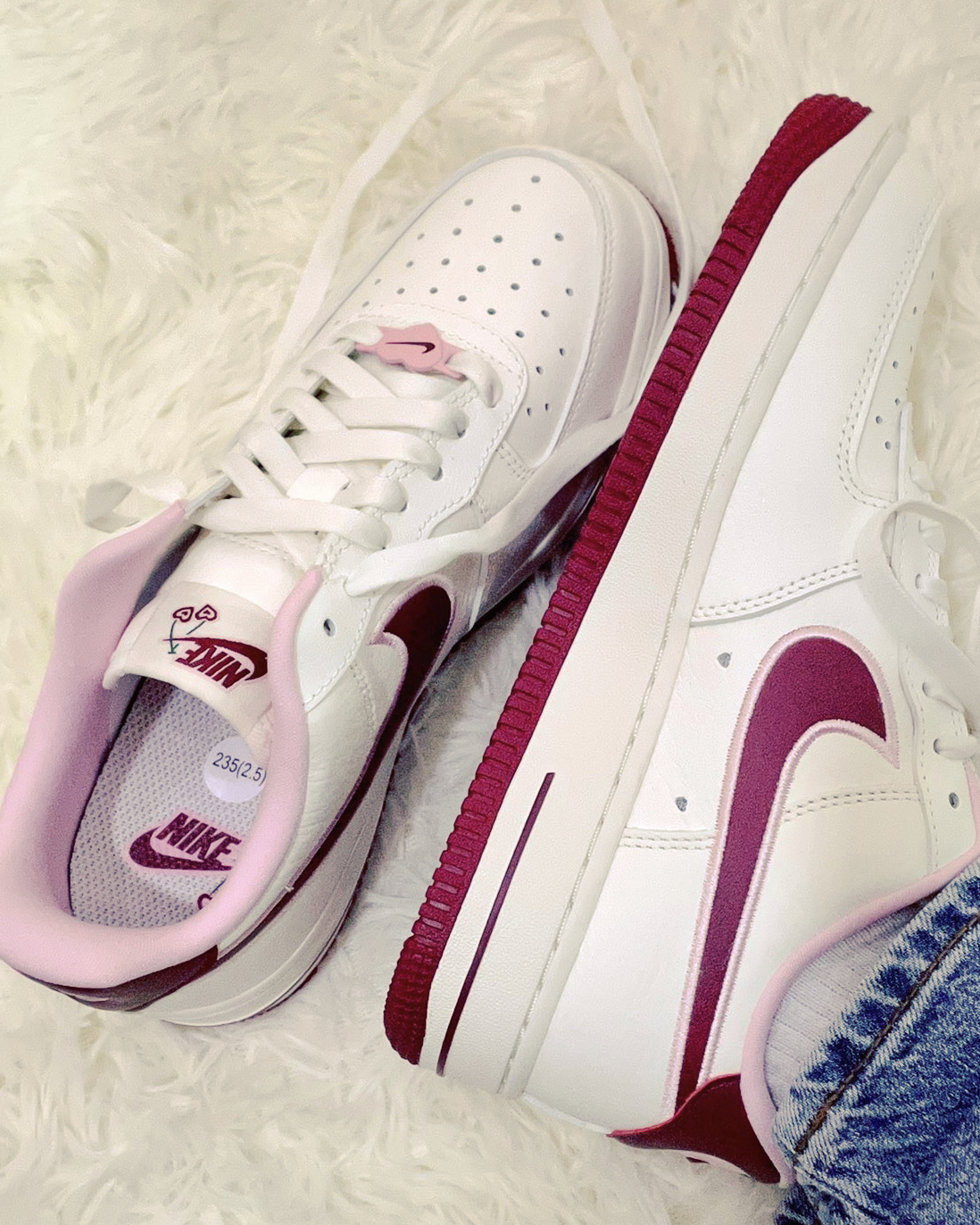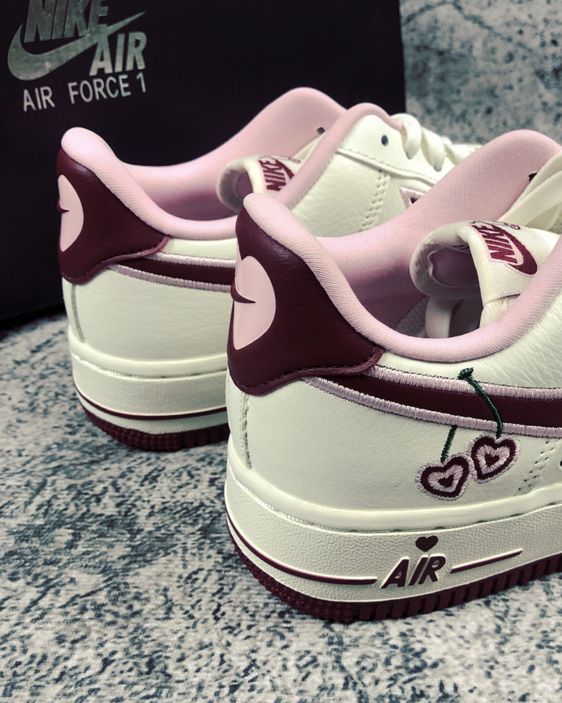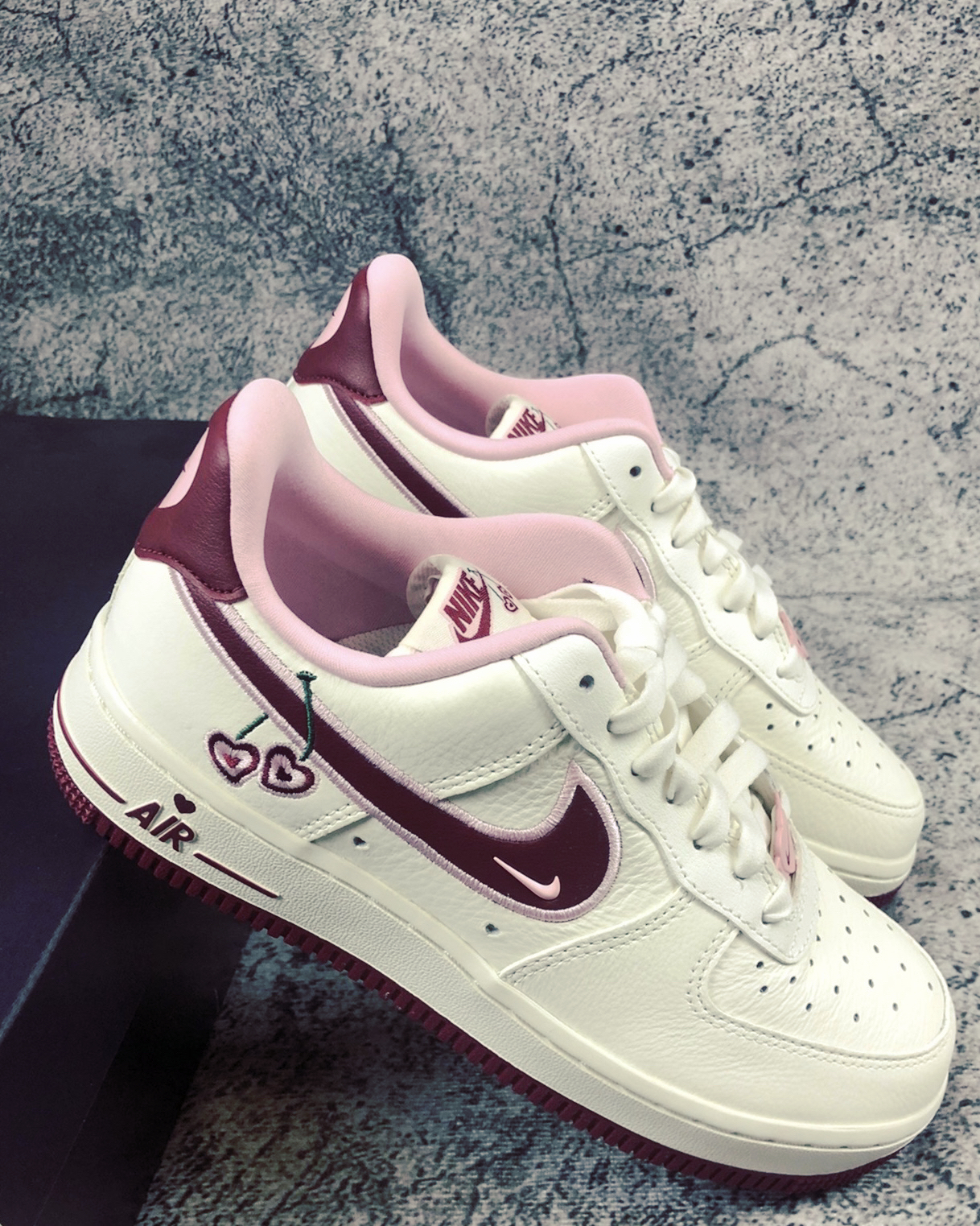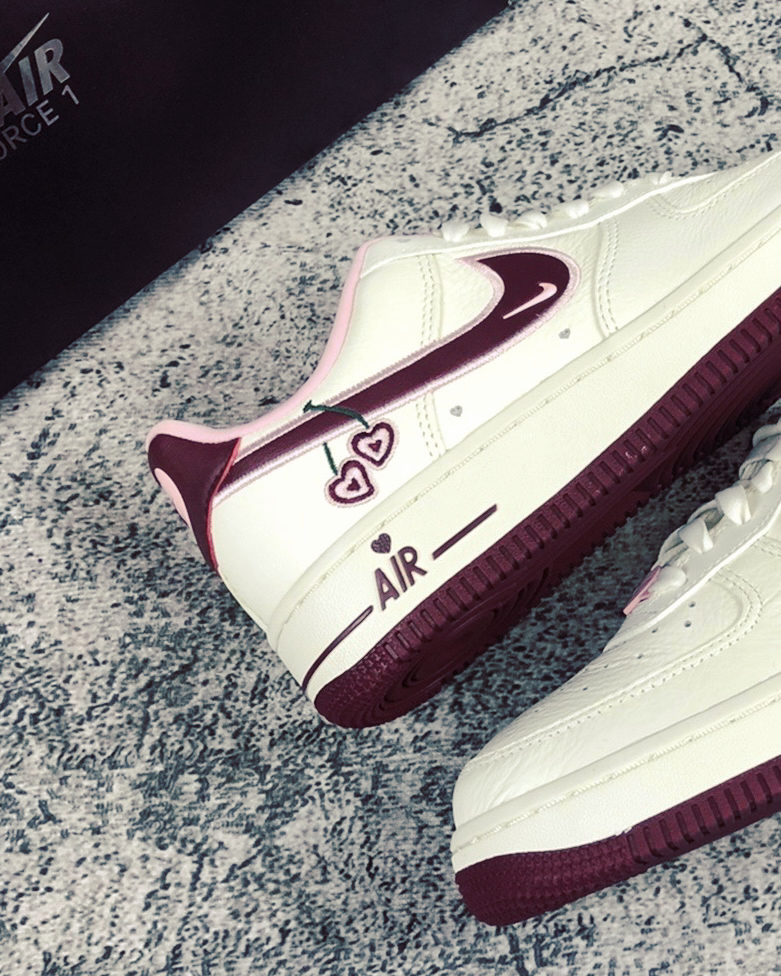 🛒好物名称:nike air force 1 情人节💌 🤔推荐理由: 这双情人节AF1整体采用米白色搭配酒红色和粉色打造,鞋身采用优质柔软的皮革,鞋头鞋后跟点缀爱心,swoosh上点缀刺绣爱心樱桃,整体颜值出色,鞋后跟的爱心,绝对是它的特色! 这双鞋太适合当情侣鞋了!!满满的爱心吖💗