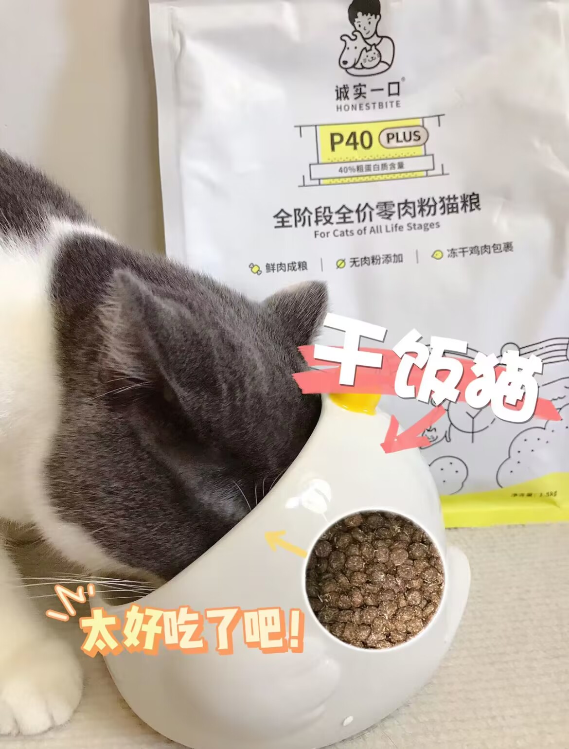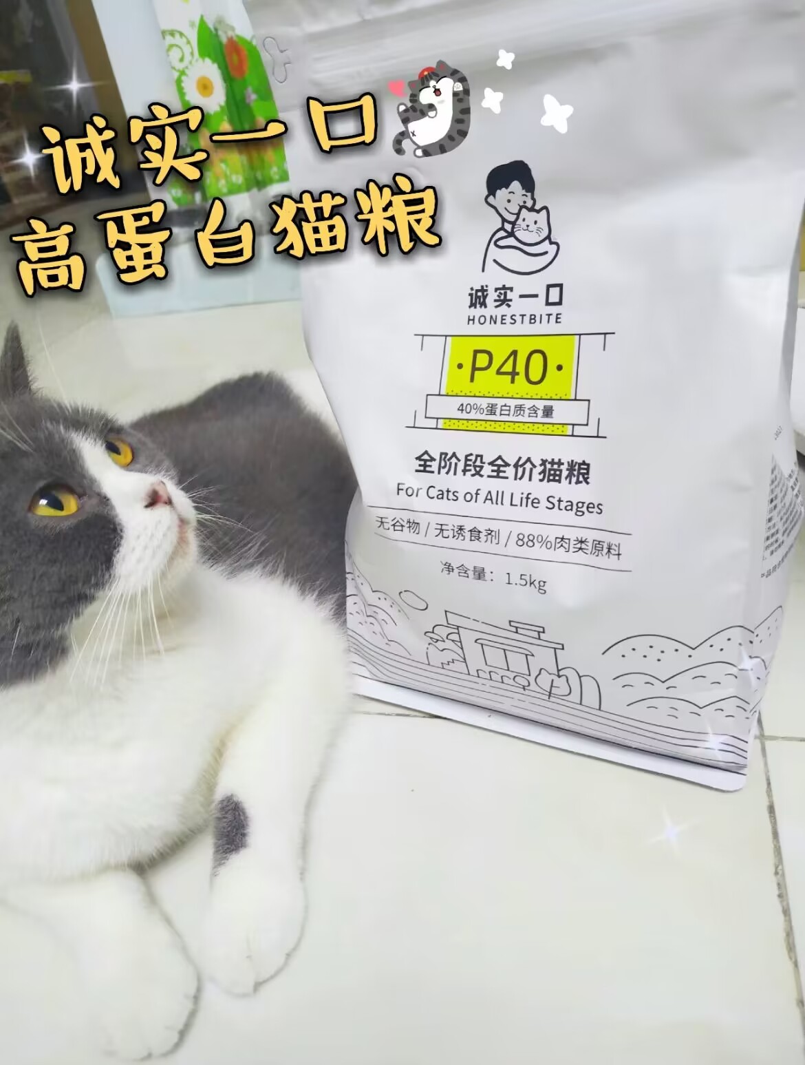 最开始养猫咪&的时候都是在实体店买的进口 粮,我家桃桃并不喜欢,一小碗猫粮一天都吃不完,因为我家猫咪比较挑食,和同龄的猫咪。相比我家很瘦,一直都在咨询养2的小伙伴,怎么 让猫咪增肥,最后大家推荐了这款(诚实一口全 阶段猫粮)我马上在某宝入手了。 首先给大家说一下价格。°亲民价格,但拥有 88%高肉含量,40%高蛋白,诚实一口p40 全期 增肥猫粮做到了成分透明,原材料可追潮,并且表明了供应商,安全...