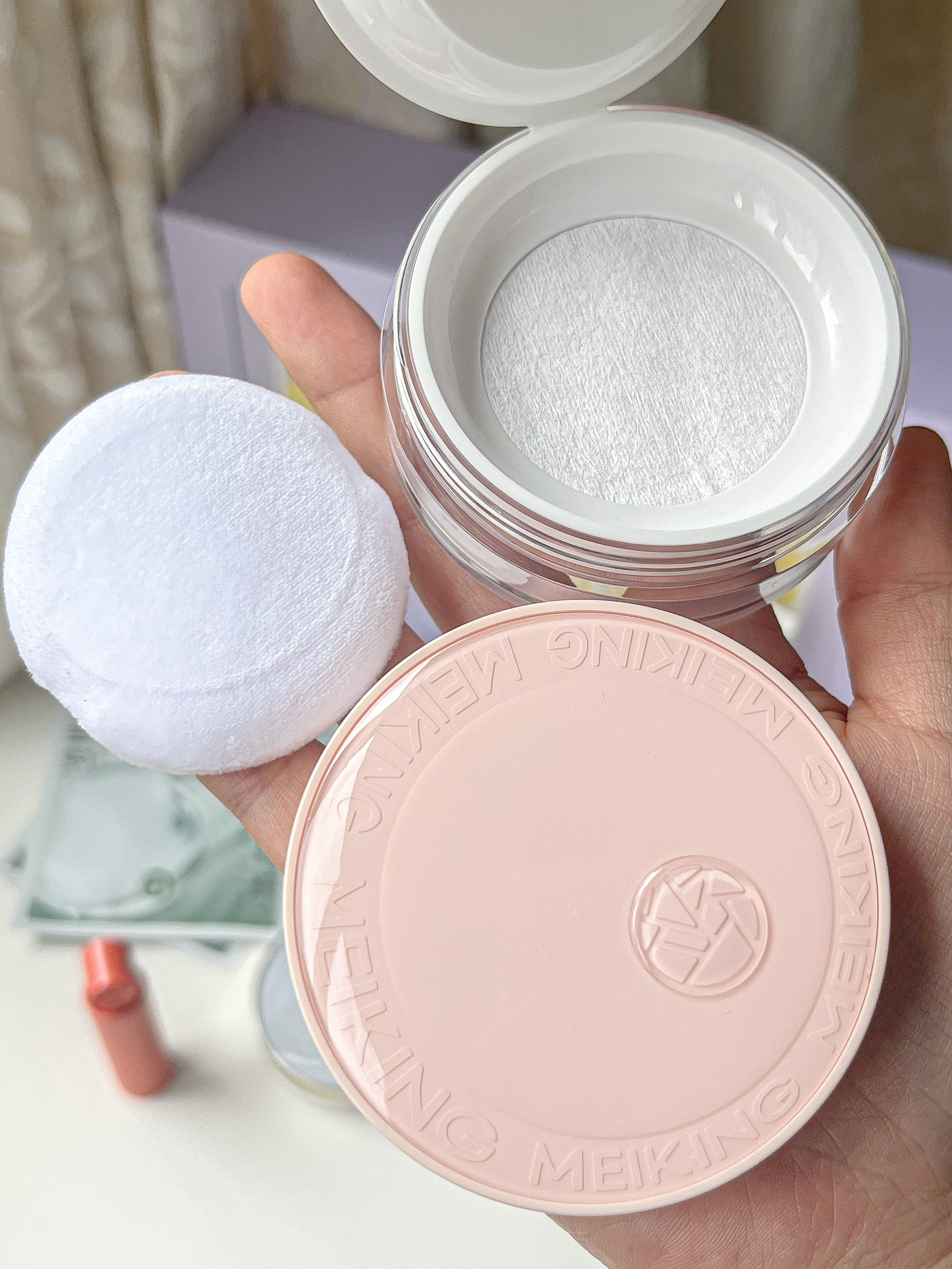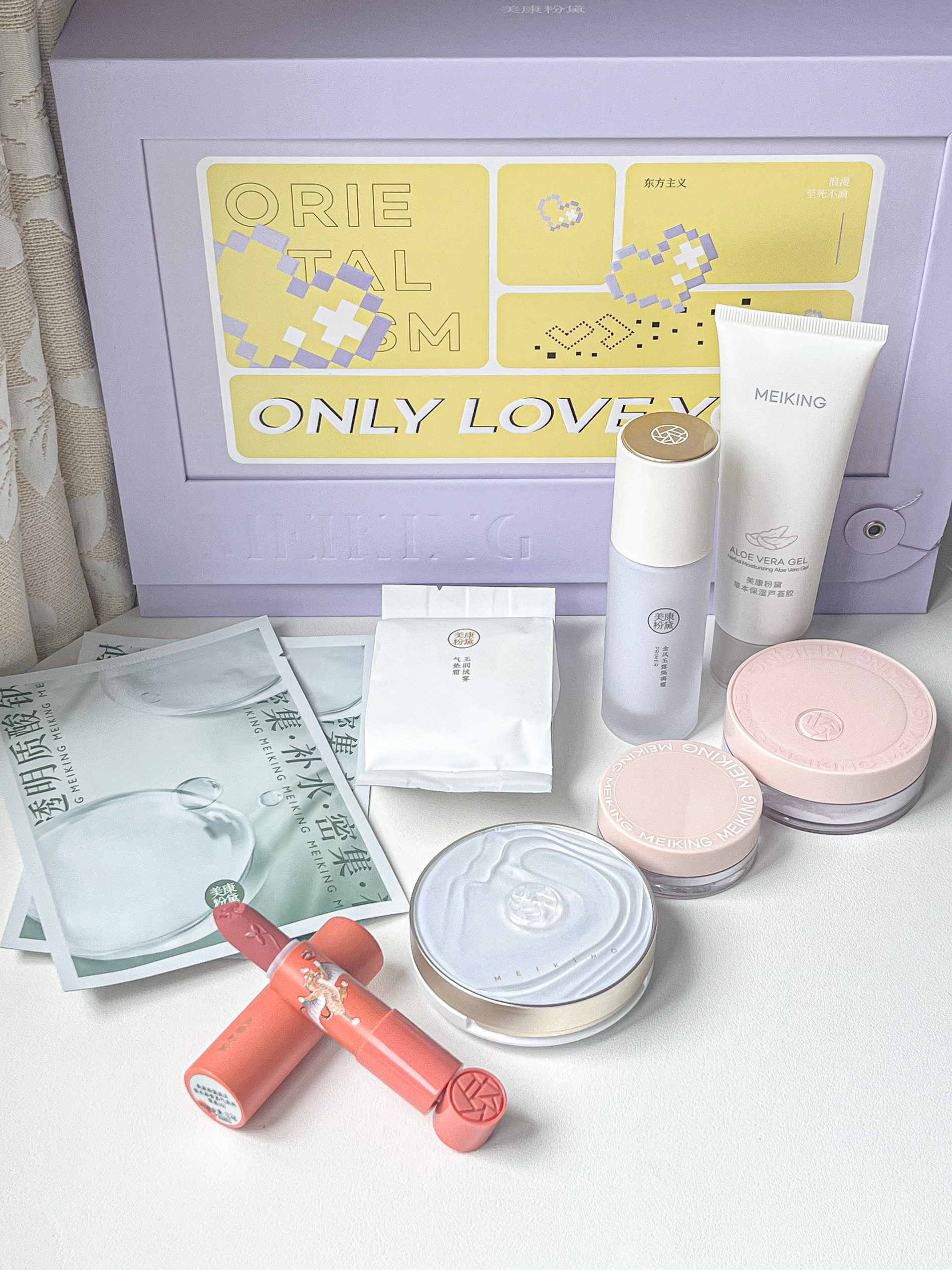 哎哟!美康粉黛这套浪漫投递礼盒🎁 真的绝了啊!🤩 香芋紫信封✉️设计直戳女孩子心巴 一个气垫➕一个替换芯➕一瓶隔离霜➕一个散粉➕一支口红➕芦荟胶~ 这样日常的一套底妆就安排完了✌️ 还送了面膜、旅行✈️套装、散粉小样 出门旅游也能带🥰 气垫我一直都有在用~遮瑕很👍 口红对黄皮很友好~上脸很显气色捏