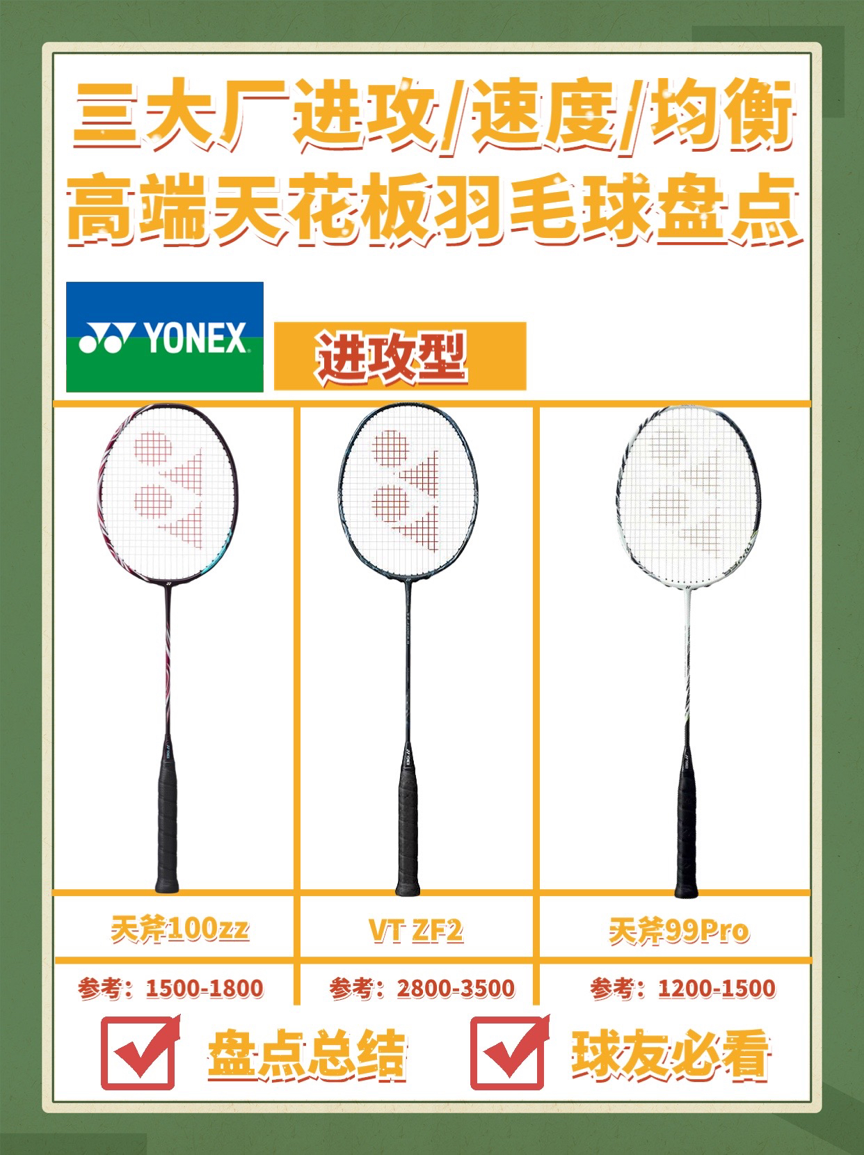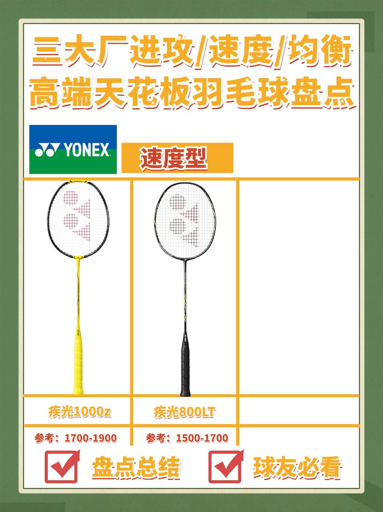 本篇笔记关联了YONEX/尤尼克斯 疾光系列 疾光NF-800 LT 超轻耐用 增加挥速 音效 速度型 耐打 防守 进攻 全碳素 羽毛球拍 黑冰蓝、YONEX/尤尼克斯 天斧系列 天斧99PRO AX99PRO 明星款 进攻型 耐打 控球 连钉设计 防守 默认穿线 杆硬 拍头重 专业级 耐用精准 全碳素 羽毛球拍 白虎纹、VICTOR/威克多 神速系列 神速100X ARS-100X 专业级 耐打 进攻 速度型 增加挥速 全碳素 羽毛球拍 石板灰等商品,为用户提供真实的使用体验和购买参考。