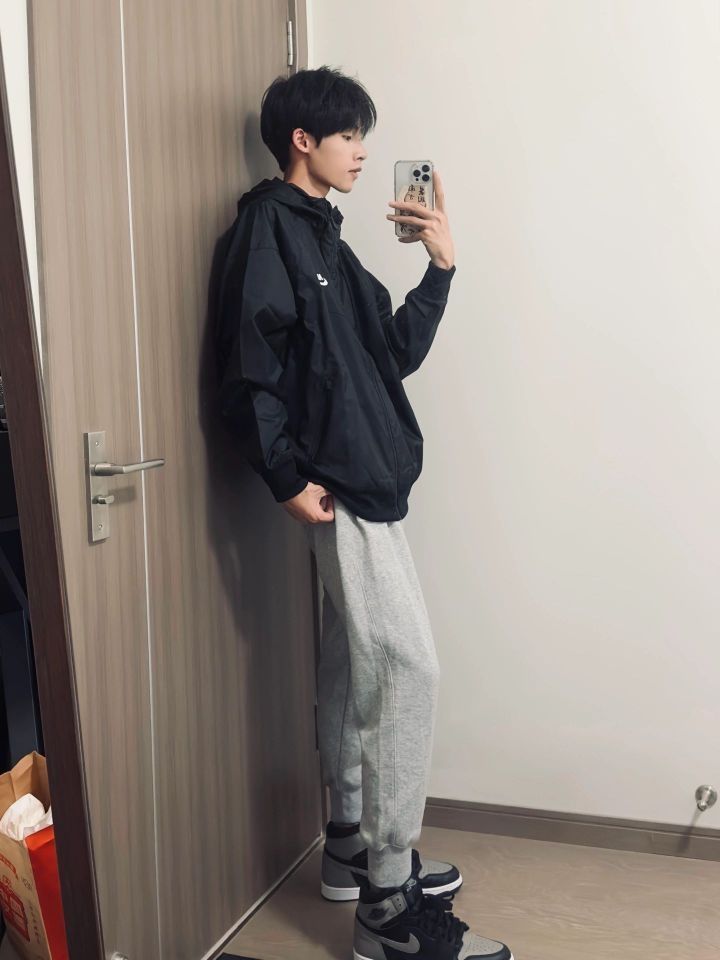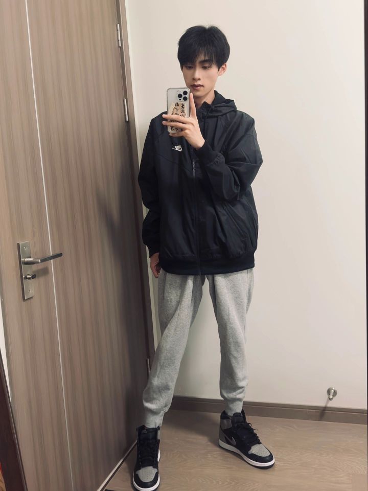 🌈今日上身一件夹克外套🥷 🌈纯黑色经典配色酷酷的 版型宽松 上身效果很不错 夹克非常适合秋季🍃内搭一件T恤就可以出门啦 🌈胸前的logo贴布很有辨识度🌟整体简约的设计非常好搭配 🙋🏻♂️无论户外运动⛰️还是日常通勤穿它就可以啦‼️ 🌈裤子搭配一条宽松收脚运动👖 (图片来自博主:陈朝乐)