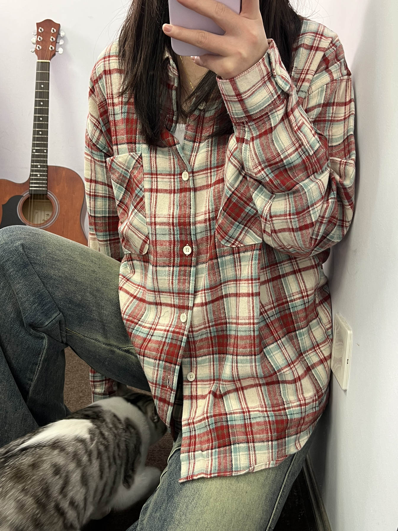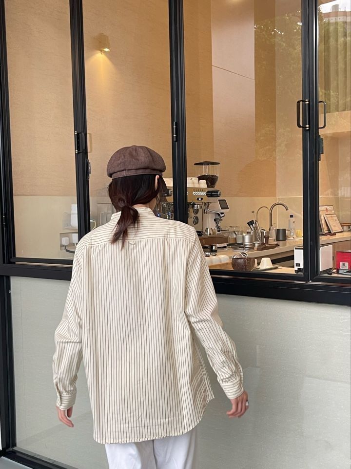 穿搭公式:条纹衬衫+贝雷帽+牛仔裤 这款以树系条纹为主要元素的衬衫,很富有文艺风,所以可以搭配浅色系的裤子和一个贝雷帽,有一种知性女青年的感觉 这款衬衫也比较长,刚好可以遮住三角区,很适合梨形姐妹的身材穿搭