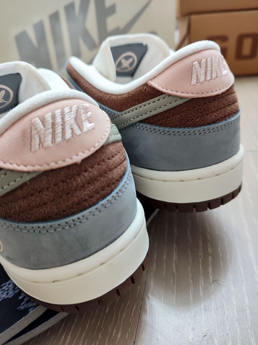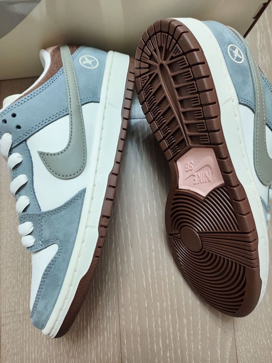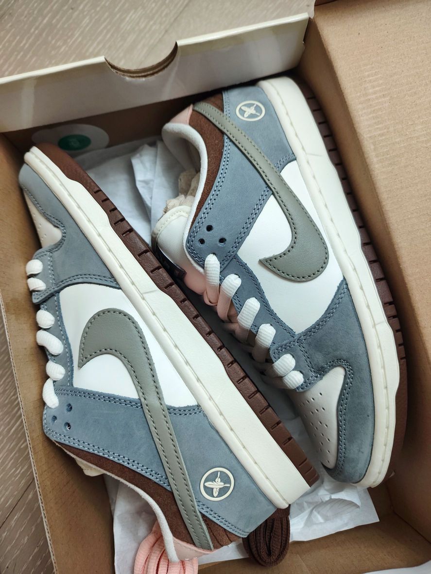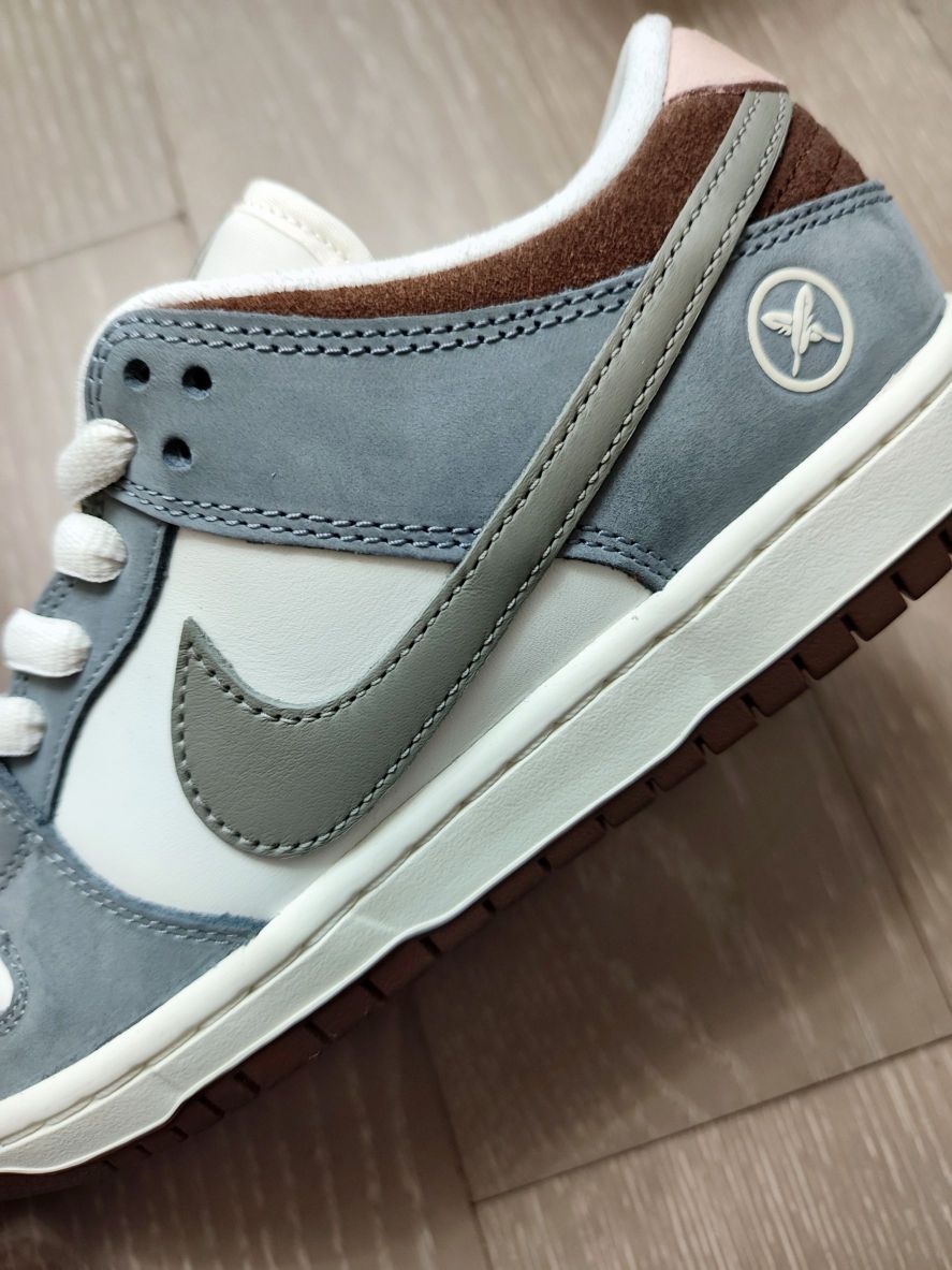 📸这款联名Dunk采用优质皮革,灰色绒面皮革,和网眼布材料构成。设计主调有灰色和白色,搭配棕粉色,整体简约又高级,视角带来不俗的层次感。 📸鞋后跟和鞋舌内衬刺绣着代表着 Y.H. 的交叉羽毛元素,与鞋垫印花的羽毛元素相互呼应,彰显着联名身份。 📸这双联名Dunk还额外赠送了两幅鞋带,采用的也是特殊宝藏,小细节很多,挺不错的一双鞋,值得购入。