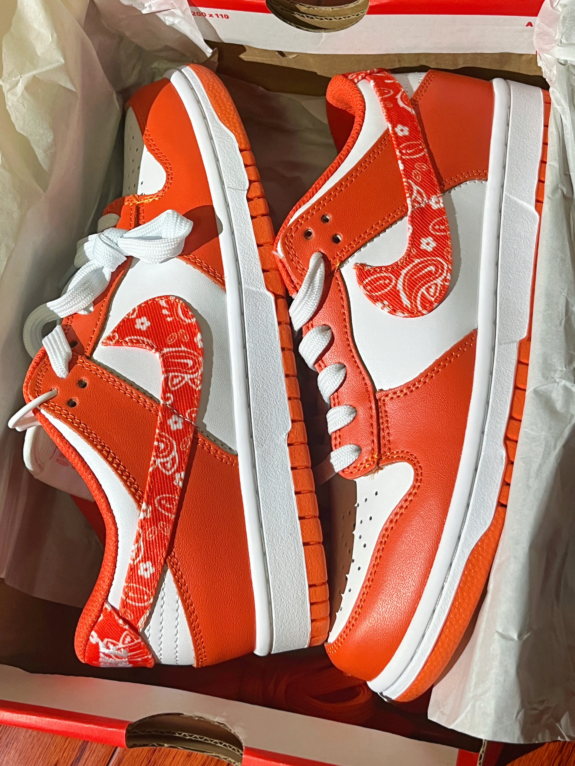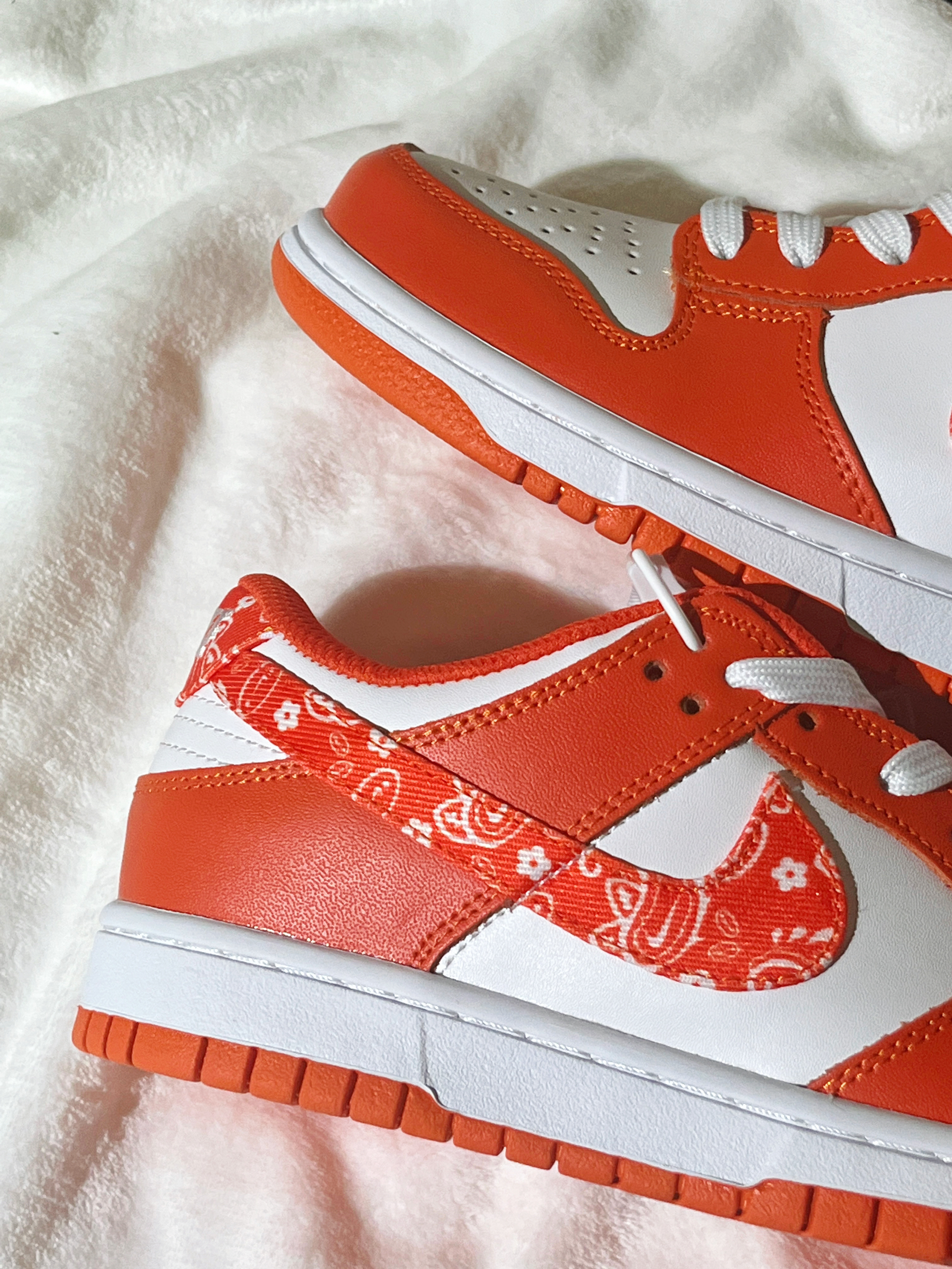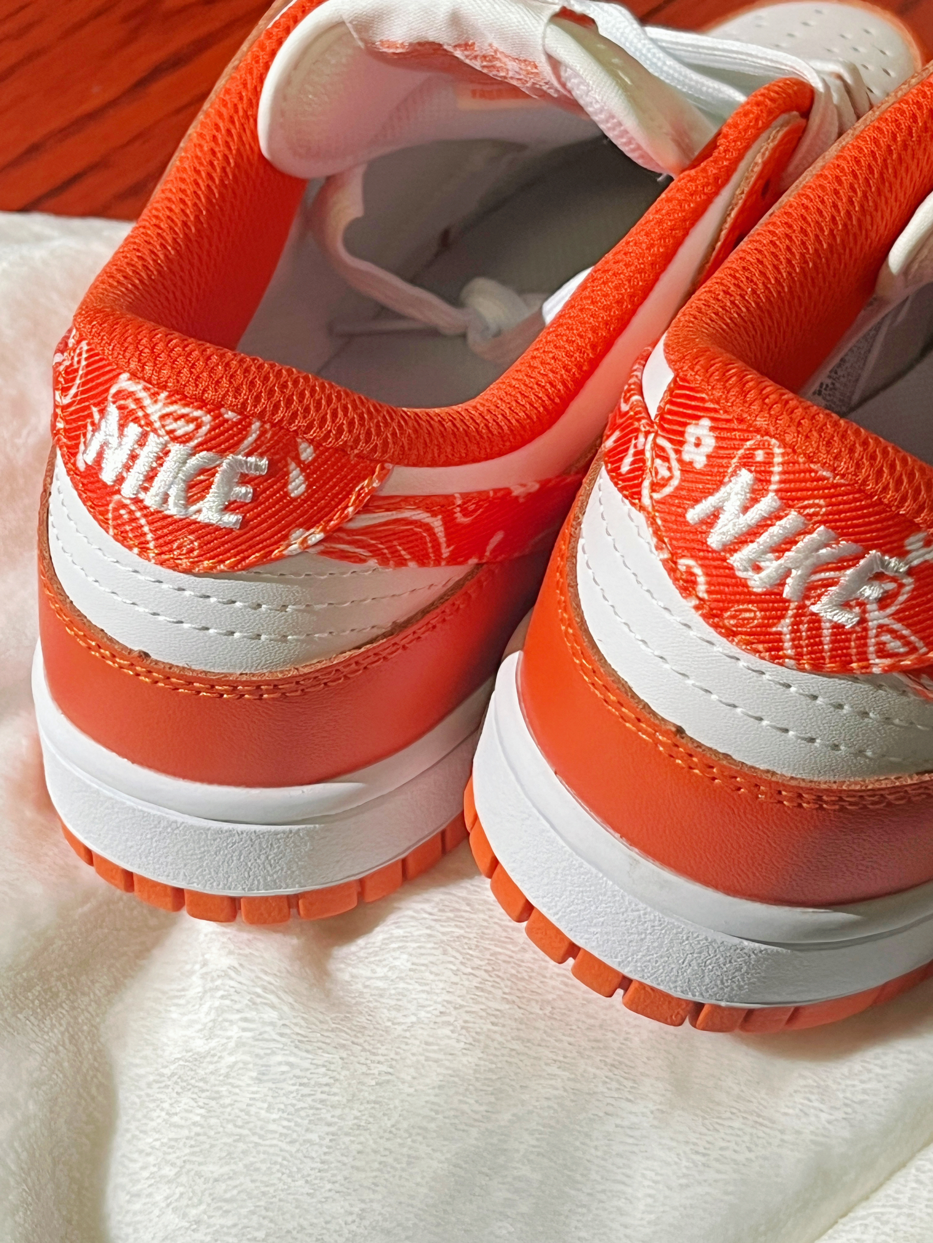 这双鞋子依旧是经典款dunk鞋型,都是腰果花系列的款式,这个橙色也是深受大家喜爱,它的不同之处是鞋带是白色的😍 另外鞋子是皮革材质,但是钩子腰果花的材质是厚的布艺的,后跟处是刺绣标记👌