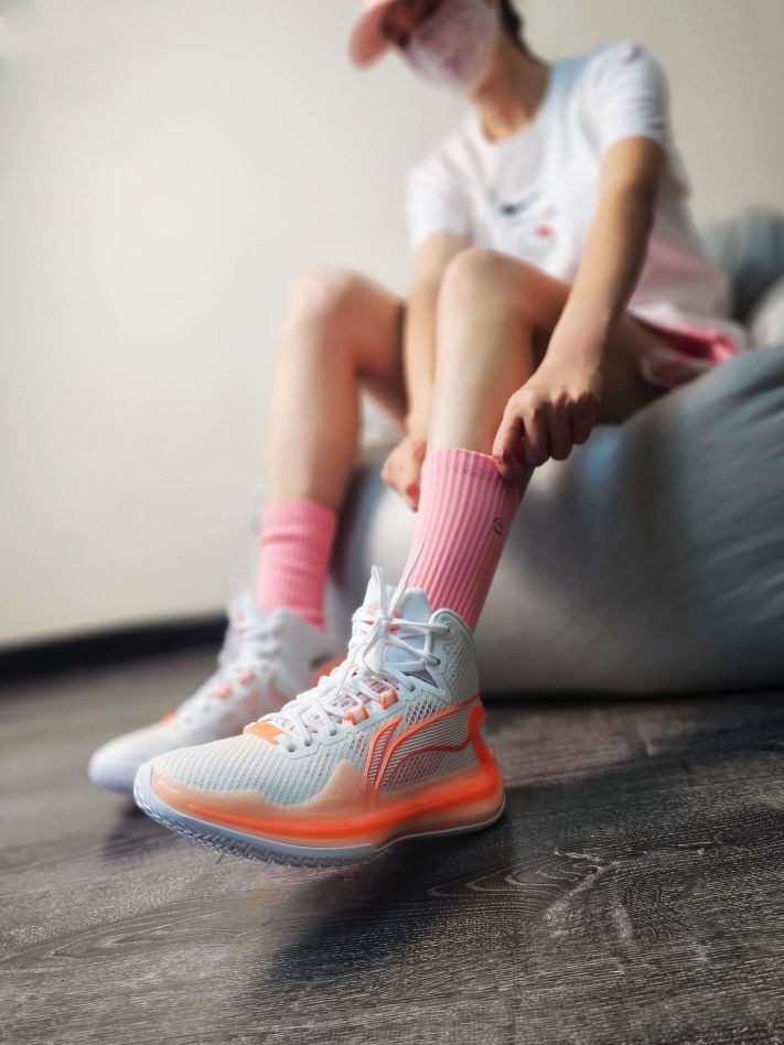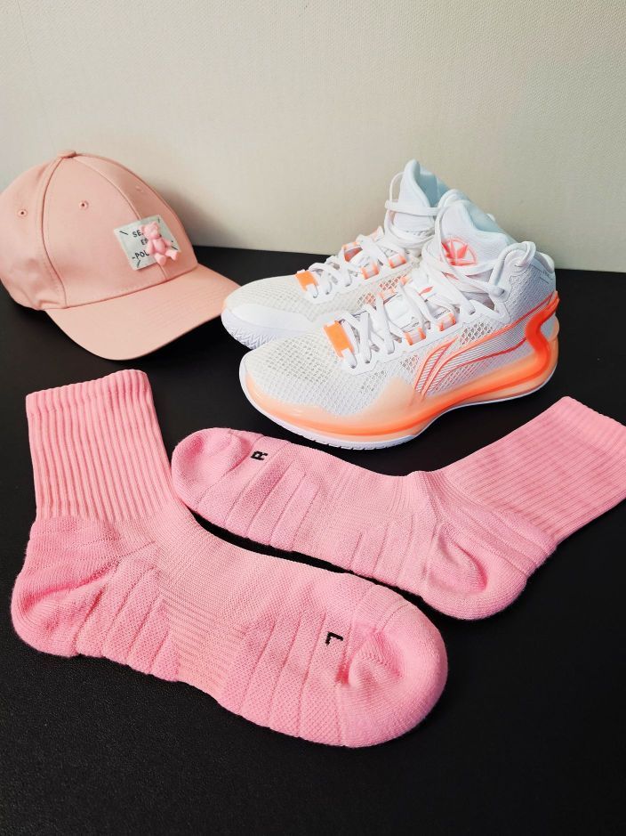 🛒好物名称:李宁 利刃4 白橙~ 🤔推荐理由:粉色球鞋配上粉色袜袜,这就是猛男的最爱吧?! 利刃4的鞋型虽然是高帮,但看上去很犀利,确实有种利刃的感觉,整体速度感很强,全掌䨻保证了缓震脚感,其他方面对比利刃3也有了全面的提升~