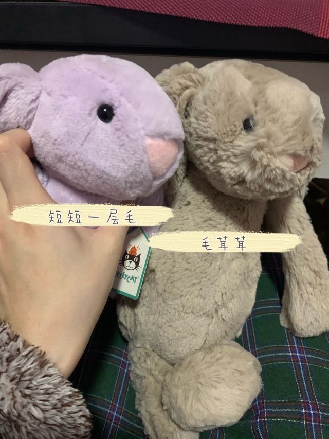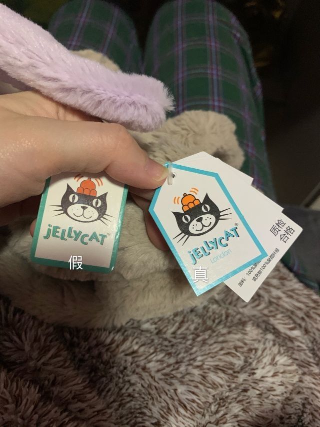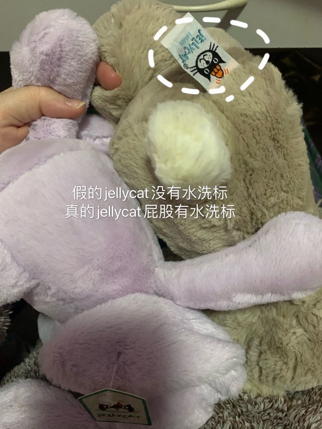 之前夹娃娃抓到了一只jellycat兔子,因为是娃娃机里面的,所以对真假存疑 最近收到了一只旗舰店购入的jellycat,这个时候就确认原来的是假jellycat了 刚好做一个真假对比🤣 1️⃣正品的标签🏷有4张不同语言的标 2️⃣正品的兔几屁股有水洗标,并且尾巴是白色的🐇假货的尾巴是和身体一个色的 (或许其他颜色的尾巴不一样,主要看水洗标) 3️⃣正品摸起来毛茸茸超级软!并且毛比较长,快盖住眼睛...