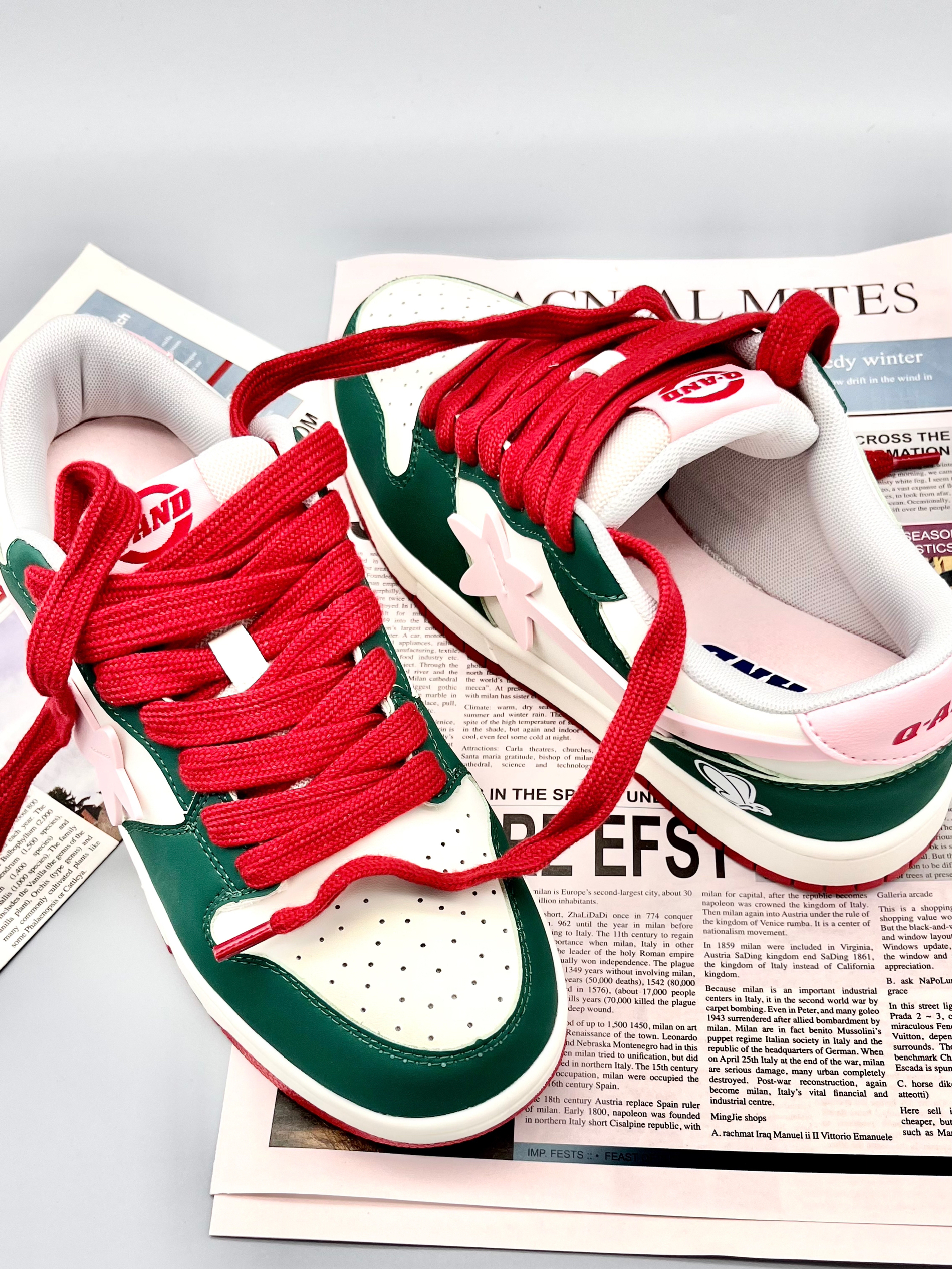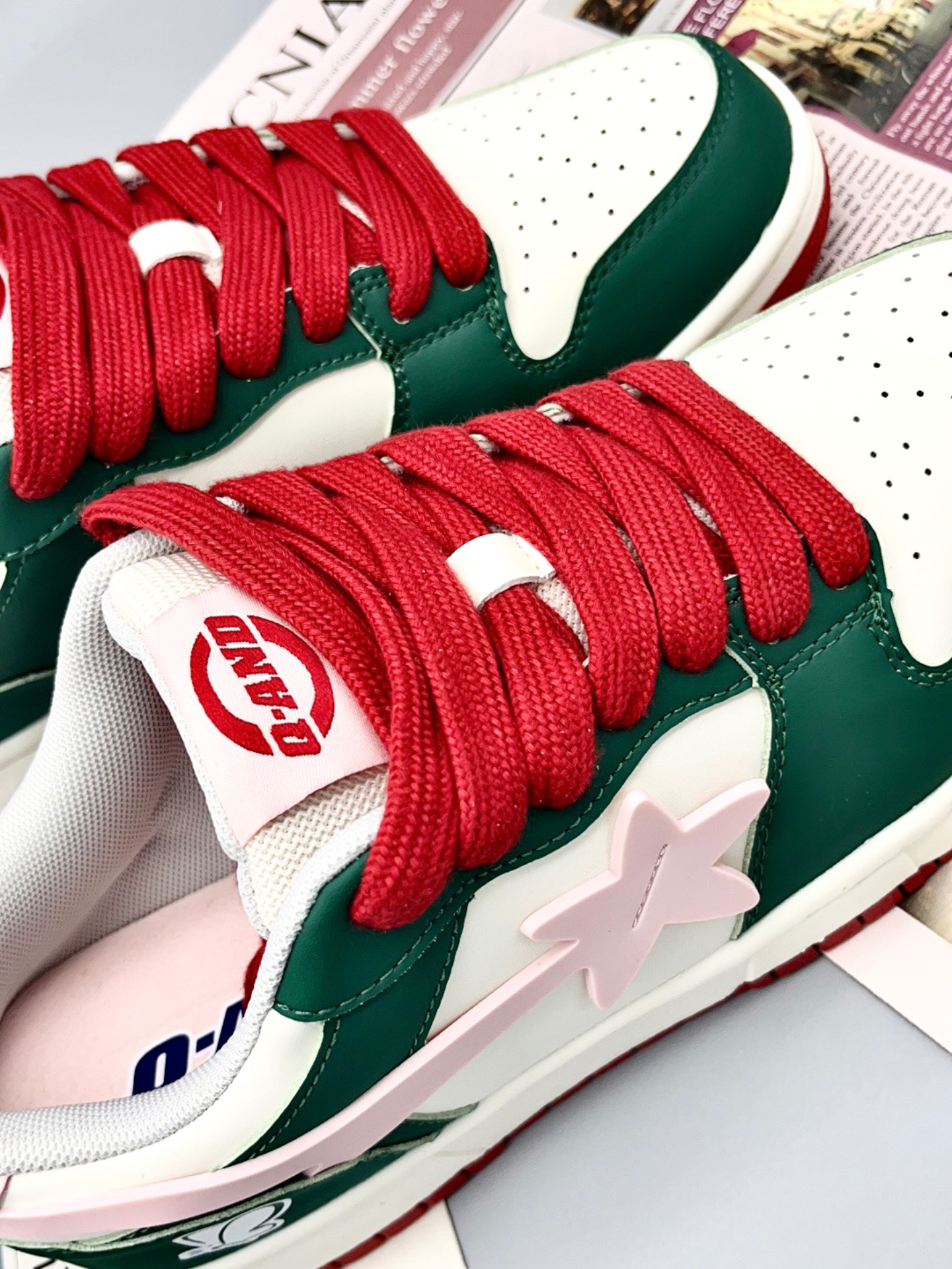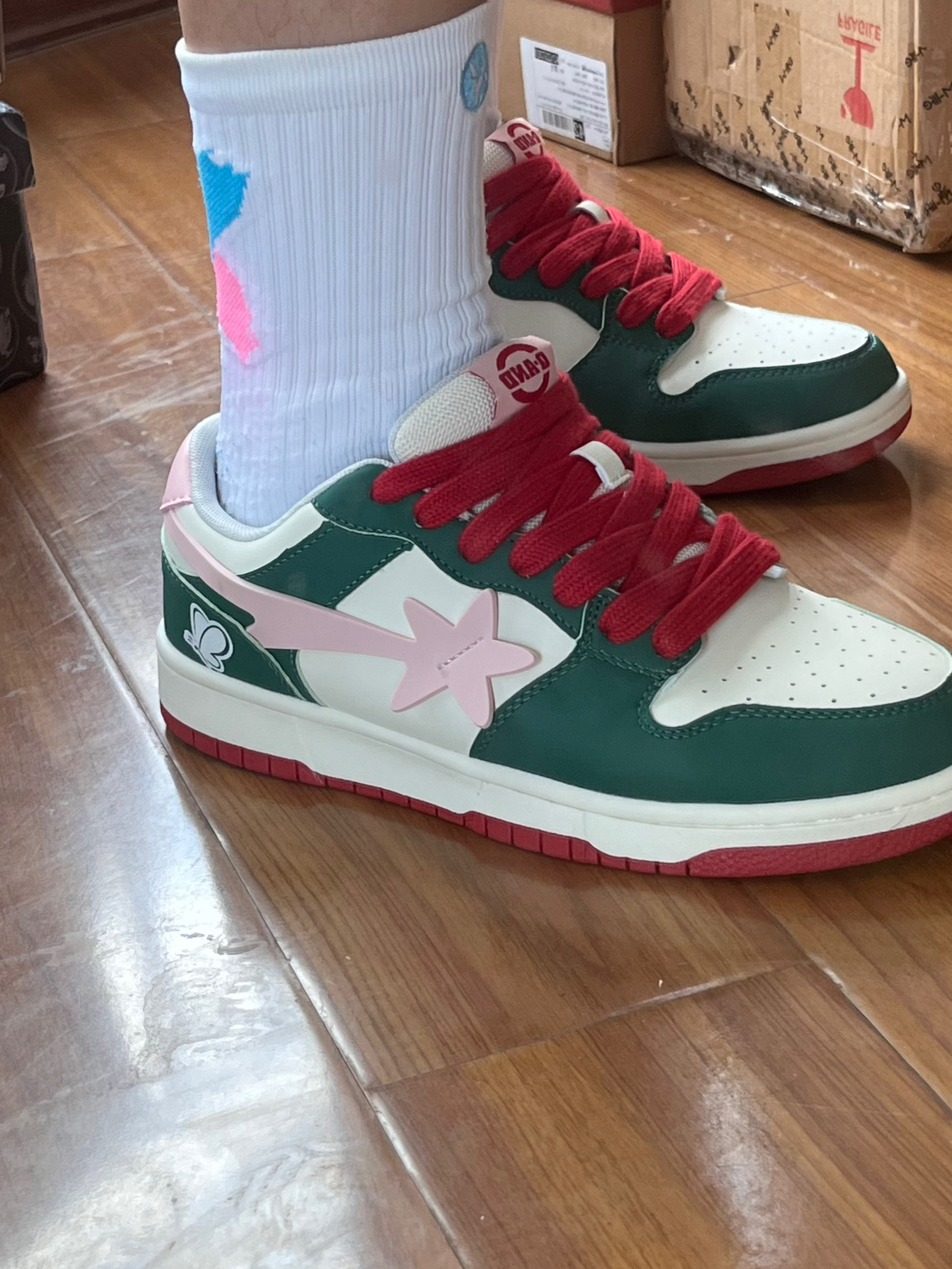 💭💭大家好~这里是超酷的啊呜 今天给大家介绍一双来自Q-AND的板鞋 红配绿的撞色非常大胆的设计 鞋边粉色点缀+蝴蝶图案🦋 使得这双鞋子非常耀眼 脚感舒适价格平价💯 无论是春夏搭配短裤、裙子 还是秋冬搭配牛仔裤、长裤都是不错的选择 🍃🍃男女同款,正常尺码不偏码~