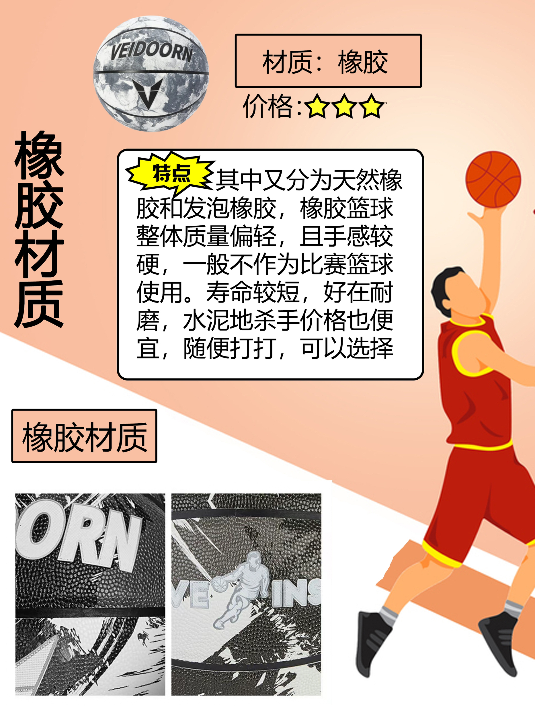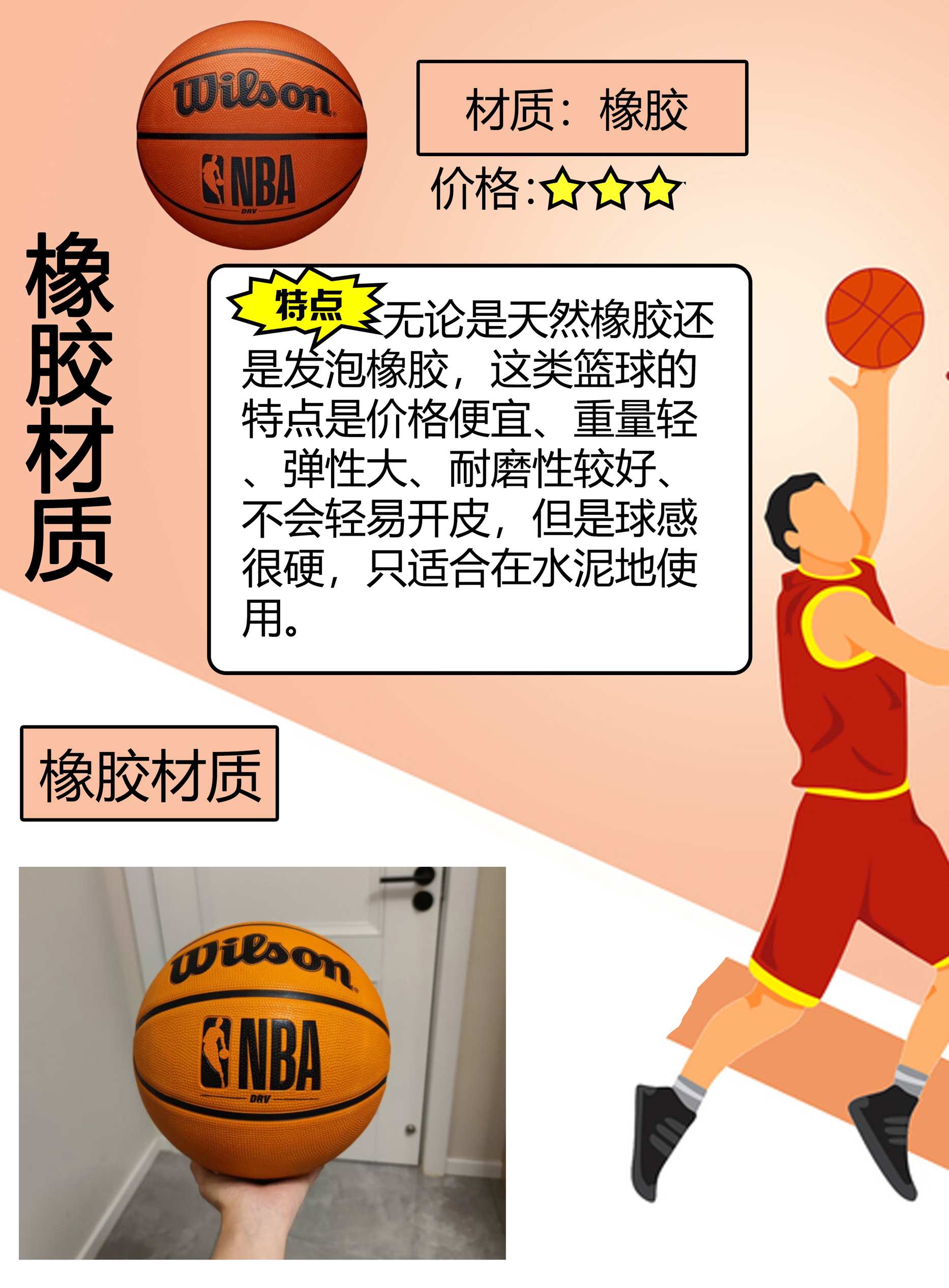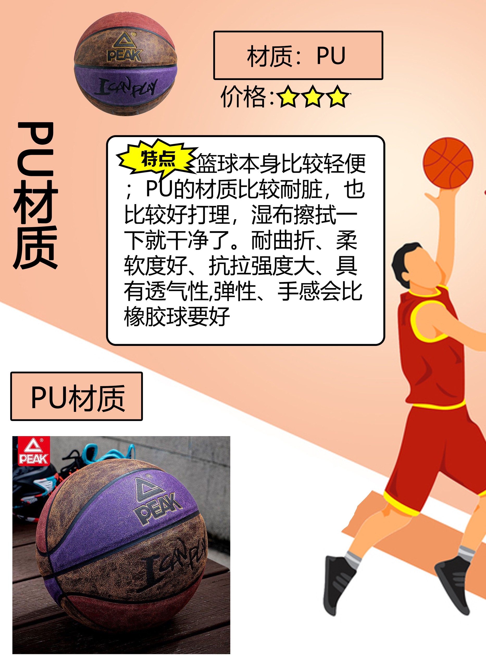 目前主流的篮球一般都是橡胶、PU和牛皮材质,不同的材质手感、使用寿命都不一样,比如发泡橡胶(中胎)的回弹更稳定、丁基内胆比较耐打,PU表皮性价比高、牛皮球手感最好。不管怎么选你能通过这篇分享大概有个了解,也为大家介绍了不同材质篮球的特点: 真牛皮: 一颗球从又滑又硬经过一段磨合之后,逐渐成为鹿皮一般的质感。拿在手里格外的舒服,运得很稳,与手也很亲和。 击地时,会有球胆的共鸣音喻喻的略尖锐,很好听...