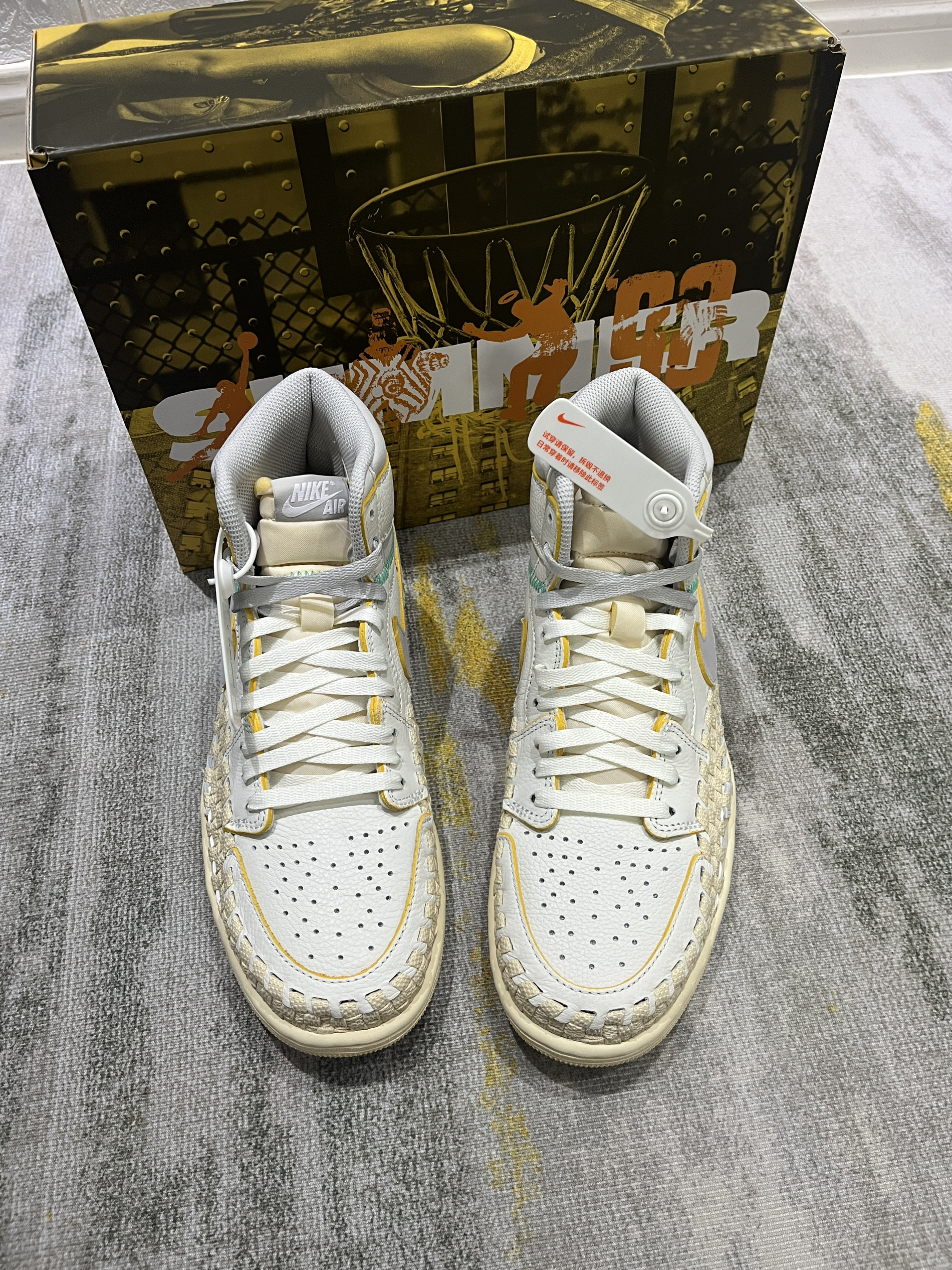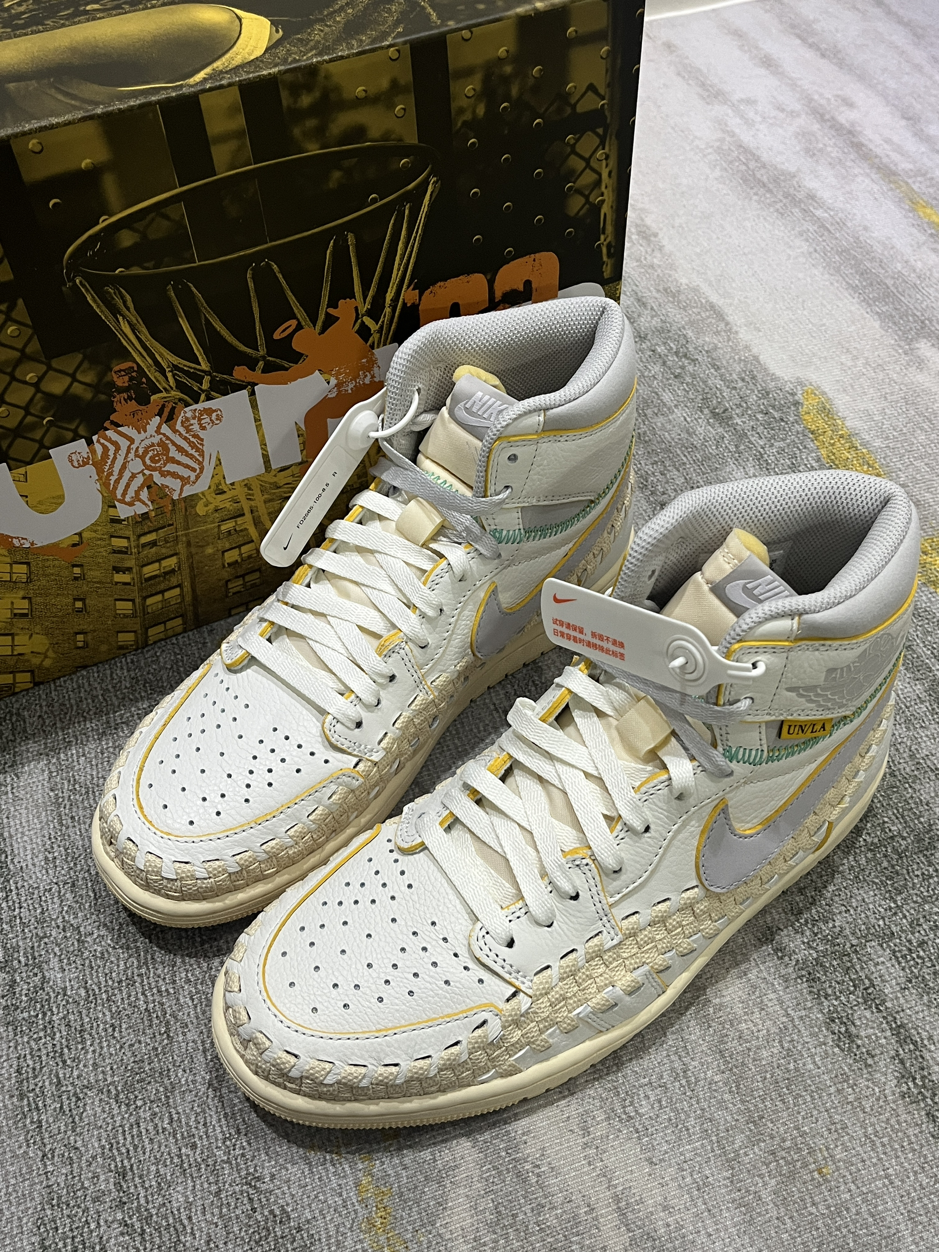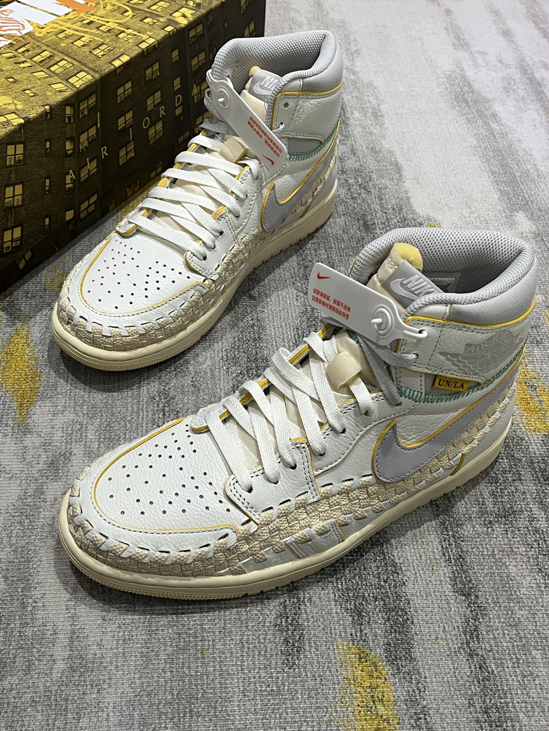 这双鞋值得收藏! 三方联名诚意还是到位了 鞋盒设计感很不错 鞋带也是渐变色 整体质感非常不错,面料也是皮革带编织设计 确实很nice