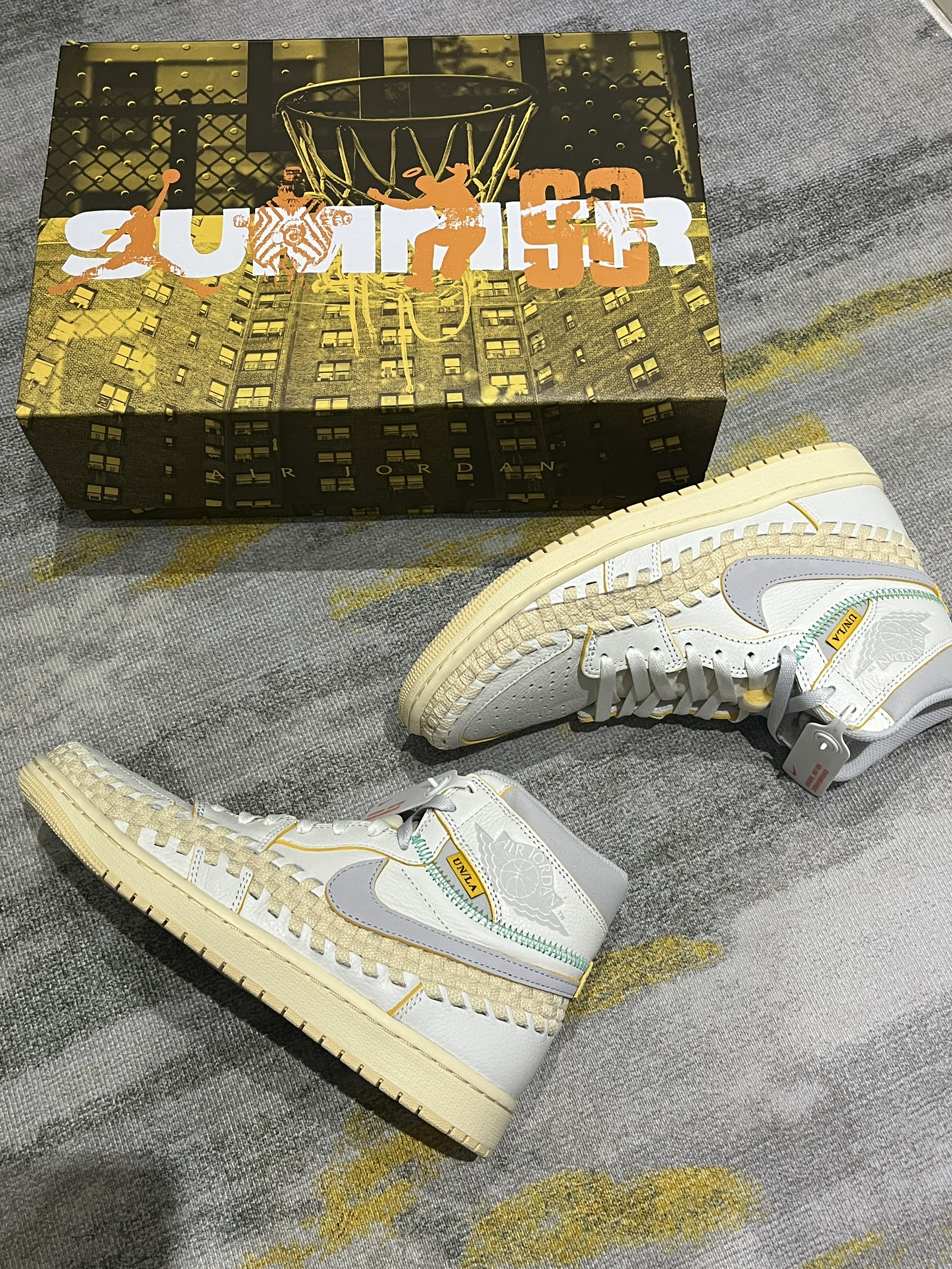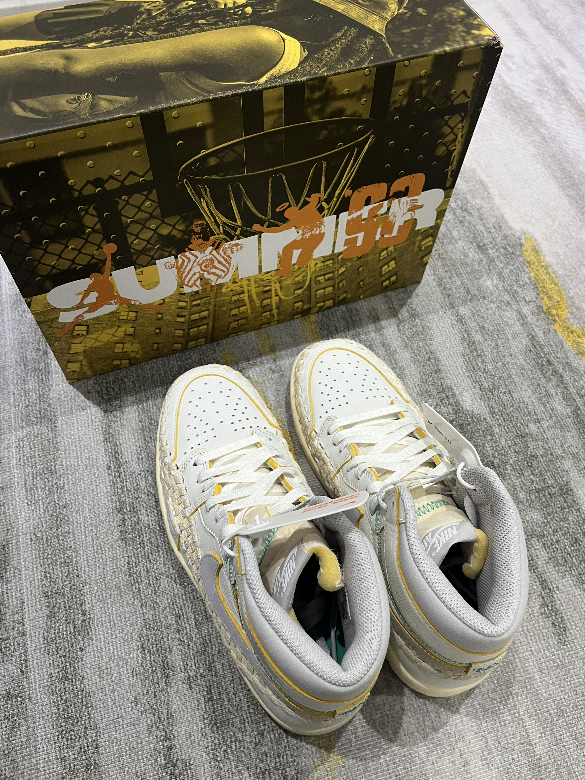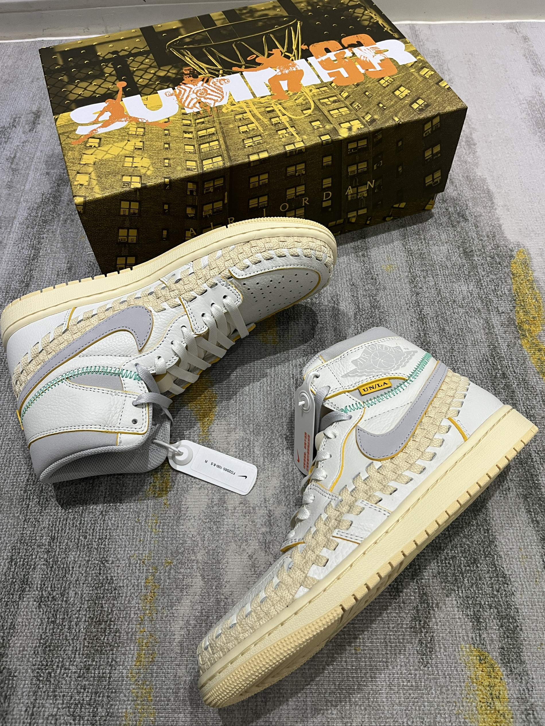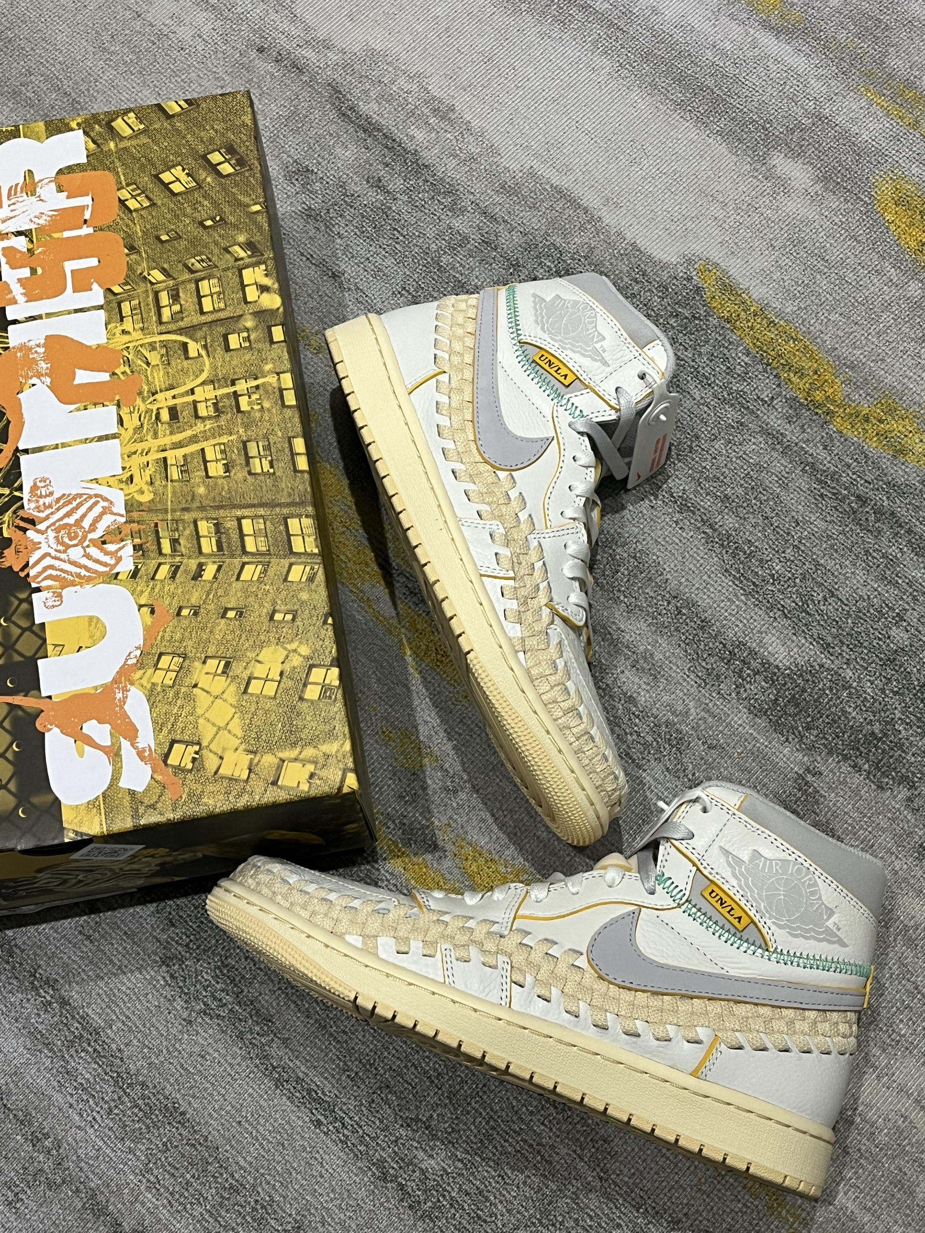这双鞋值得收藏! 三方联名诚意还是到位了 鞋盒设计感很不错 鞋带也是渐变色 整体质感非常不错,面料也是皮革带编织设计 确实很nice
